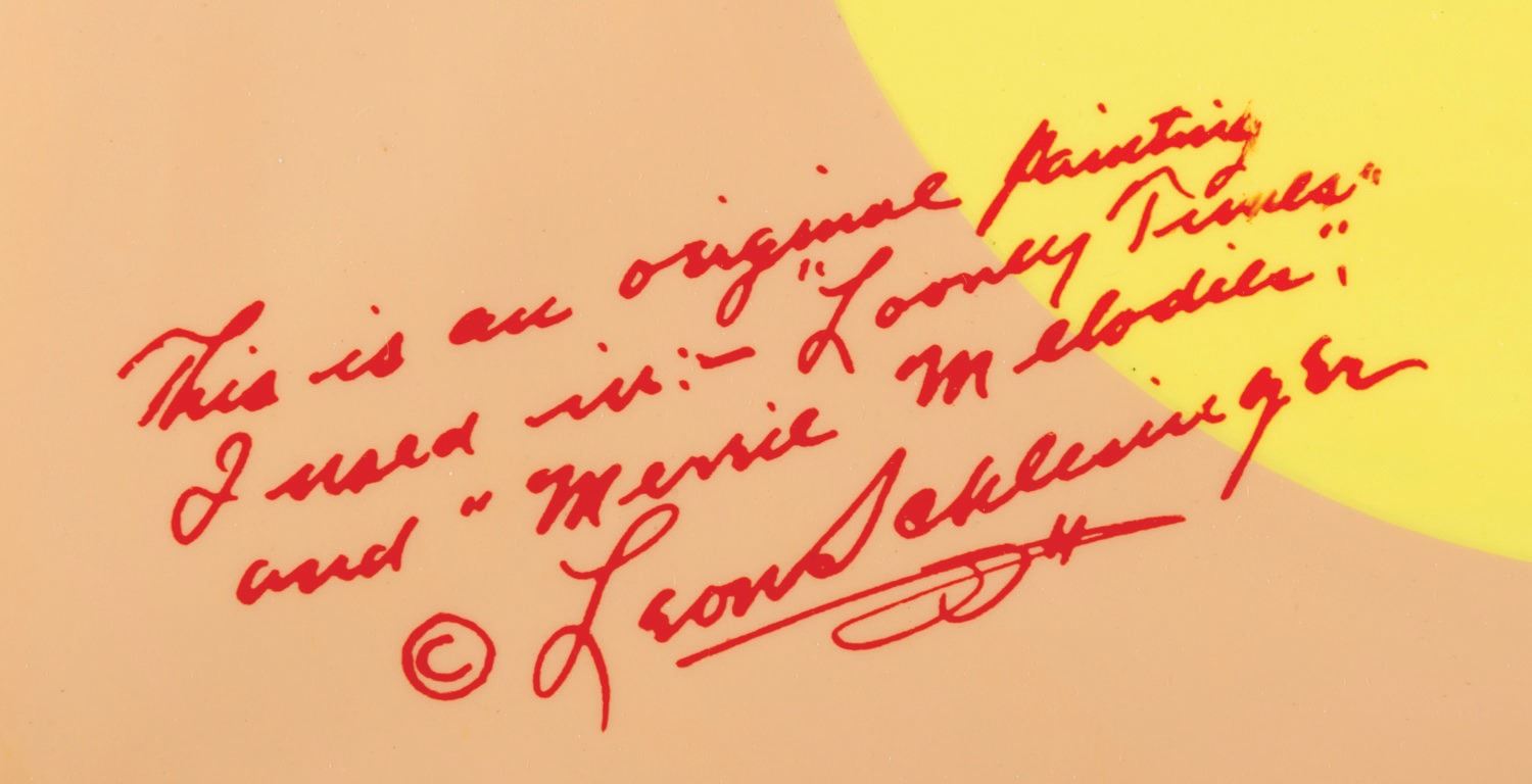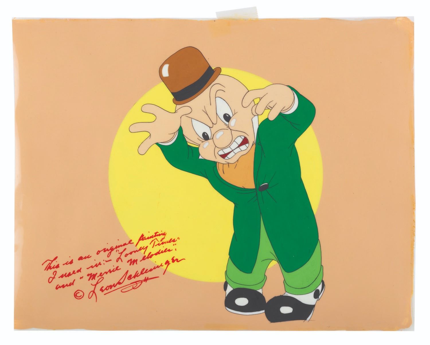 (Schlesinger, 1940) An original production cel from the Merrie Melodies short “Elmer’s Candid Camera,” which starred Elmer Fudd and a prototype Bugs Bunny one year before his official debut. The cel has been trimmed to 9” x 11.5” with a character image size of 8” x 5.75” and is in very good condition. The cel was marketed for sale by Warner Bros and features a screen-printed facsimile Leon Schlesinger signature, and has light warping from age.