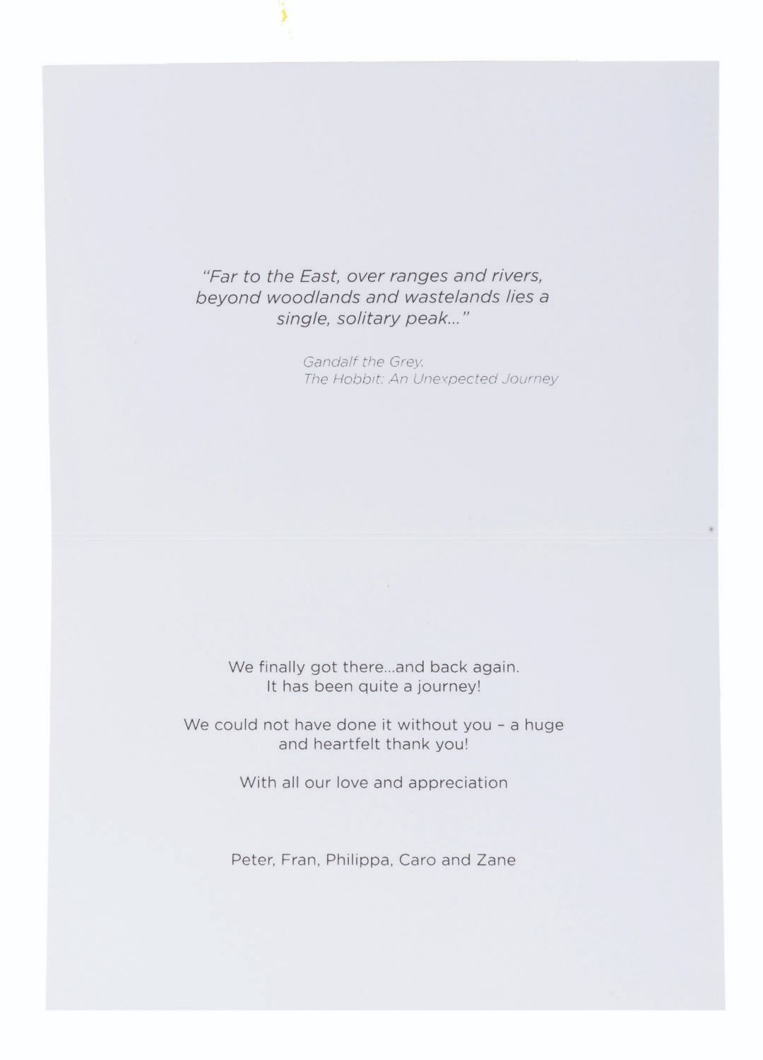 (Warner Bros., 2012-2014) An Elven Warrior maquette and a thank you card from the production of The Hobbit trilogy. The maquette was used to create a gold statue prop, as part of the treasure hidden at the Dwarves Kingdom under the Mountain. Measuring 12.25” x 4” x 3.75” deep, the resin maquette is in good production-used condition with light scratches, chips, and scuffs. The card measures 4” x 6” and is in fine condition.