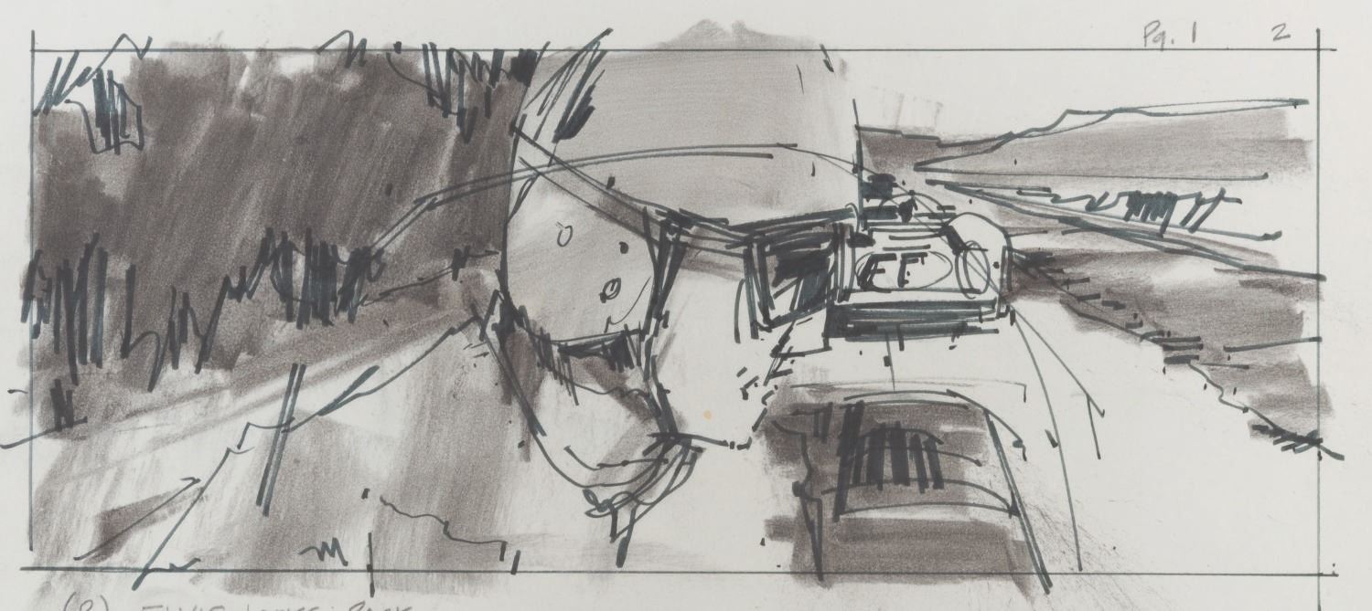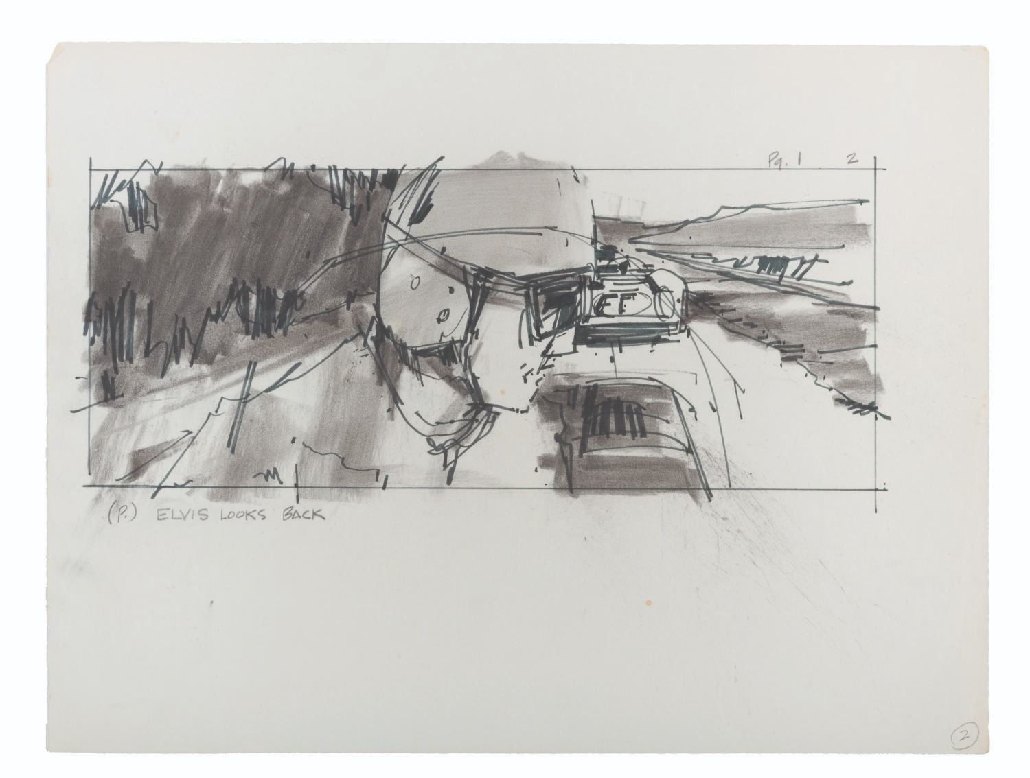 (MGM, 1968) An original hand-drawn storyboard for the film “Speedway” starring Elvis Presley and Nancy Sinatra. Written in pencil on the storyboard is the direction “Elvis looks back.” With an image size of 4.5” x 10” on 9” x 12” vellum, the graphite and marker storyboard displays in very good condition with creases, light spotting from age, and edge wear and tears.