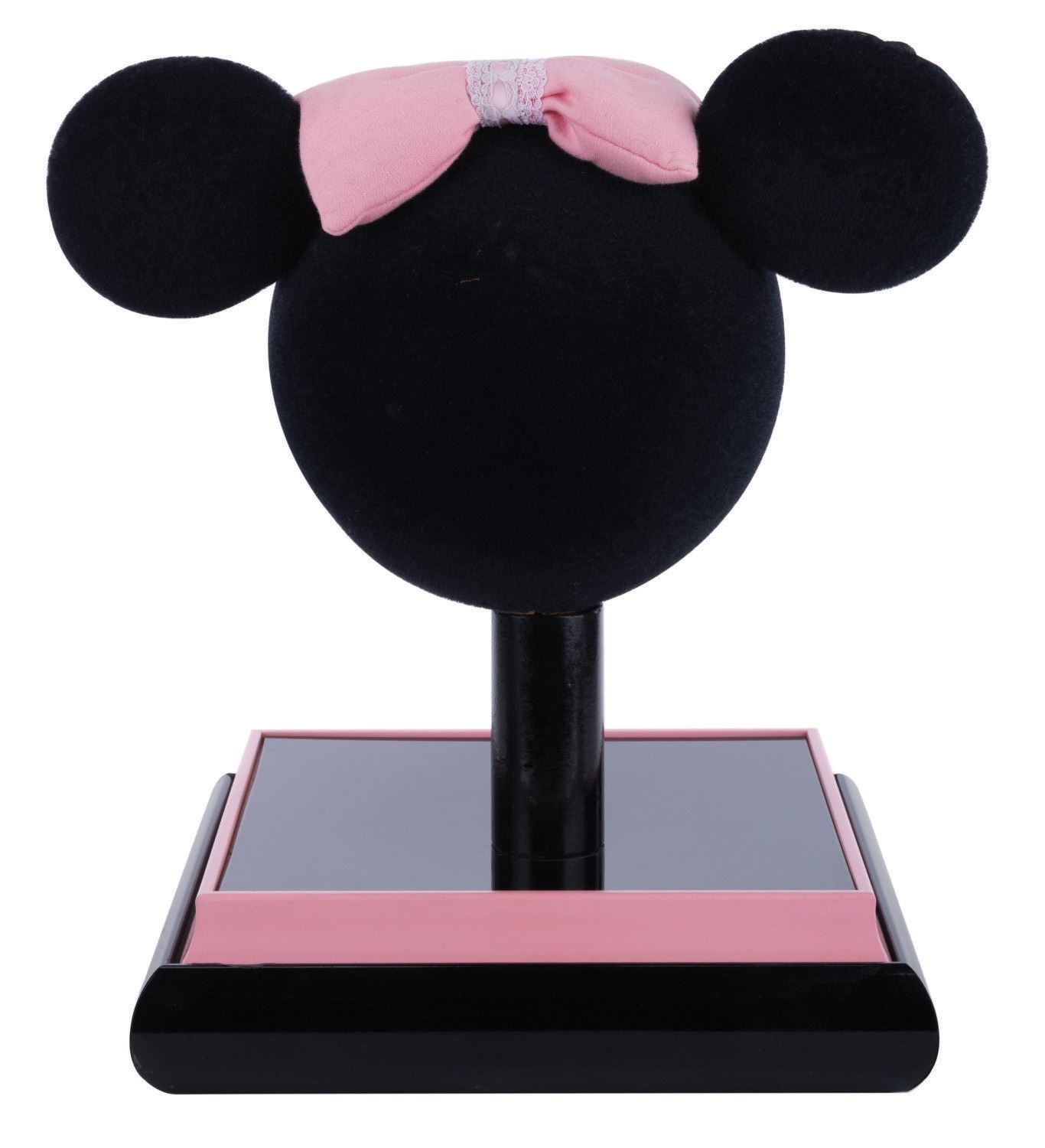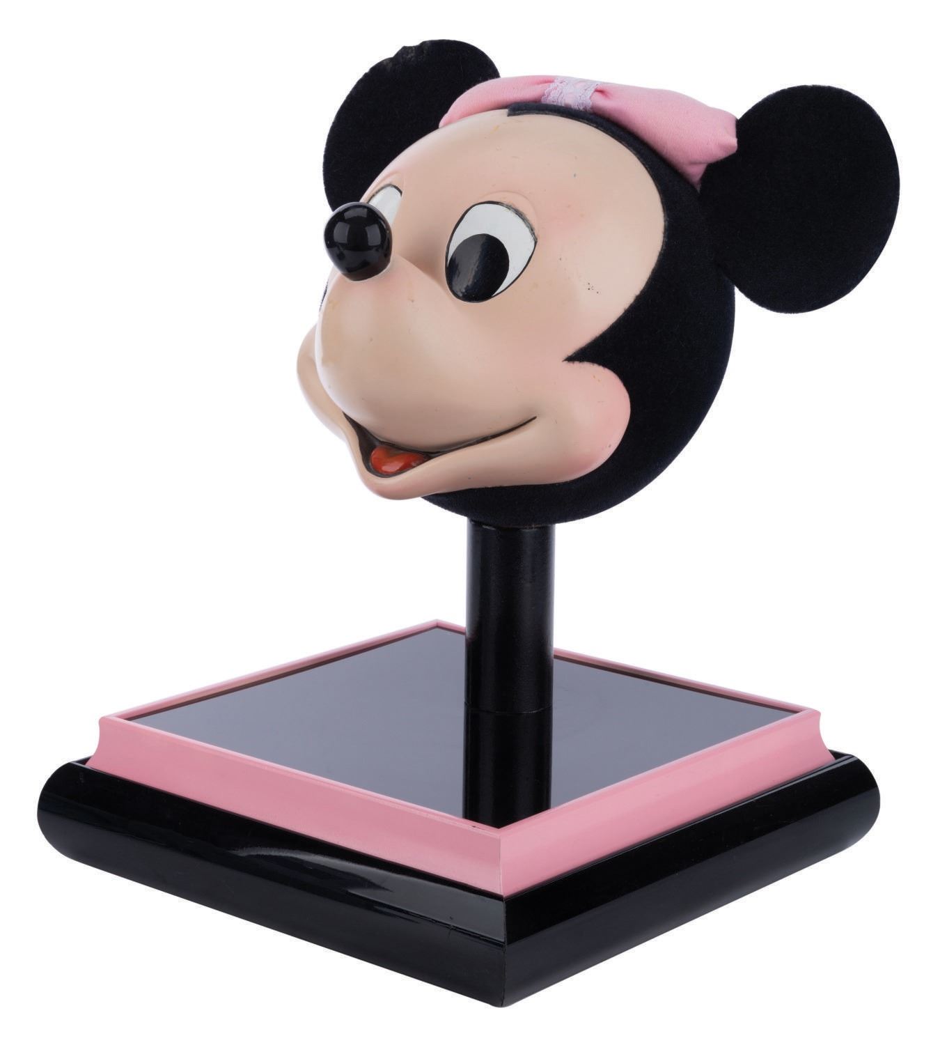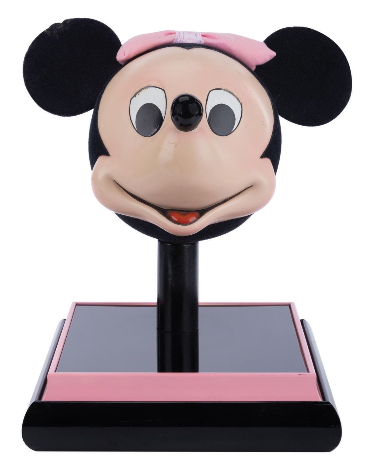 (Disneyland, 1990s) An Emporium Shop Display Minnie Mouse Head. The figural head is hand-painted and flocked and was created for an interior display of the popular merchandise location. Measuring 14.5"x14.5" atop a custom 11.75"x11.75" and 3.5" deep base, the head is in very good condition with minor spots of discoloration to paint, wear to the flocking, mild scuffs, scratches from Park use and age.