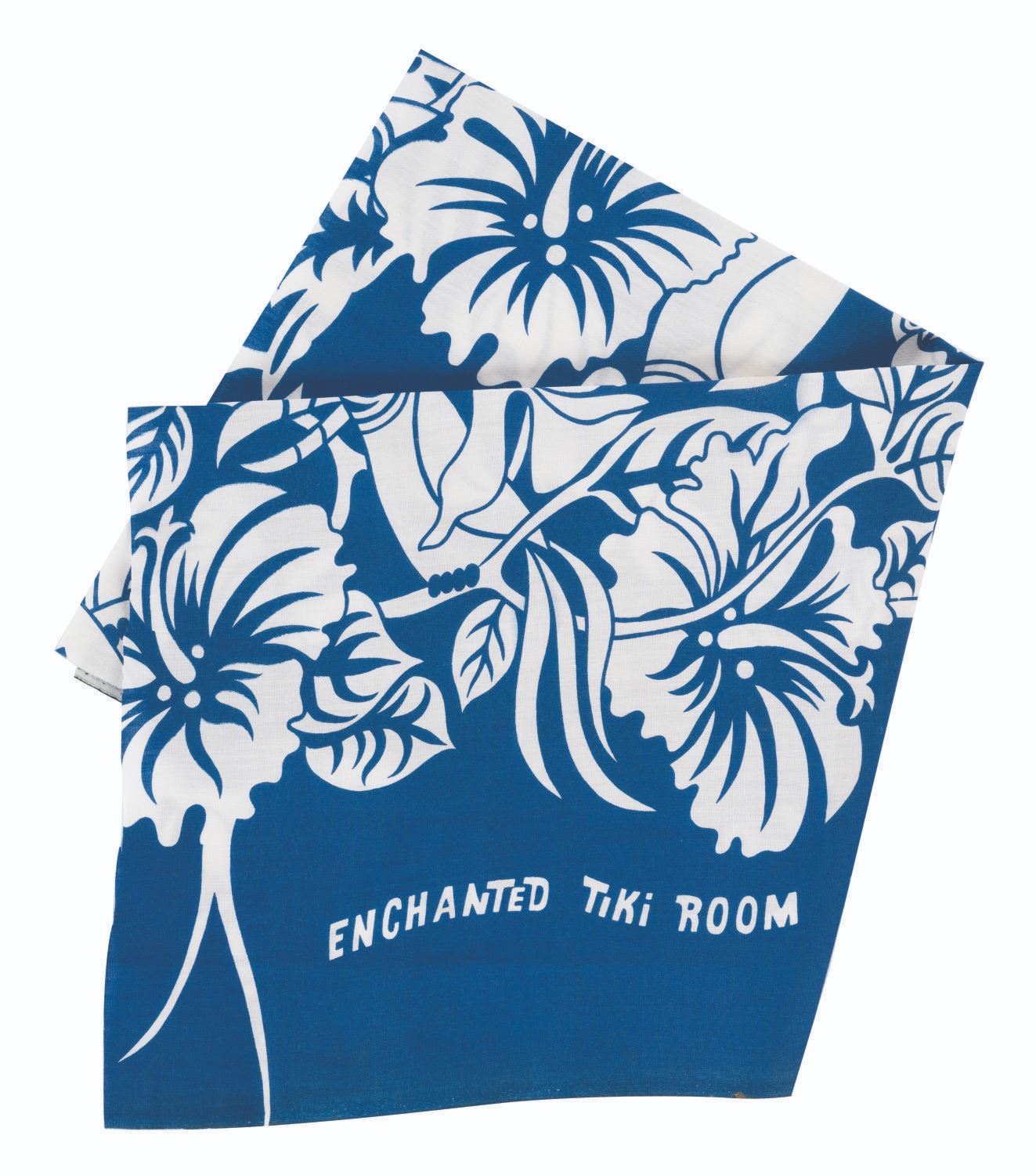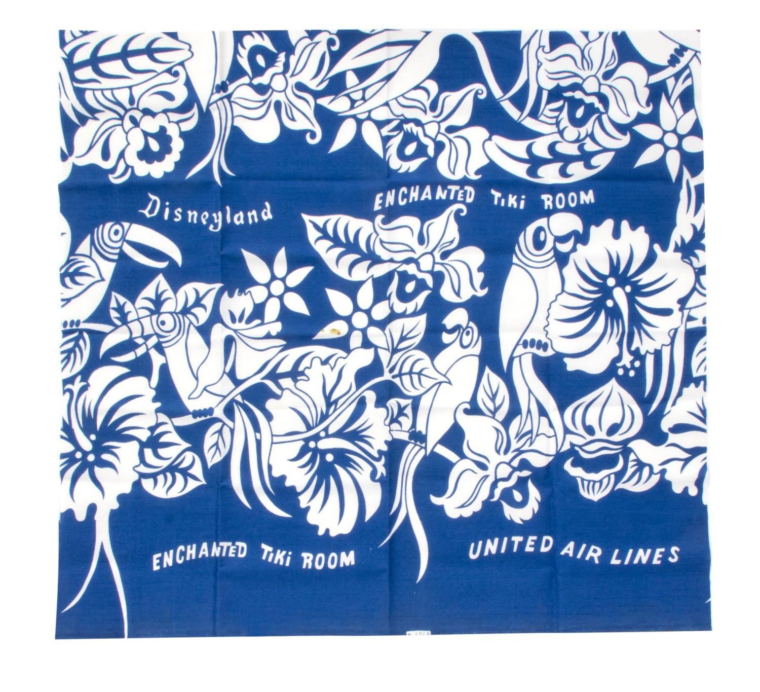 (Disneyland, 1960s) A large swatch of blue fabric featuring a printed motif seen in the Enchanted Tiki Room cast member costumes of the 1960s. Interspersed throughout the tiki birds and floral imagery are the names "Disneyland" and "Enchanted Tiki Room" with its participant sponsor United Air Lines. This fabric measures approximately 24"x22" and is in fine unused condition.