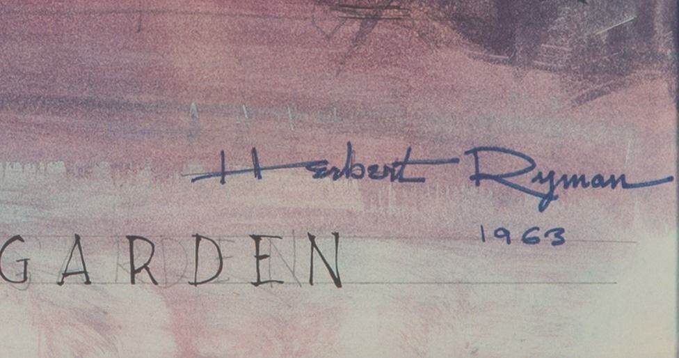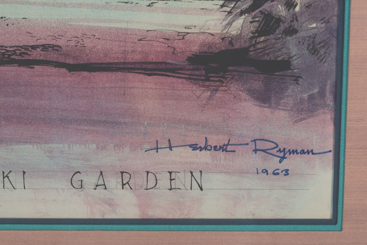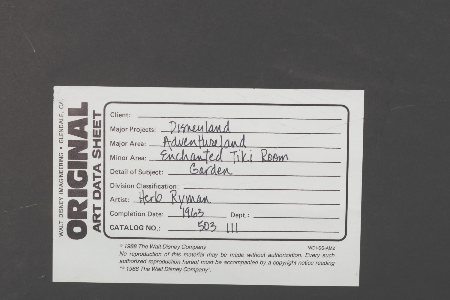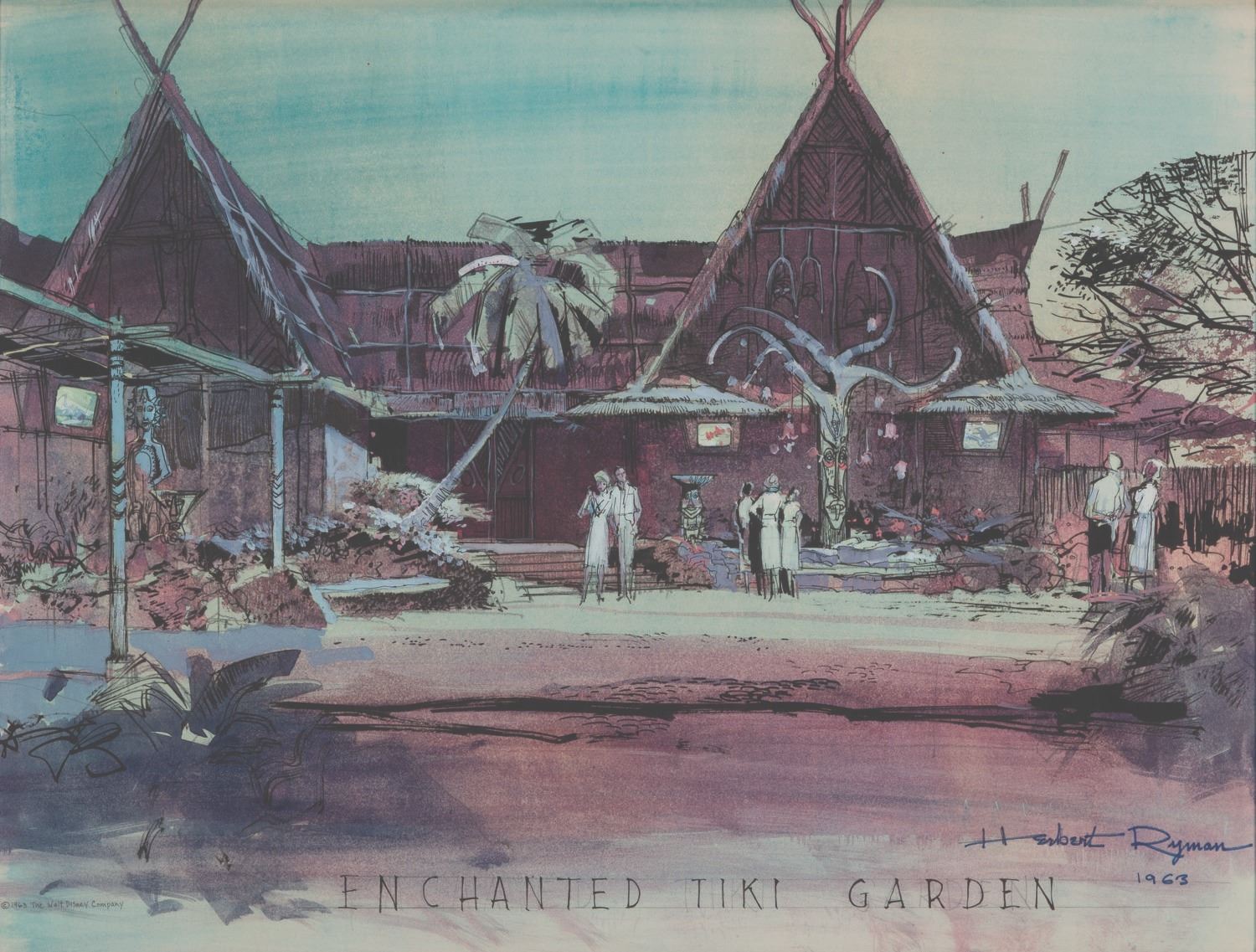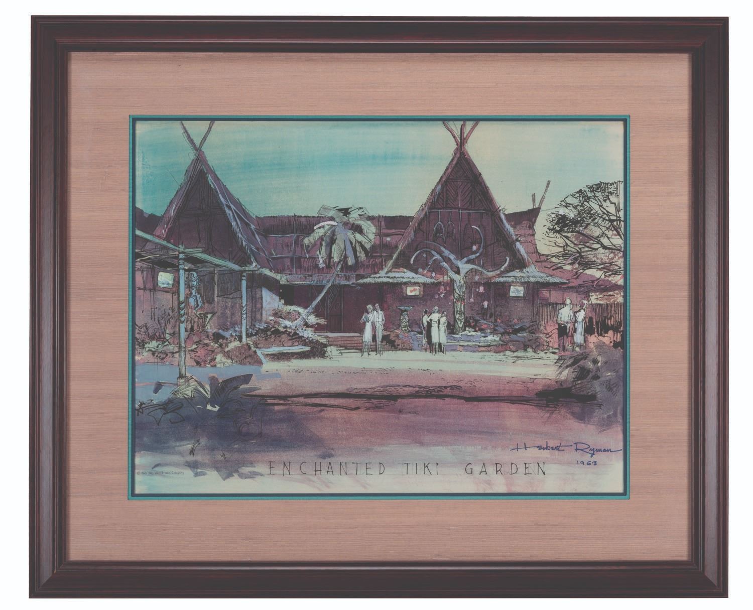 (Disneyland, 1963) An original concept painting of Walt Disney’s Enchanted Tiki Room Exterior and pre-show area by Herb Ryman. The highly detailed painting includes the Tangaroa Tree, the father of all Tiki Gods and Goddesses, voiced in the attraction by Thurl Ravenscroft. Measuring 18” x 23.5” visible in a 28” x 34” frame, the ink and watercolor artwork is in fine condition, signed by the artist. The frame is very good with a spot of paint loss. This comes from the Walt Disney Imagineering Art Library and maintains its original tag on the reverse.