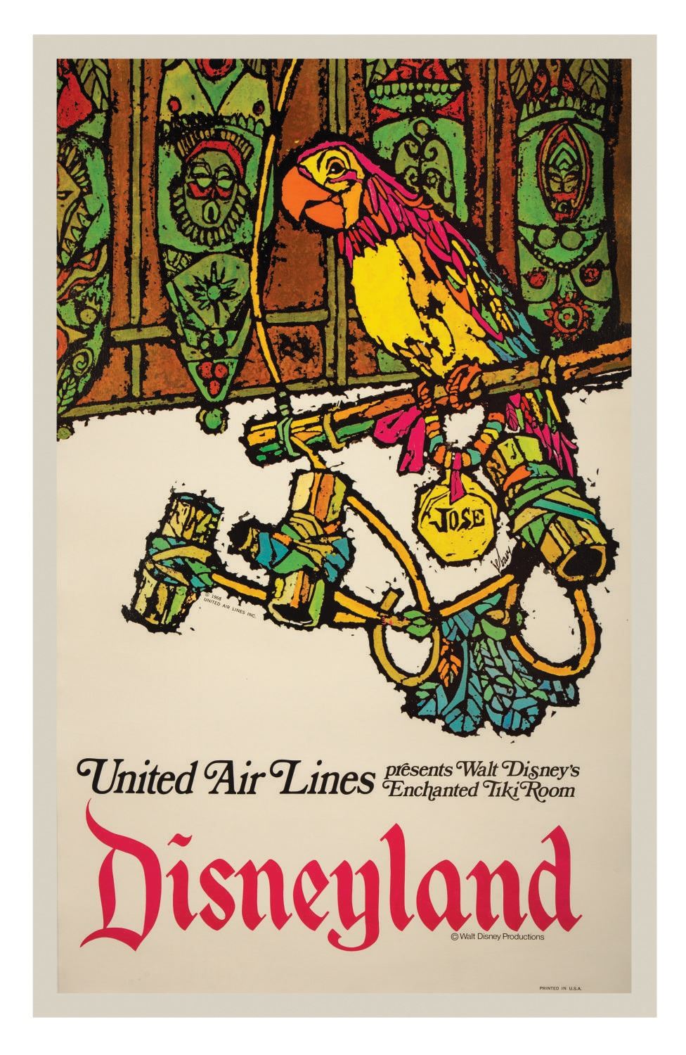 (Disneyland, 1968) A poster advertising Walt Disney's Enchanted Tiki Room at Disneyland presented by United Airlines. The colorful and synergistic advertisement was created for Walt Disney Productions and Disneyland participant sponsor United Airlines and depicts Jose the macaw ready to put on the show as envisioned by artist James Jebavy. Measuring 25"x40.5", the poster has been professionally linen mounted, and displays in fine condition despite few mild scuffs and the slightest scratches.