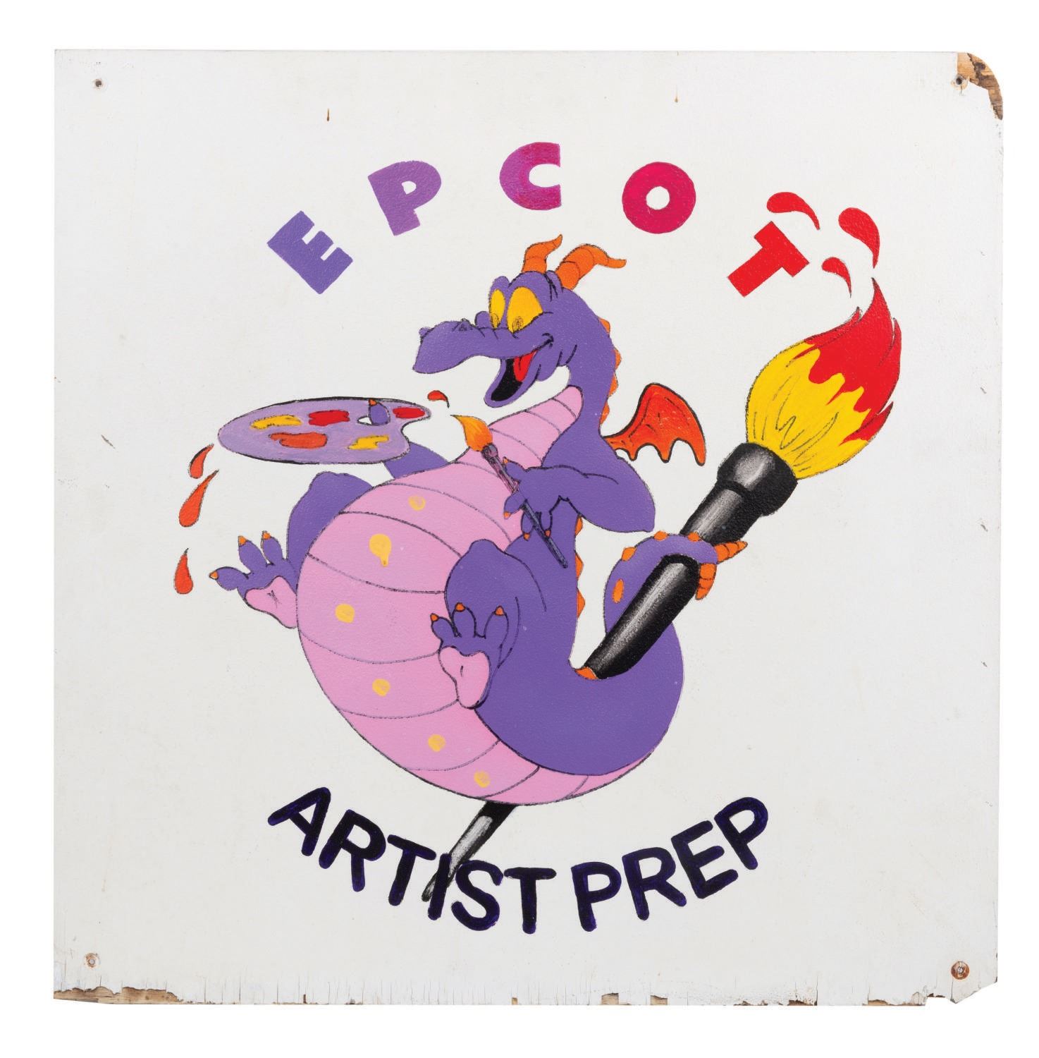 (Epcot Center, 1980s) A custom sign advertising the Artist Prep Area Backstage at Walt Disney World. The custom sign depicts Figment (star of "Journey into Imagination") poised to create a work of art with paint brushes and was intended for display outside the "sightline" of Guests. Measuring 24"x24", the wooden sign is in good condition, despite minor wear from Park display.