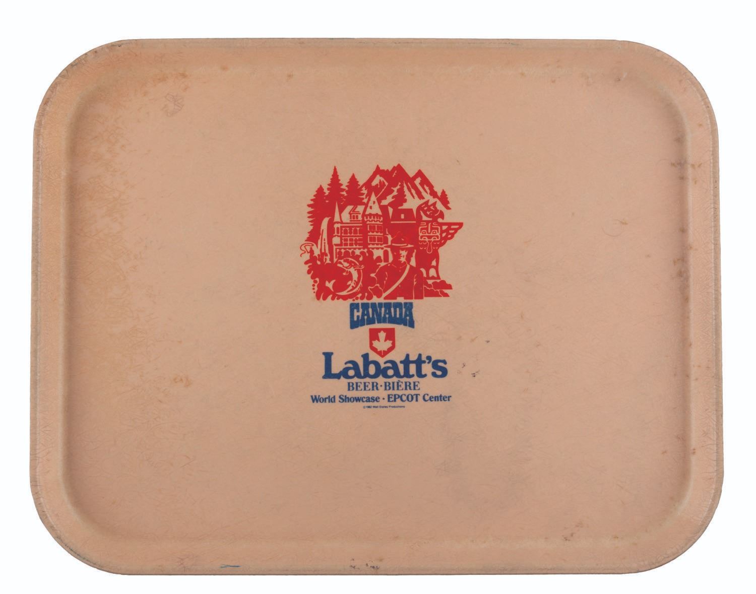(EPCOT Center, 1982) A Canada pavilion tray from the World Showcase, promoting the Canadian brewery Labatt's. Measuring 14" x 18", the tray displays in good condition with spots of discoloration from age, stains, scratches throughout, and wear.