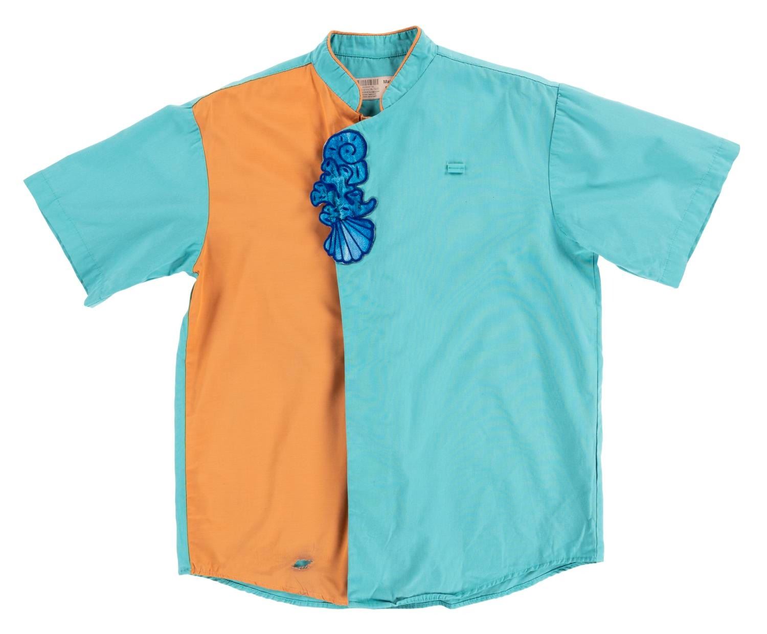 (Epcot, 2000s-2020s) A uniform shirt worn by Cast Members of the Coral Reef Restaurant at Epcot's Living Seas pavilion. The shirt is labeled a Male M and retains its original Disney tag. The shirt displays in good condition with very small light stains and a 0.5" x 1" hole on the front above the hem.