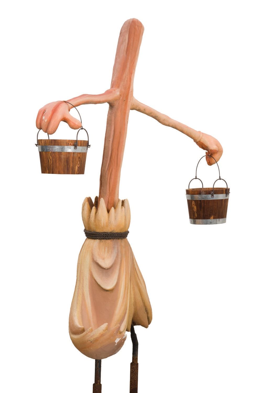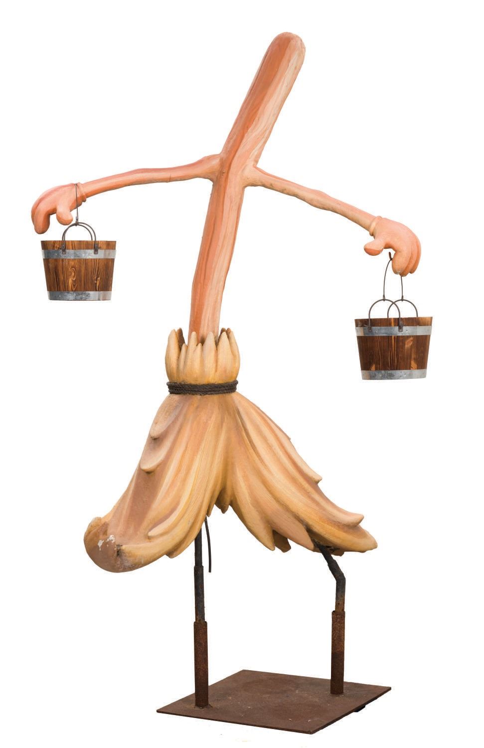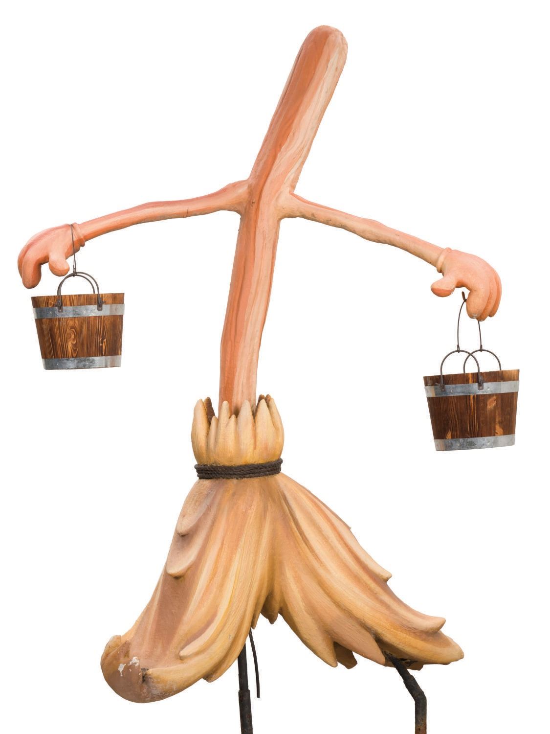 (Epcot, 2020) An oversized statue of a Sorcerer's Apprentice broom from Fantasia, displayed at World Showcase Plaza during the Epcot Flower and Garden Festival in 2020. The area immediately in front of Spaceship Earth was decorated with a topiary Sorcerer's Apprentice Mickey accompanied by five magic brooms including this one, with flowers in their buckets. The broom measures 46"x38"x70" high, above a 24.75"x24.75" base that brings the total height of the piece to 92". The Broom is in good condition with wear from Park use, and damage to the paint mainly at the bottom outer tips of his bristle "feet." The base shows heavy oxidation from exposure to the elements, and the two 10" diameter buckets are included in good condition. One of the hooks on his hands that buckets hang from is missing due to corrosion. Due to size, special shipping arrangements are required. Please inquire before bidding.