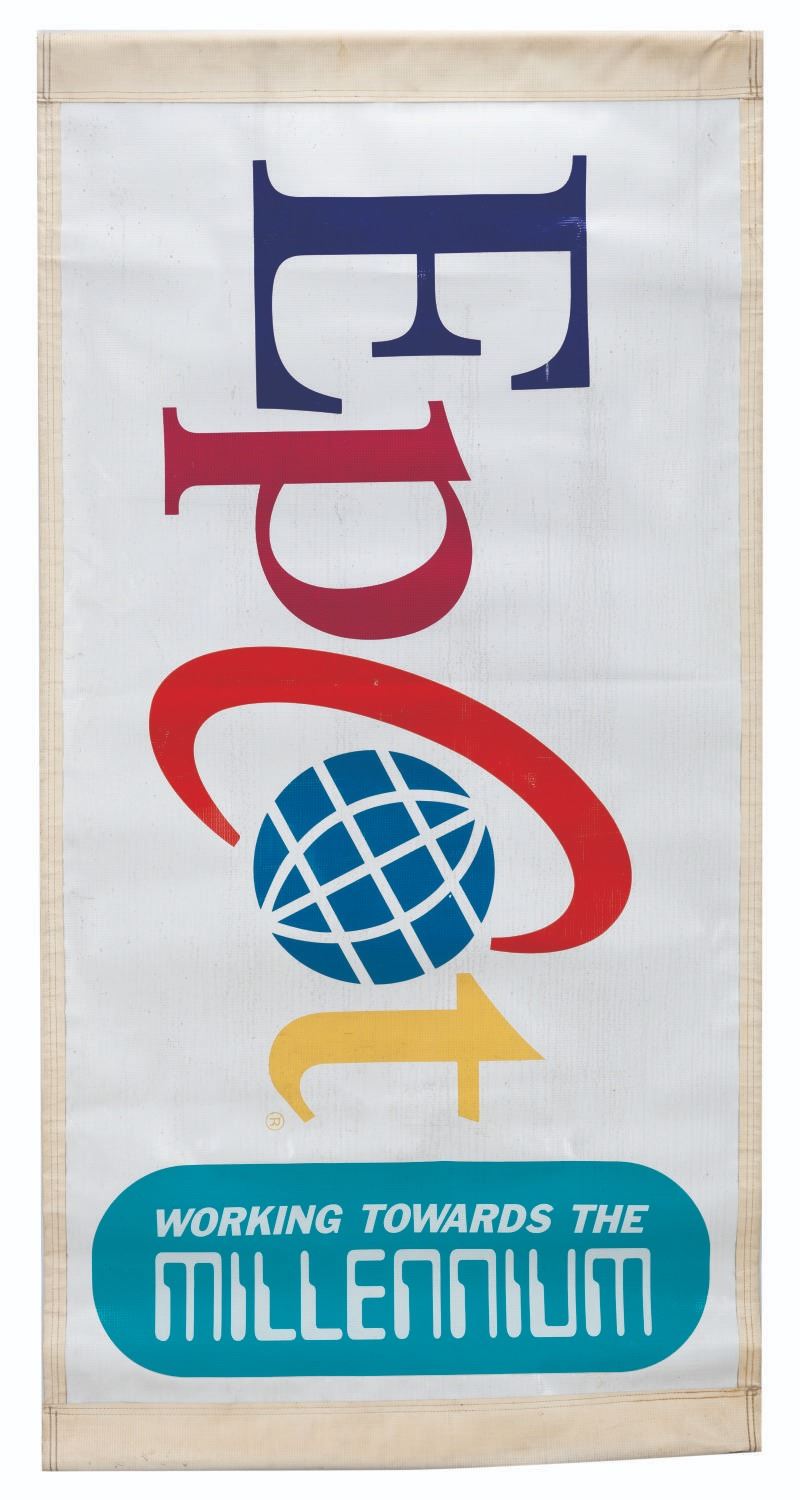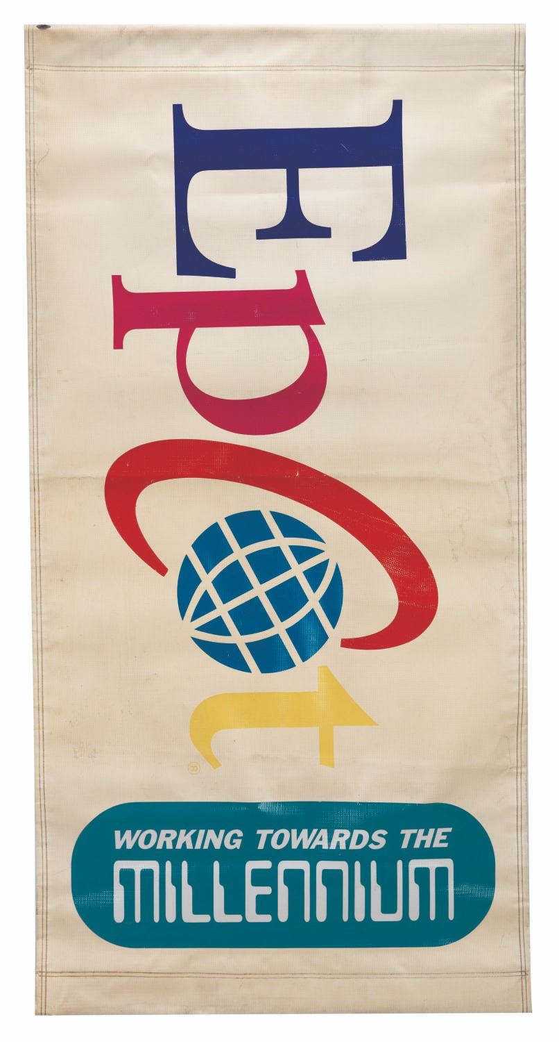 (Epcot, 1999) An Epcot"Working Towards the Millennium" double-sided vinyl banner. Measuring 30" x 58.5", the banner is in good condition with stains, discoloration from age, scuffs, and wear from Park use.