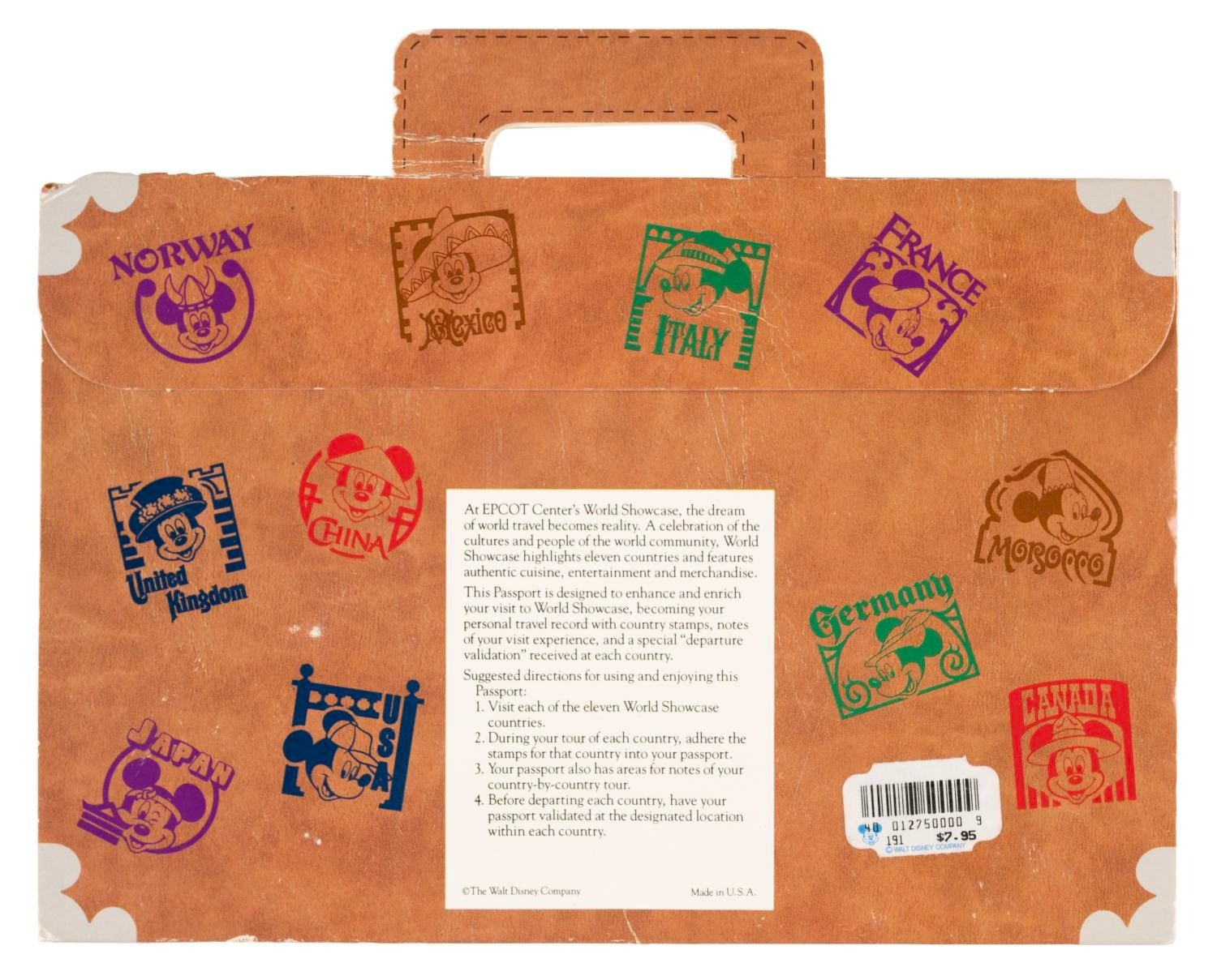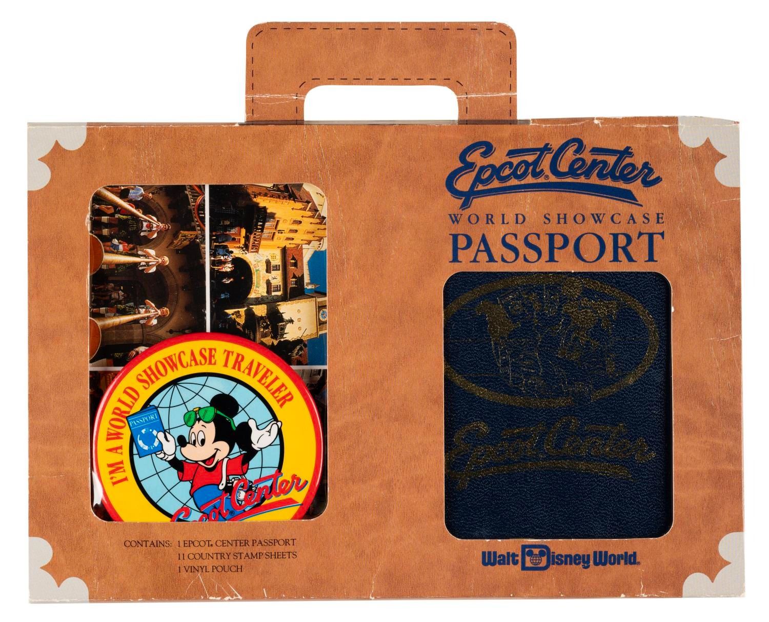 (Epcot, 1990s) A souvenir World Showcase Passport Kit. Guests could get the enclosed passport stamped at the different World Showcase locations. This kit contains a World Showcase Traveler button, three postcards, and a passport booklet filled with five stickers and a stamp for each represented country. The set is in fine condition, with the outer case in good condition with wear from handling and opening.