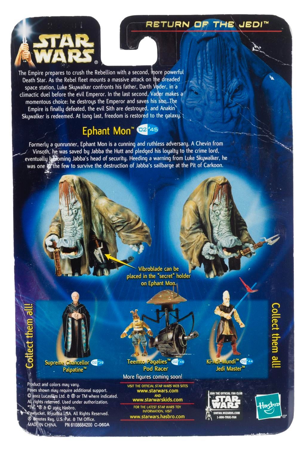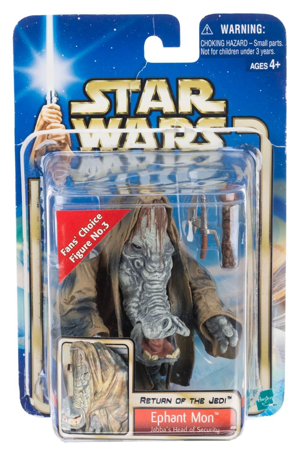 (Hasbro, 2002) An action figure of Ephant Mon, Jabba the Hutt’s Head of Security in “Return of the Jedi.” The figure and accessories are in fine condition in the original bubble, which has separated from the card from the sheer weight of the piece.