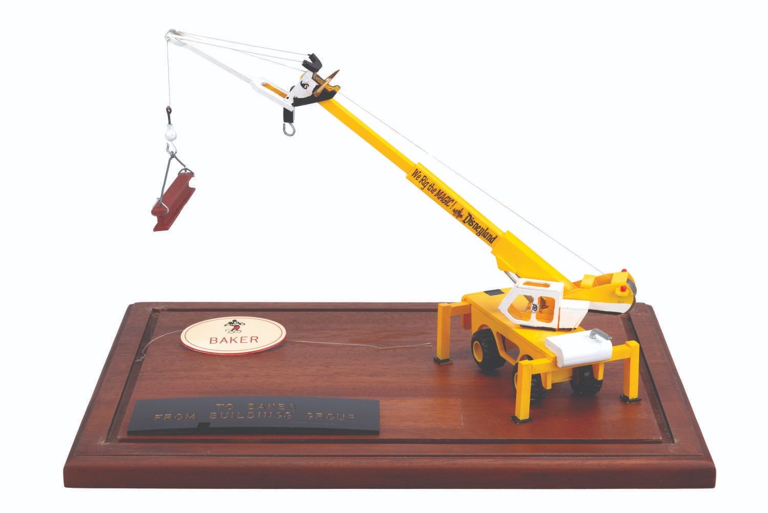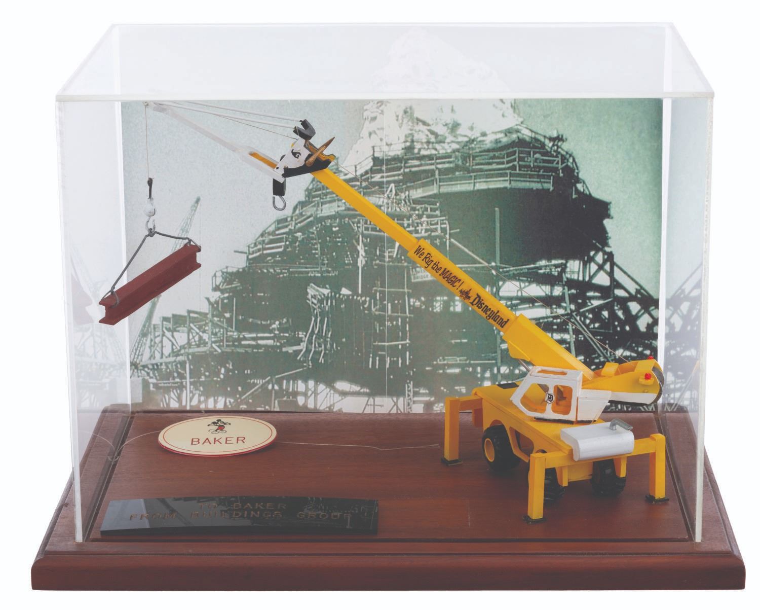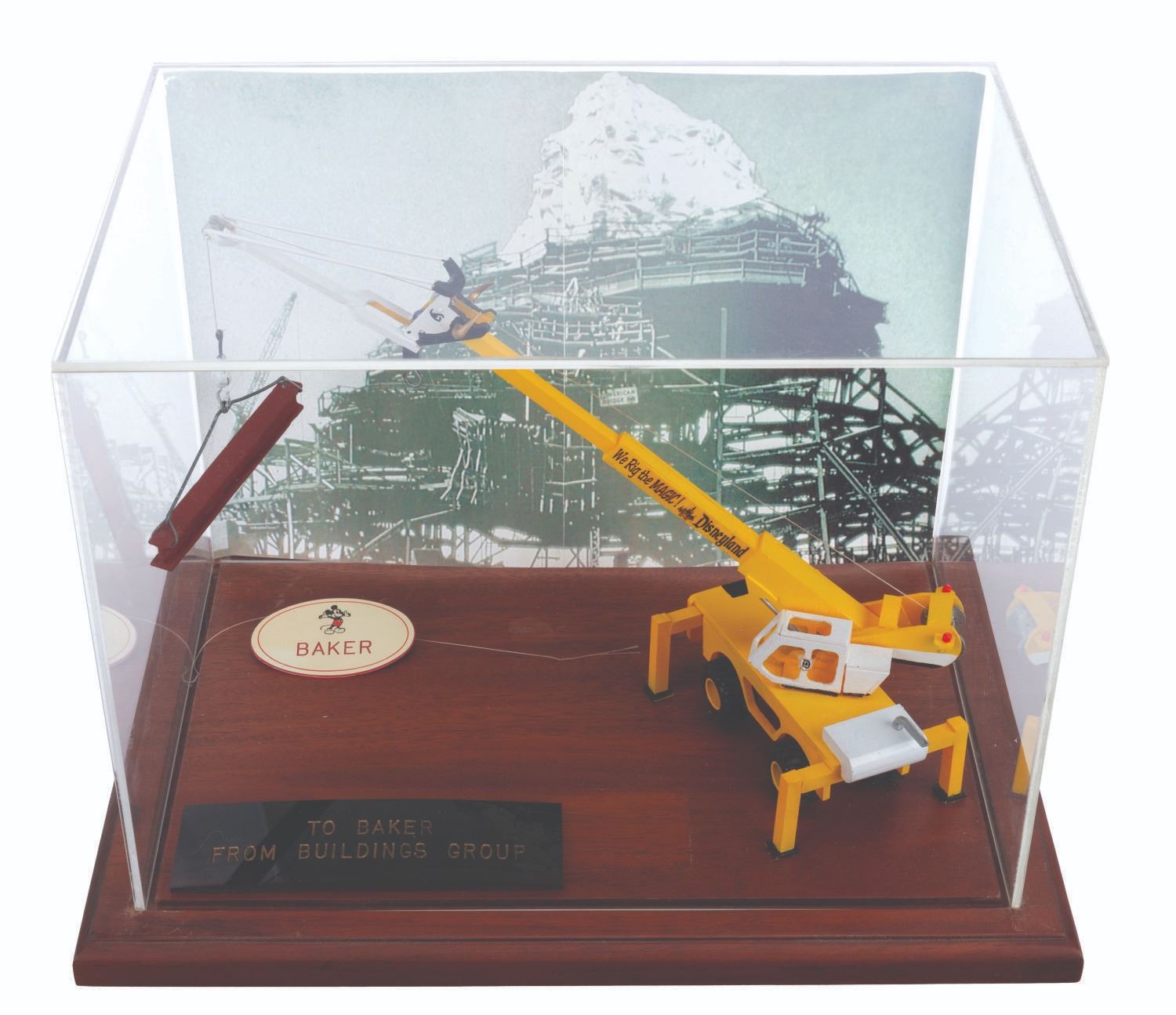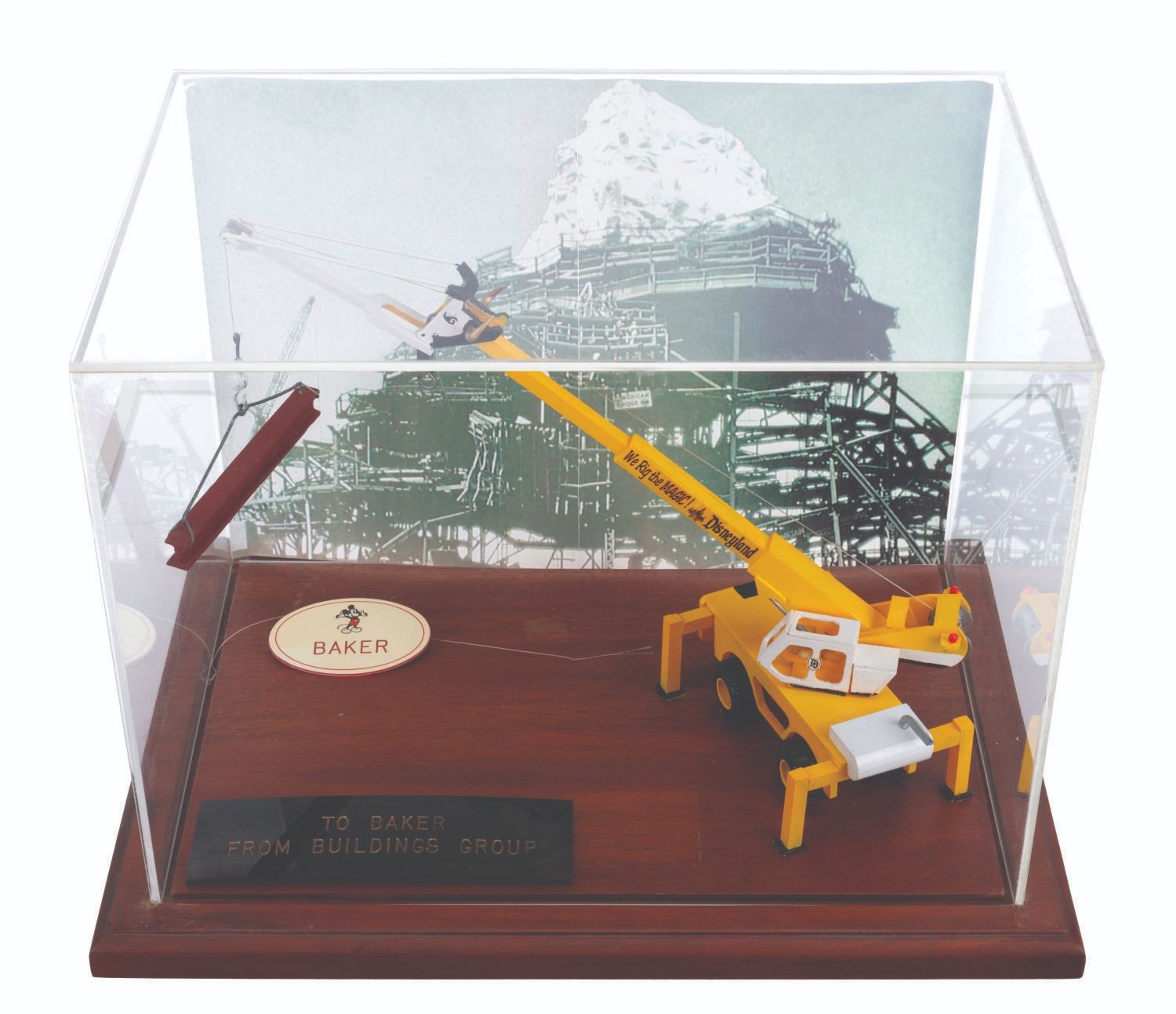 (Disneyland, 1993) A custom Matterhorn display gifted to Cast Member Ermitt Baker upon his retirement after working for the company since 1959. The display includes a Baker Cast Member name tag, a “We rig the magic!” Disneyland crane holding a beam, a printout of the Matterhorn during construction, and a plaque that reads, “To Baker From Buildings Group.” Measuring 10” x 14” x 9.75” tall, the custom display is in good condition with scratches, wear, and separation at one corner of the plastic case.