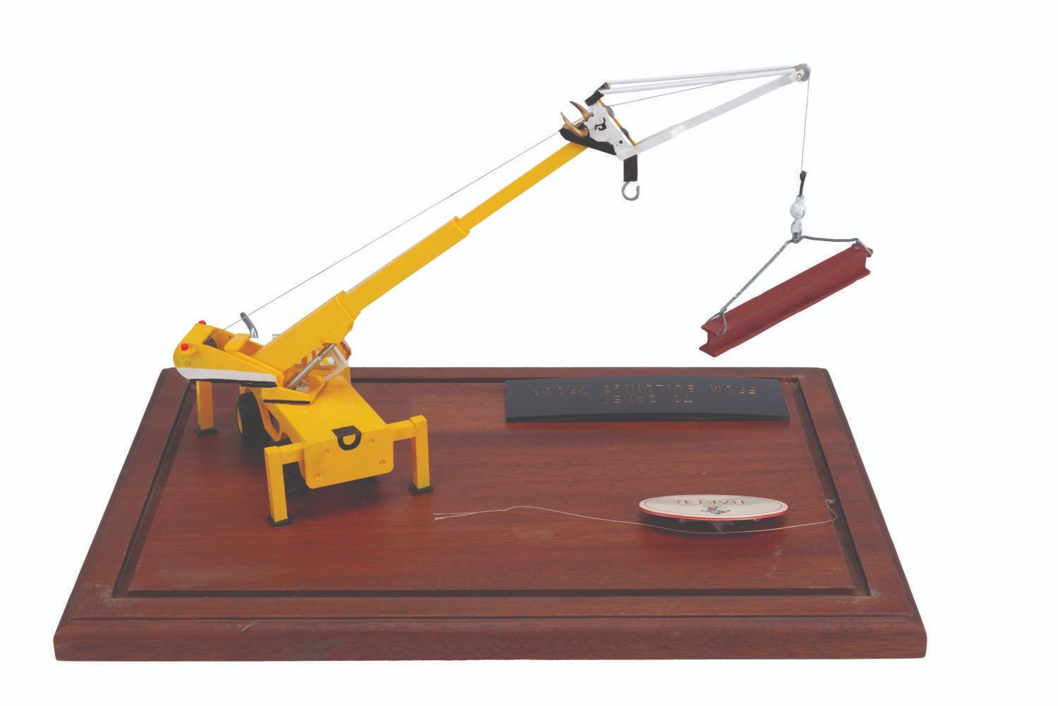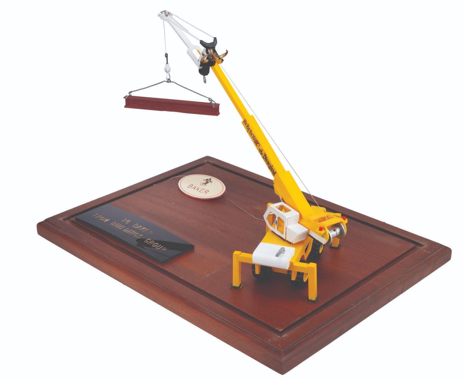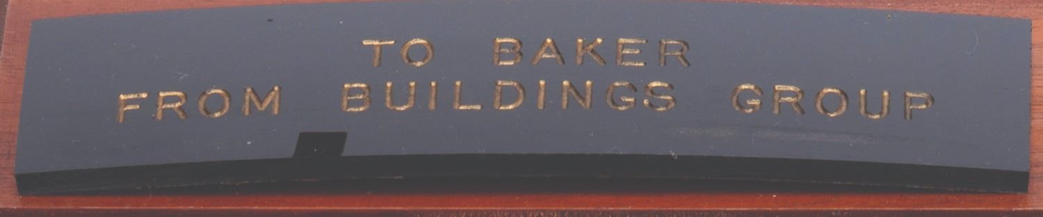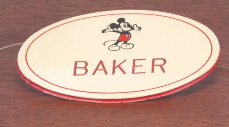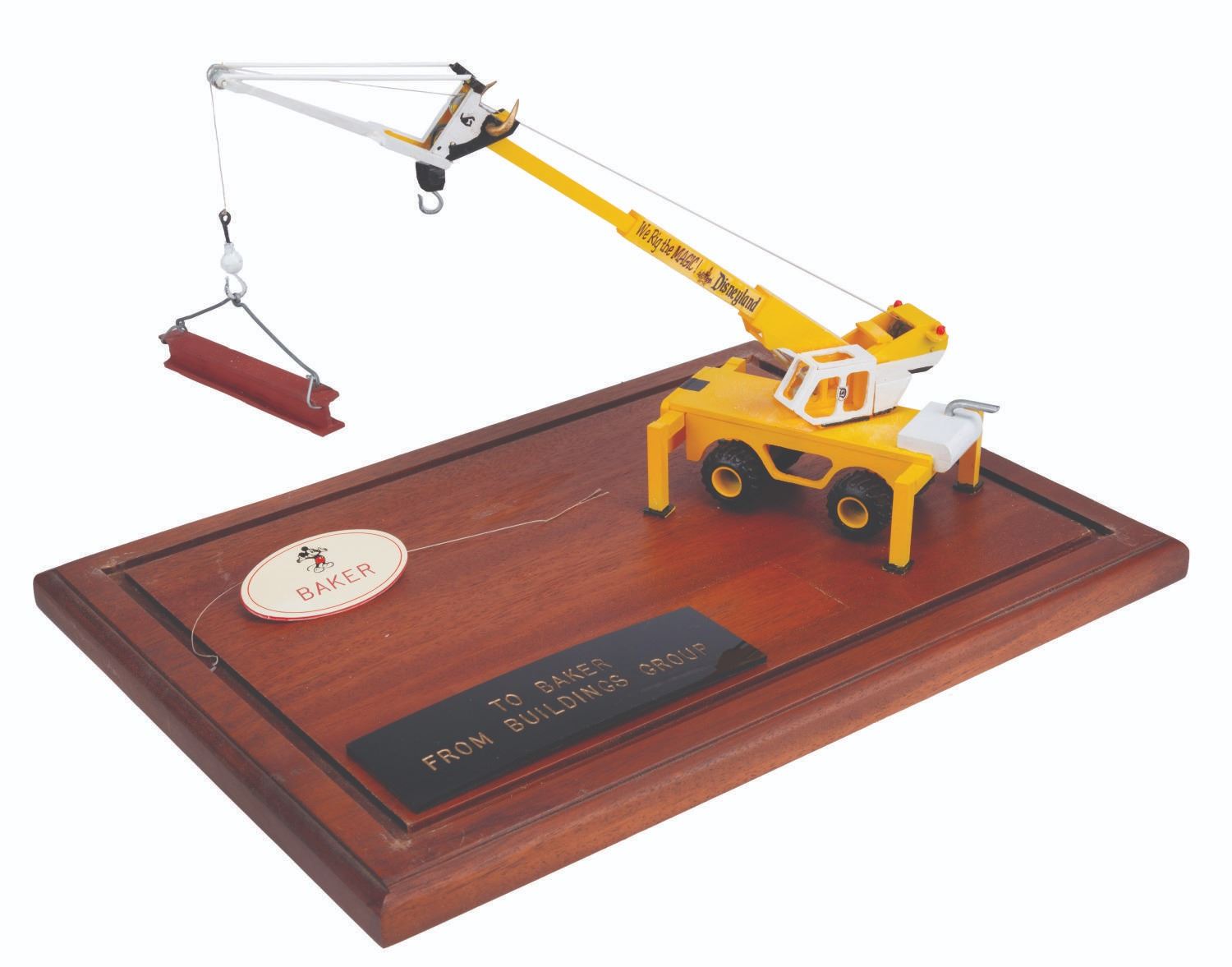 (Disneyland, 1993) A custom Matterhorn display gifted to Cast Member Ermitt Baker upon his retirement after working for the company since 1959. The display includes a Baker Cast Member name tag, a “We rig the magic!” Disneyland crane holding a beam, a printout of the Matterhorn during construction, and a plaque that reads, “To Baker From Buildings Group.” Measuring 10” x 14” x 9.75” tall, the custom display is in good condition with scratches, wear, and separation at one corner of the plastic case.