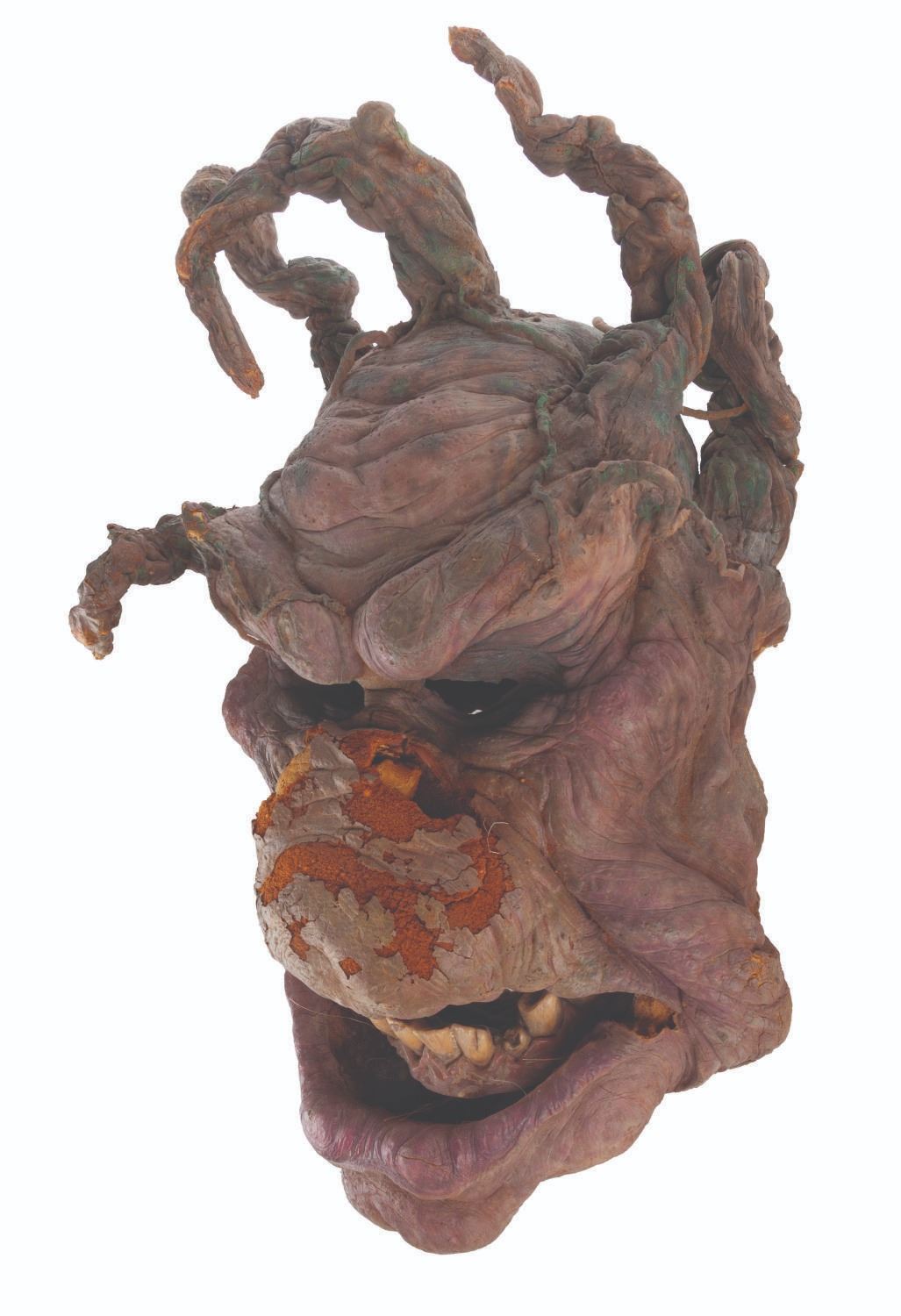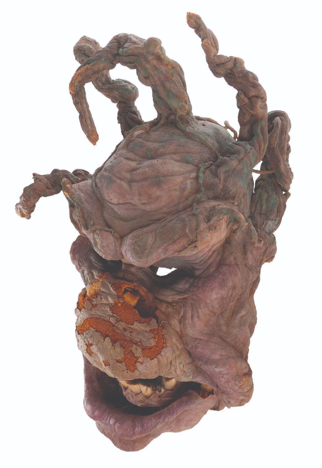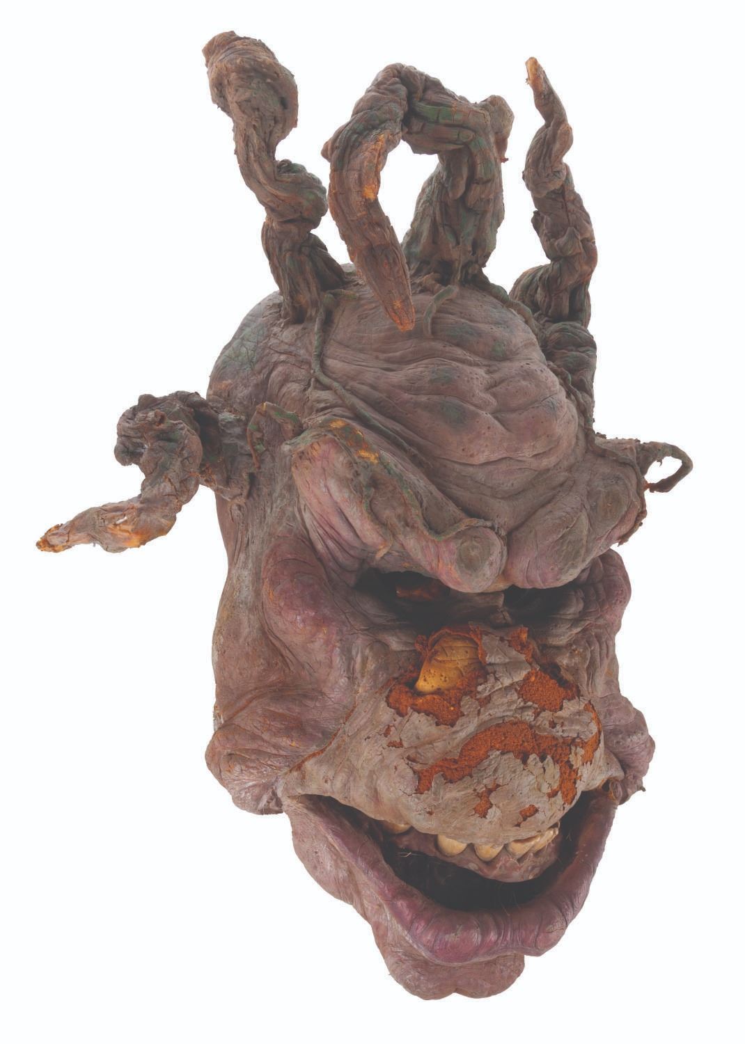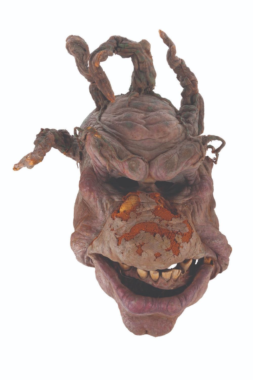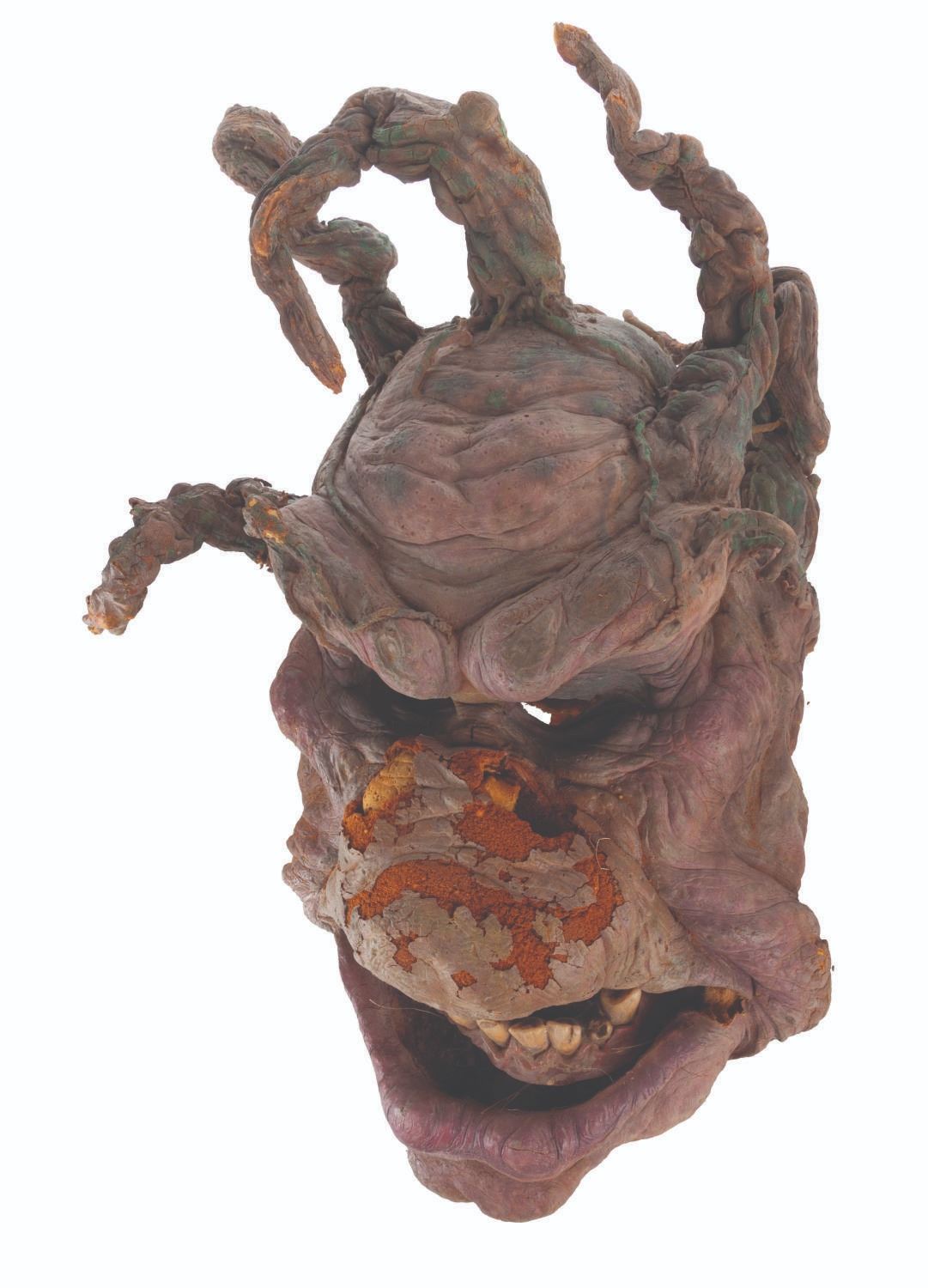 (Touchstone/CBS, 1991/1992) An original troll mask created for "Ernest Scared Stupid." Handcrafted by effects artists the Chiodo Brothers, this mask was later refurbished and screen-used in the "Swampthingamajig" episode of their television series "The Amazing Live Sea Monkeys." Measuring 15.5" x 8.5" x 21.5" tall, the mask is in fair condition with wear from production use and age including cracks, paint loss, and flaking and material loss, notably on the nose. This lot requires special shipping arrangements. Please inquire before bidding.