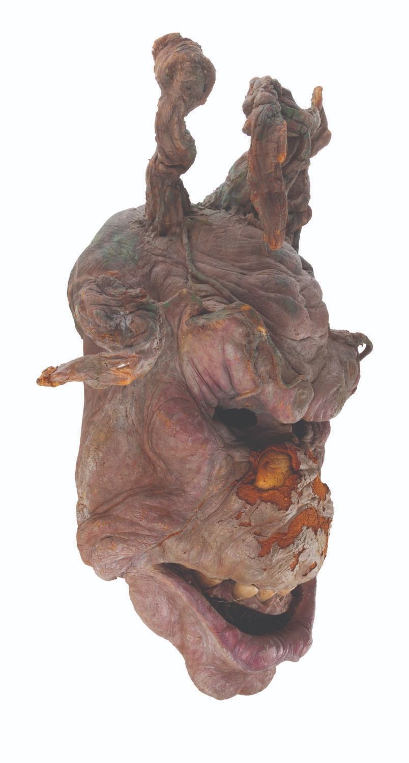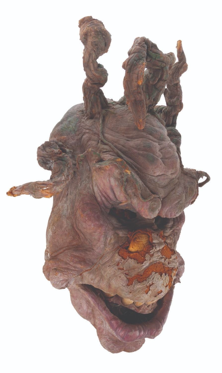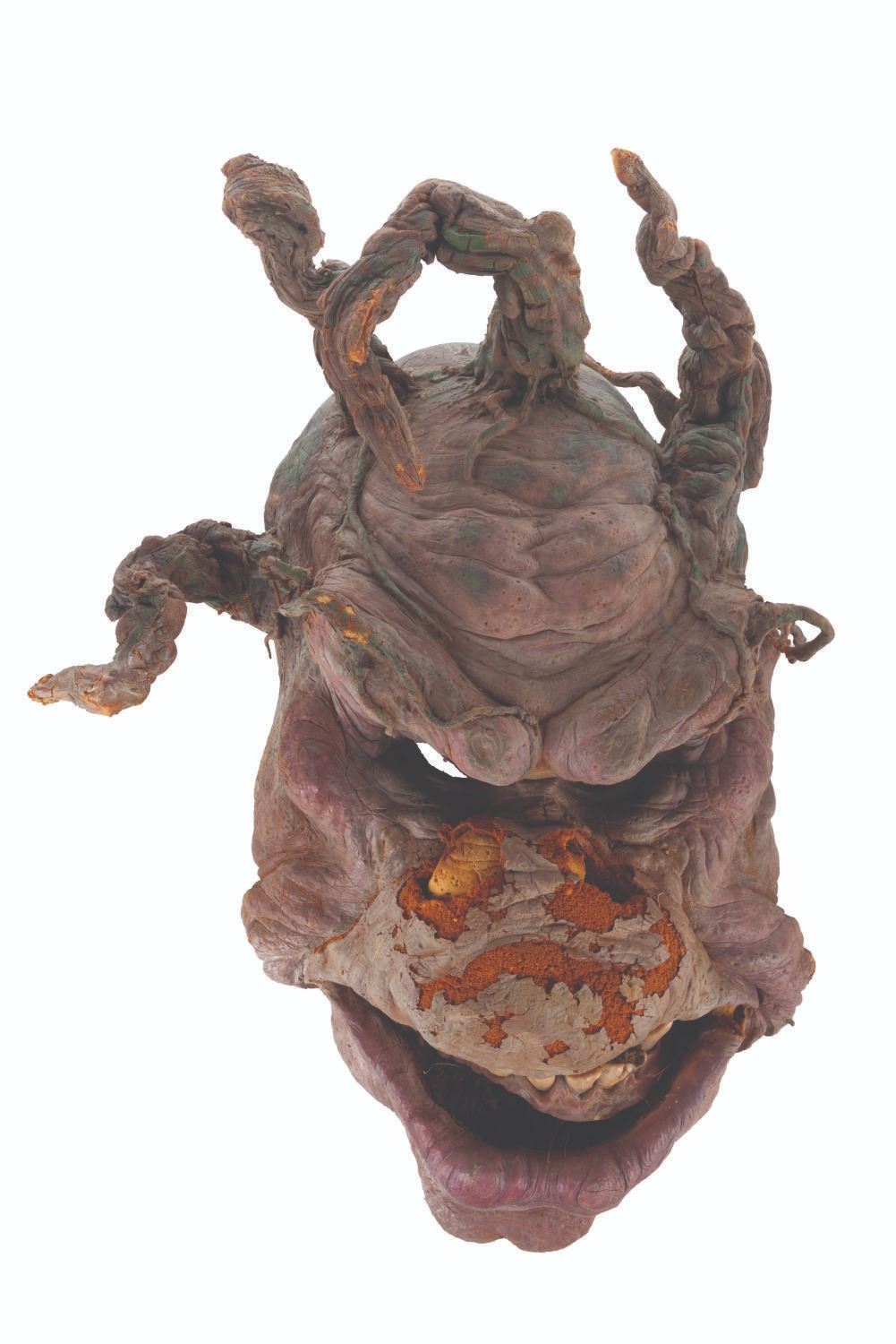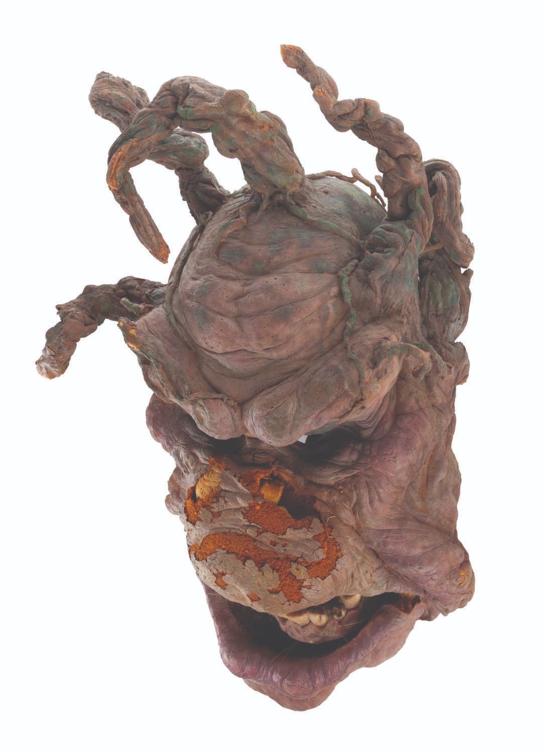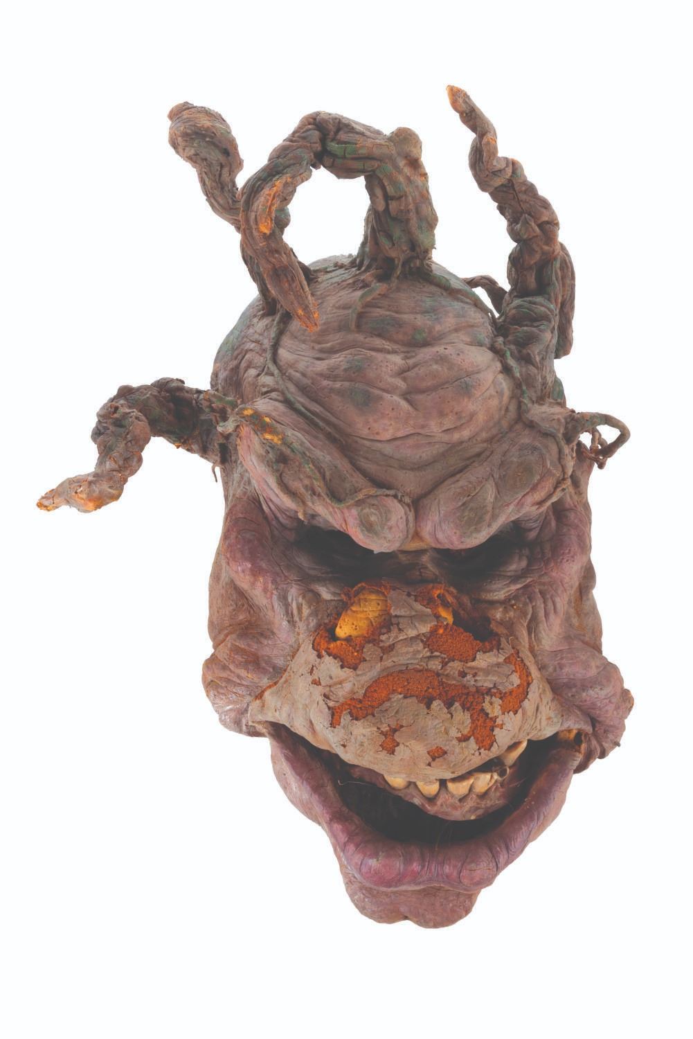 (Touchstone/CBS, 1991/1992) An original troll mask created for "Ernest Scared Stupid." Handcrafted by effects artists the Chiodo Brothers, this mask was later refurbished and screen-used in the "Swampthingamajig" episode of their television series "The Amazing Live Sea Monkeys." Measuring 15.5" x 8.5" x 21.5" tall, the mask is in fair condition with wear from production use and age including cracks, paint loss, and flaking and material loss, notably on the nose. This lot requires special shipping arrangements. Please inquire before bidding.