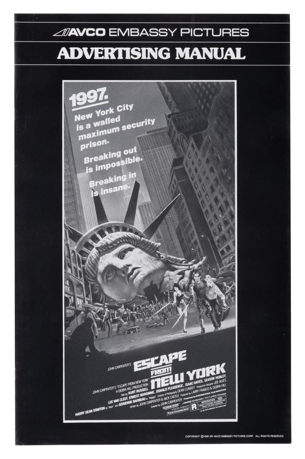 (Avco Embassy, 1981) A pressbook for "Escape From New York," starring Kurt Russell, originating the role of Snake Plissken. The twelve-page book includes publicity stories, promotional pieces, and layouts of all sizes for theaters to publish local ads. Measuring 11" x 16.75", the pressbook is in very good condition with typical light handling wear.