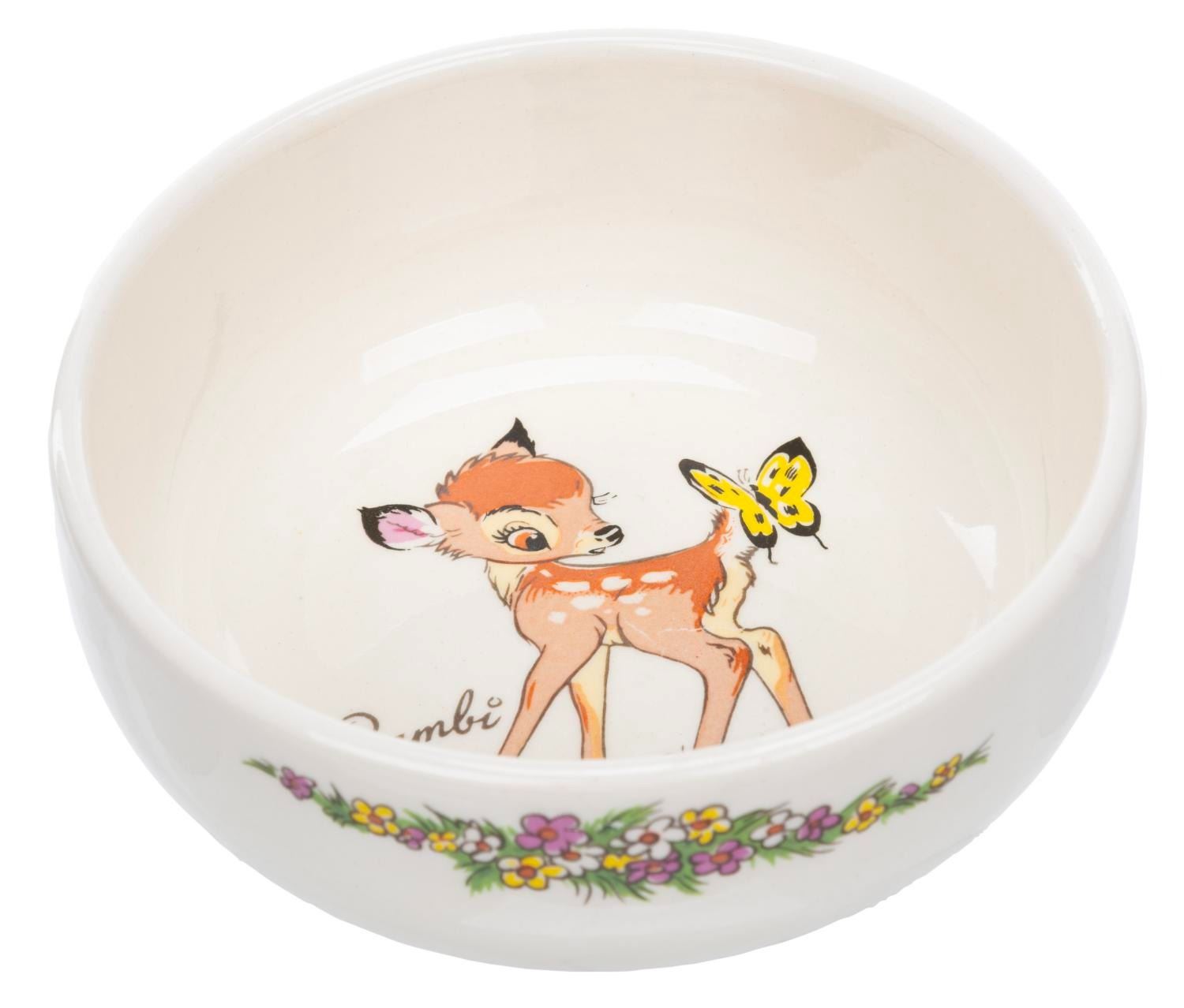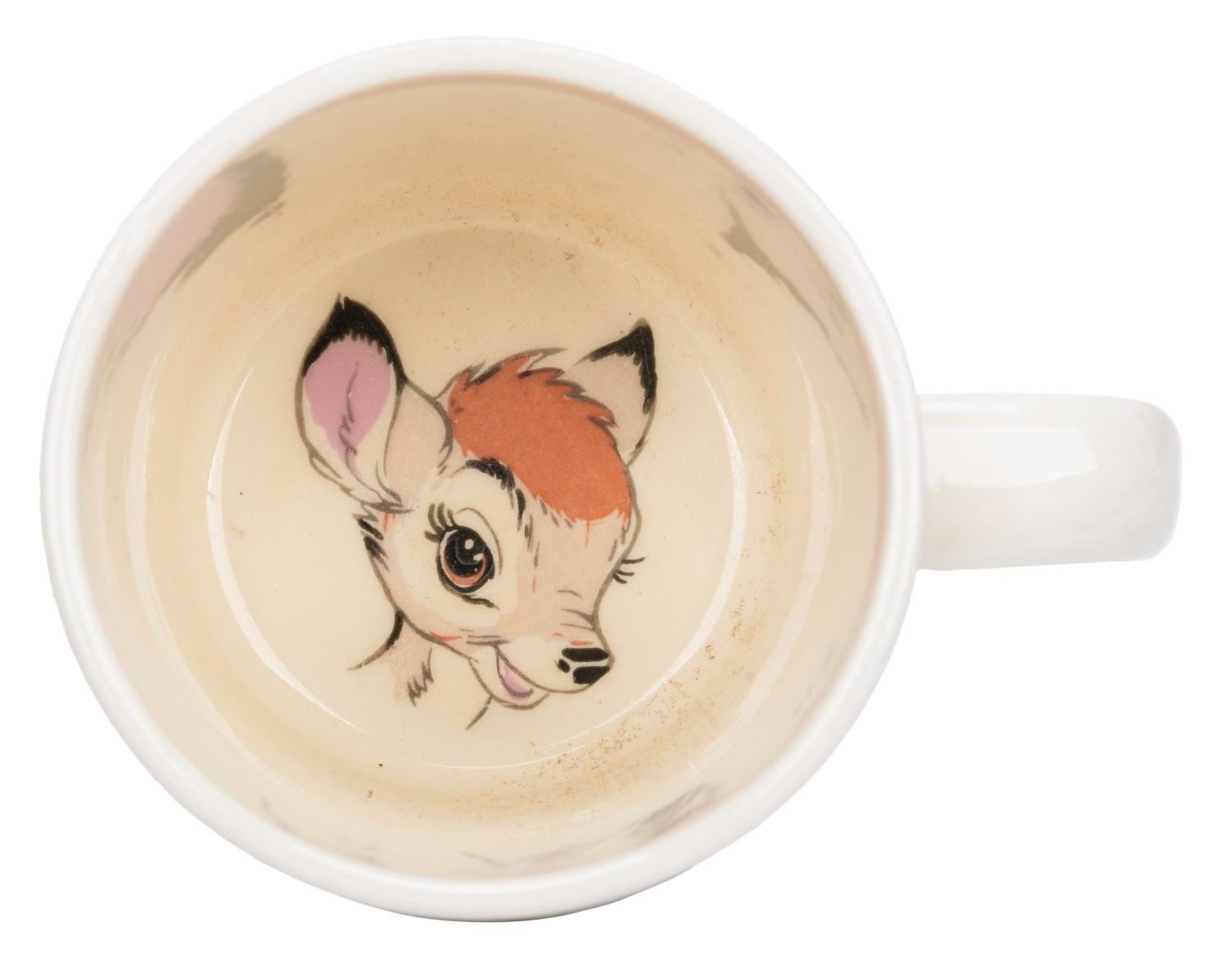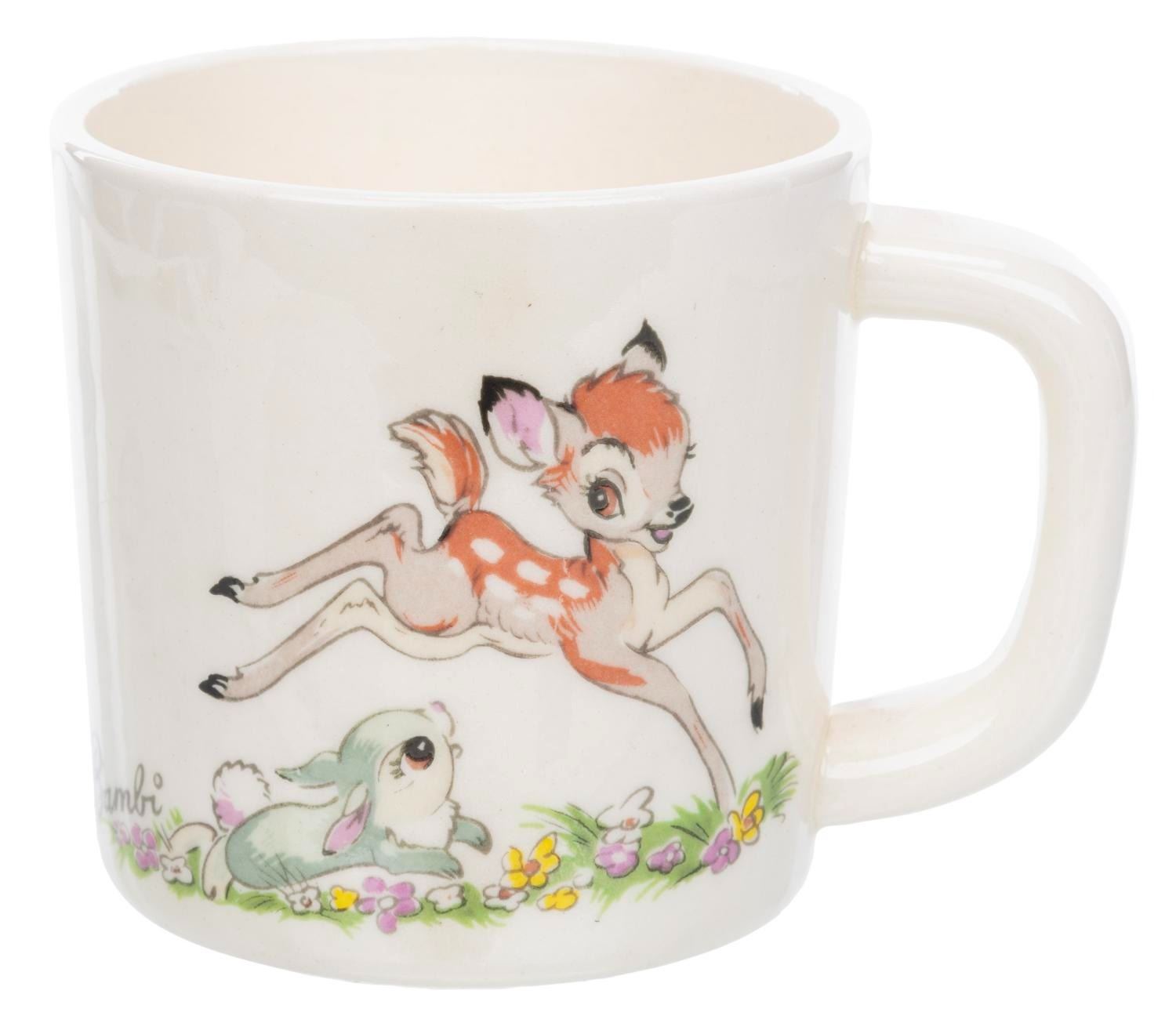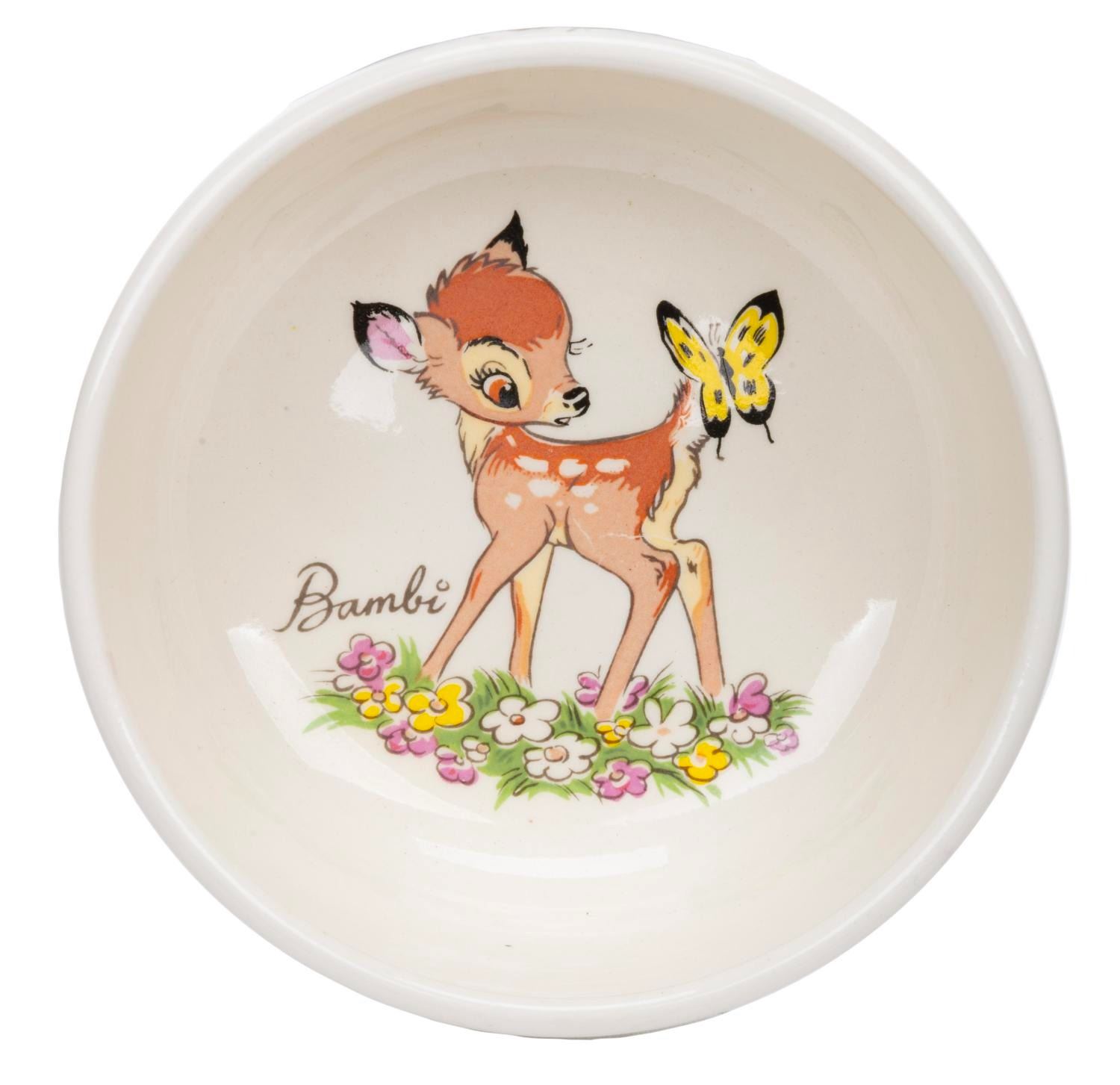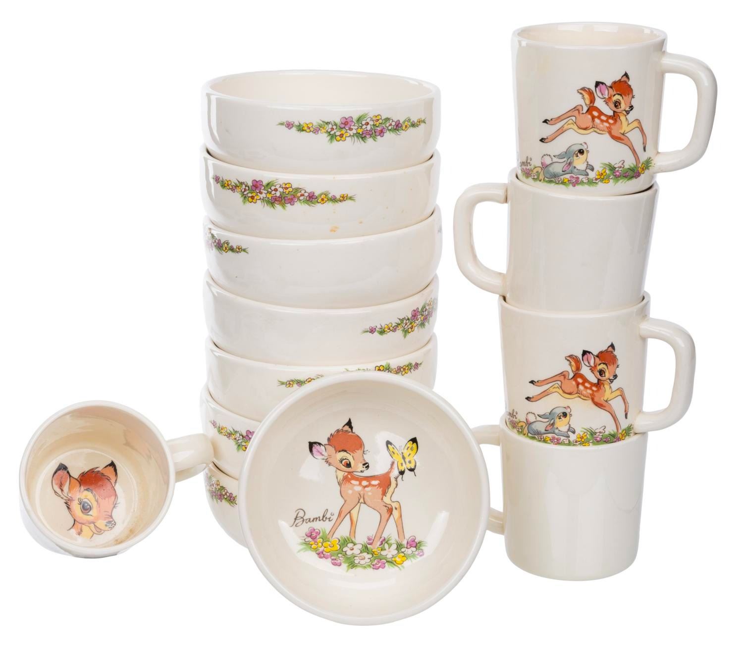 (Shaw Pottery, 1940s-50s) A collection of five mugs and eight bowls featuring Bambi and Thumper. Evan K. Shaw Pottery and its sister companies, Metlox and American Pottery, produced a wide range of ceramics, and in 1943 were granted approval as a licensee to produce a range of Disney characters. These companies are no longer in business, and their highly desirable figurines and tableware are increasingly rare. With the bowls measuring 5” diameter x 2” and the mugs 4” x 3” x 3”, the pieces are overall in very good condition with typical light handling wear. Two mugs and three bowls are in good condition with fading to the patterns from use.