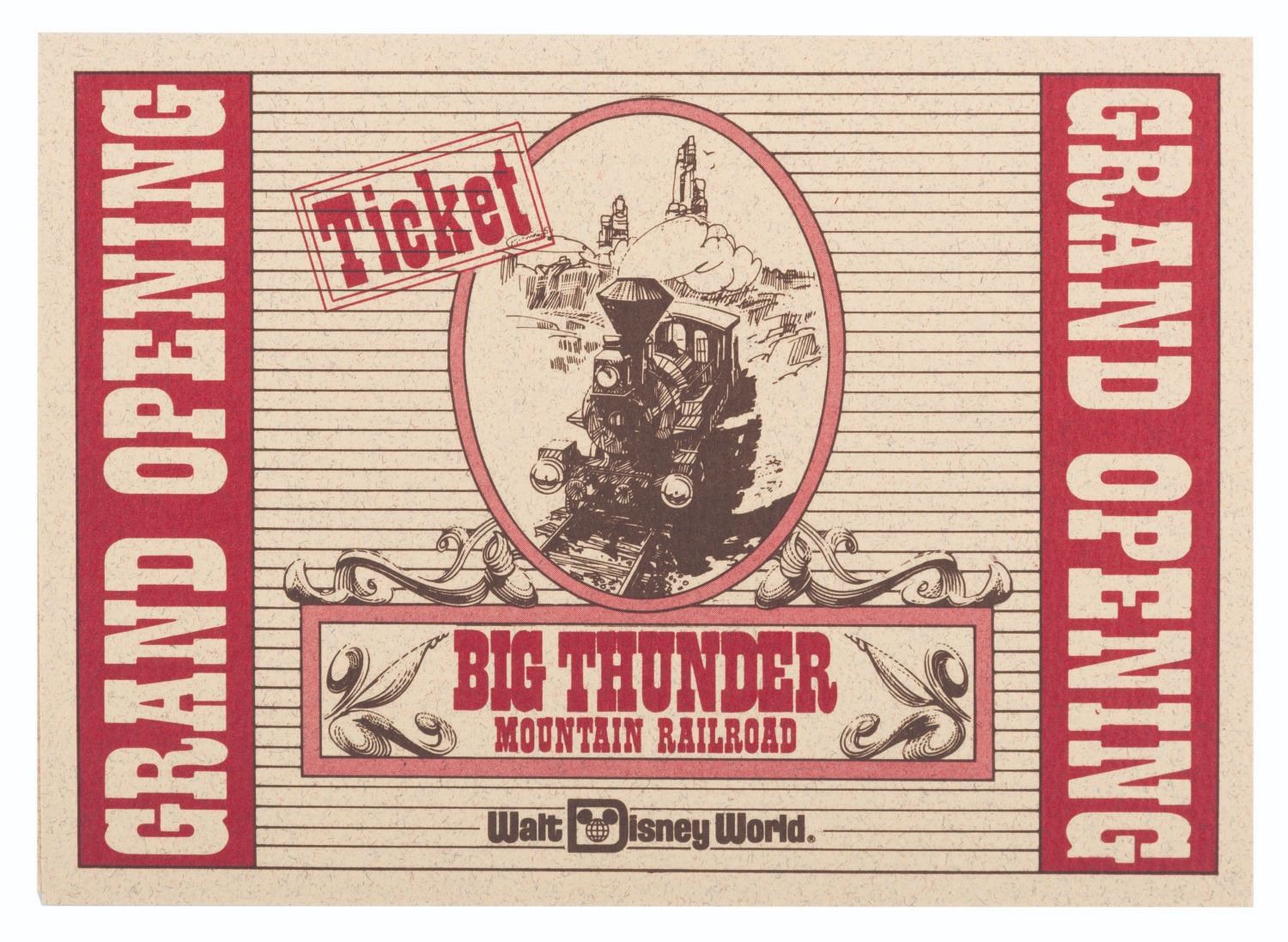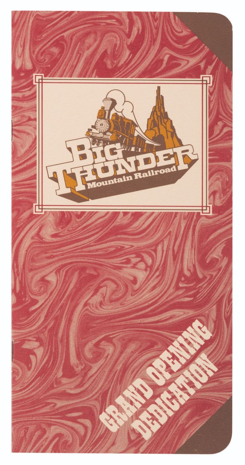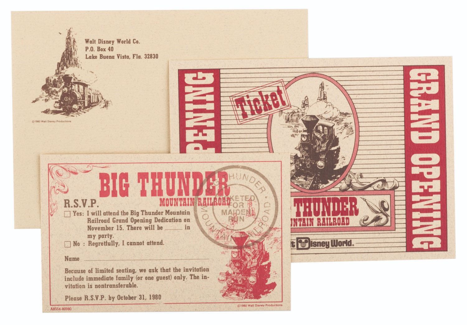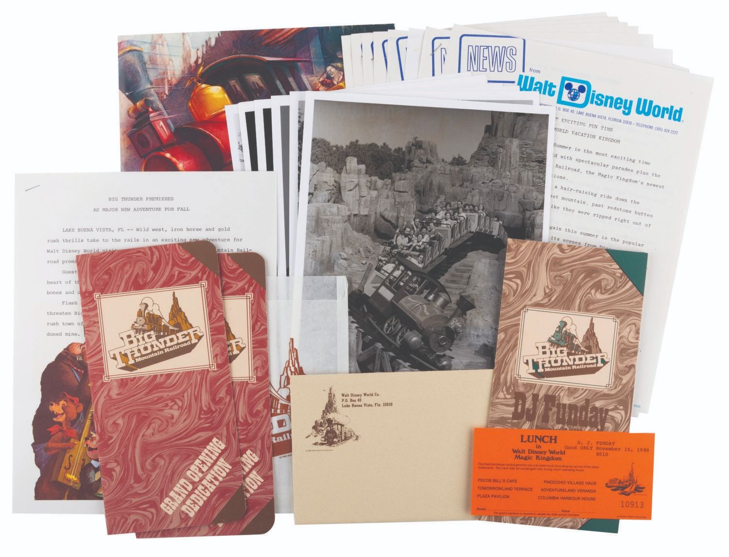 (Walt Disney World, 1980/81) An extremely rare press kit for the opening of Big Thunder Railroad at Walt Disney World's Magic Kingdom. Included are seven 8" x 10" publicity photos of the Magic Kingdom, and seven press releases with news from the Park and information on the attractions' opening. Also included are a very rare unused ticket to the opening day dedication, an unused lunch ticket, two grand opening dedication schedules, and a Big Thunder Railroad-themed merchandise bag. All the items are enclosed in a 9" x 12" Big Thunder-themed folder with a business card from the Park's publicity manager attached. The kit is in very good condition with some light creasing and wear throughout. Overall, it is the best and most complete example we have seen.