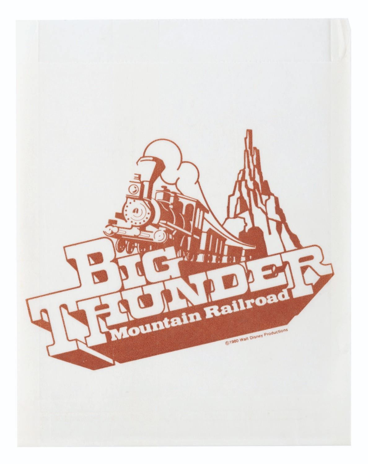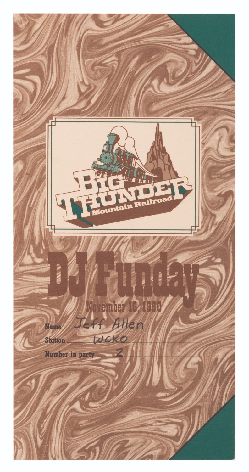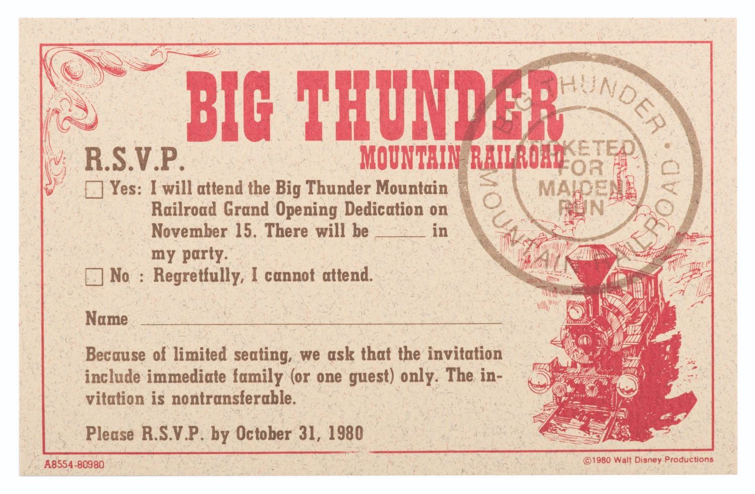 (Walt Disney World, 1980/81) An extremely rare press kit for the opening of Big Thunder Railroad at Walt Disney World's Magic Kingdom. Included are seven 8" x 10" publicity photos of the Magic Kingdom, and seven press releases with news from the Park and information on the attractions' opening. Also included are a very rare unused ticket to the opening day dedication, an unused lunch ticket, two grand opening dedication schedules, and a Big Thunder Railroad-themed merchandise bag. All the items are enclosed in a 9" x 12" Big Thunder-themed folder with a business card from the Park's publicity manager attached. The kit is in very good condition with some light creasing and wear throughout. Overall, it is the best and most complete example we have seen.