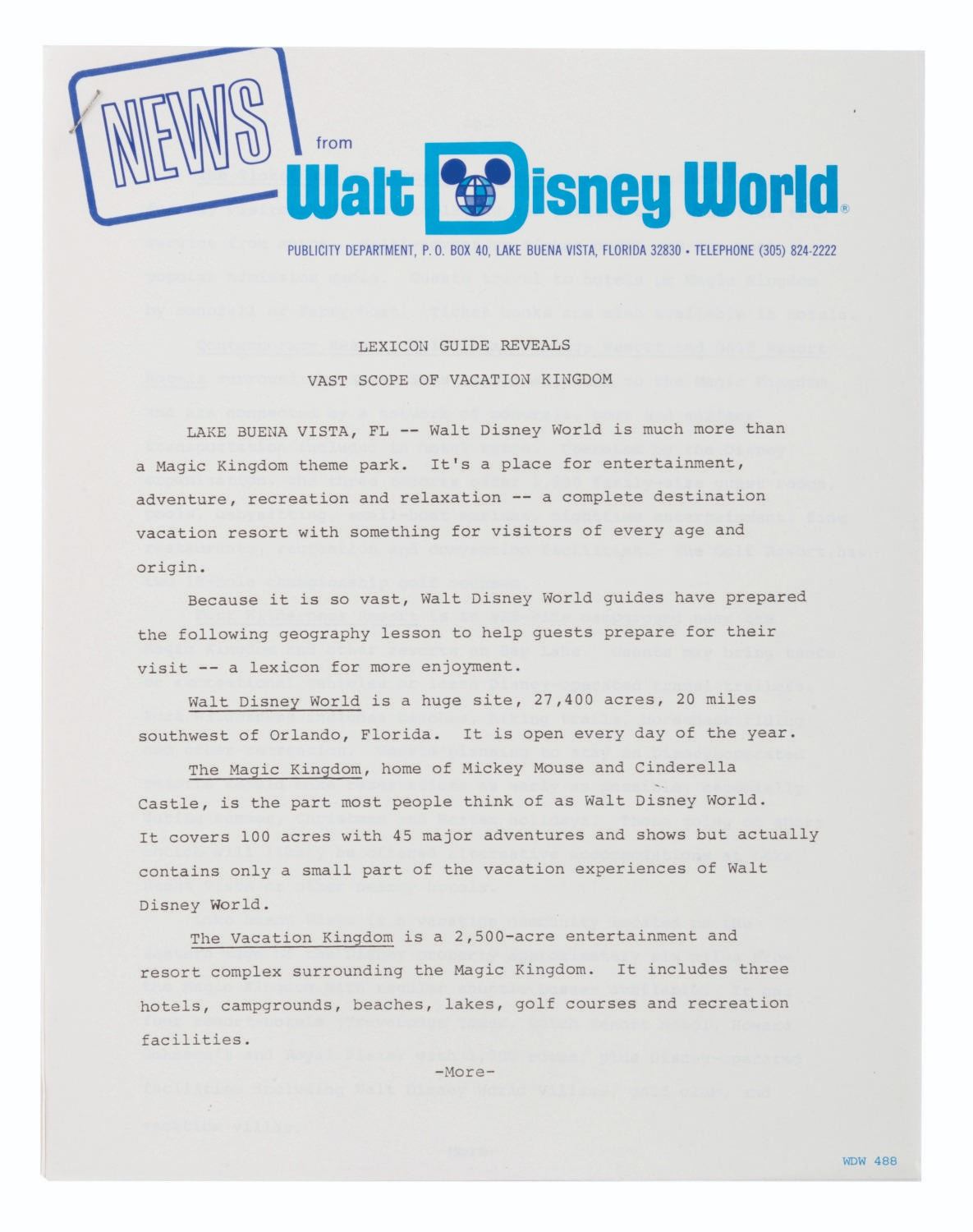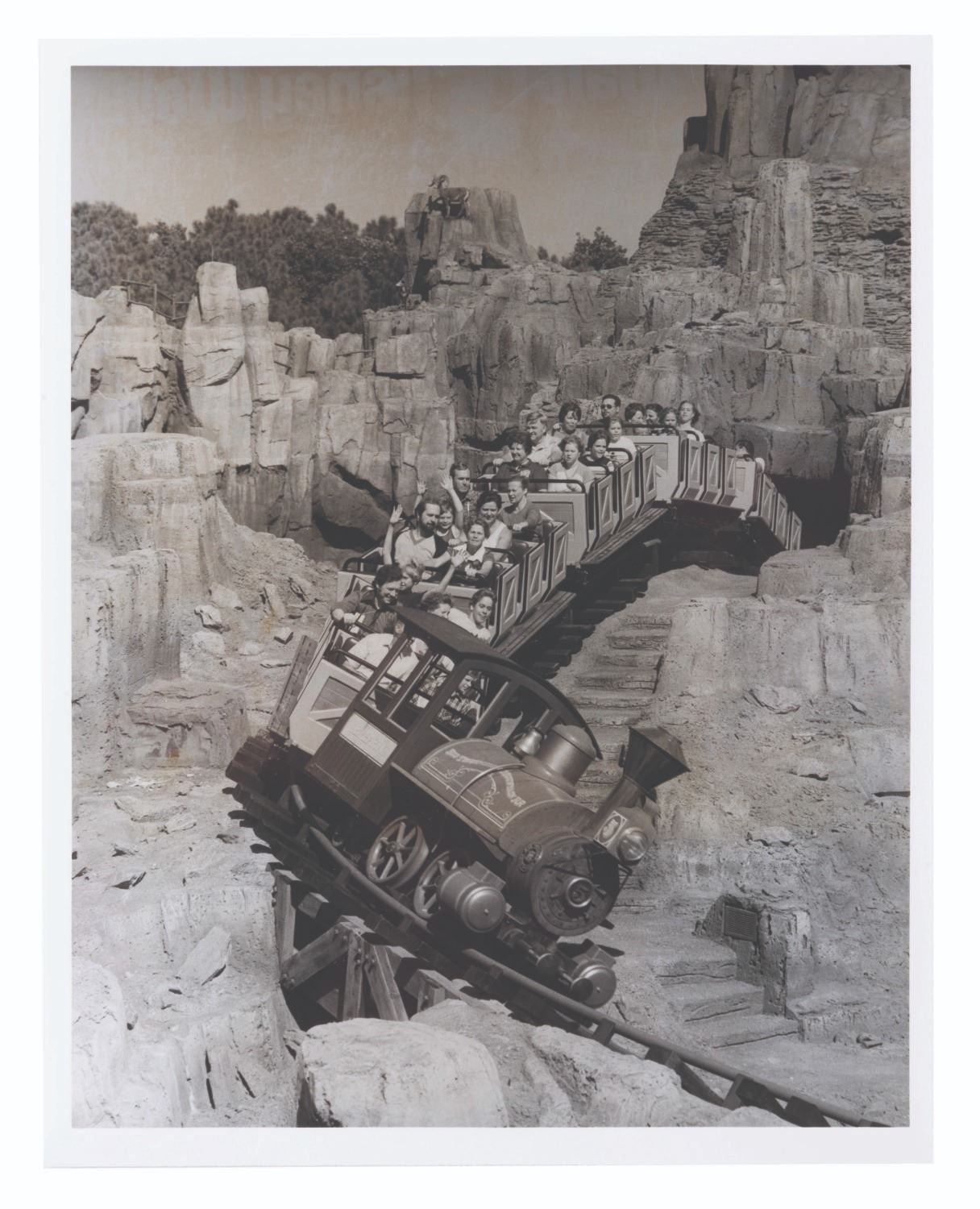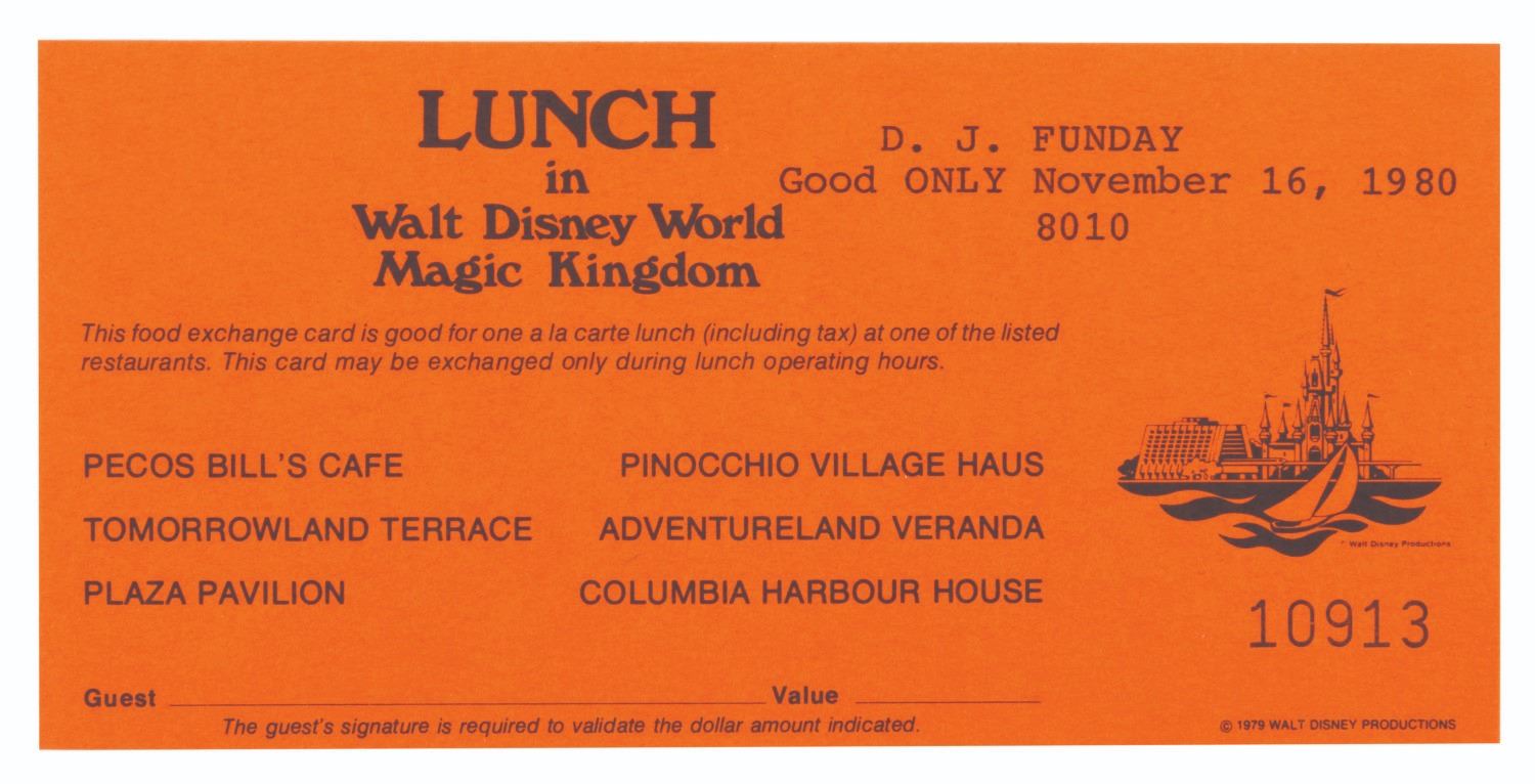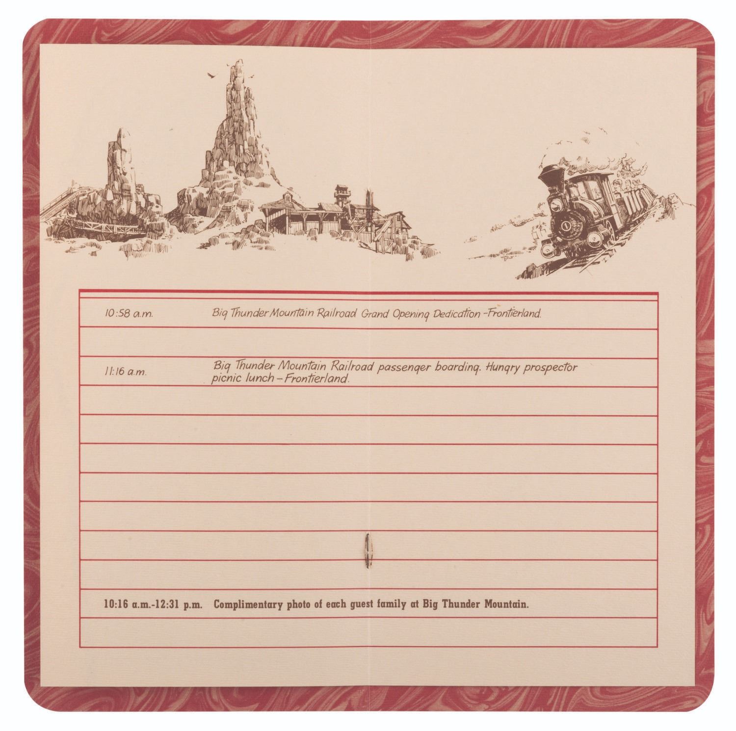 (Walt Disney World, 1980/81) An extremely rare press kit for the opening of Big Thunder Railroad at Walt Disney World's Magic Kingdom. Included are seven 8" x 10" publicity photos of the Magic Kingdom, and seven press releases with news from the Park and information on the attractions' opening. Also included are a very rare unused ticket to the opening day dedication, an unused lunch ticket, two grand opening dedication schedules, and a Big Thunder Railroad-themed merchandise bag. All the items are enclosed in a 9" x 12" Big Thunder-themed folder with a business card from the Park's publicity manager attached. The kit is in very good condition with some light creasing and wear throughout. Overall, it is the best and most complete example we have seen.