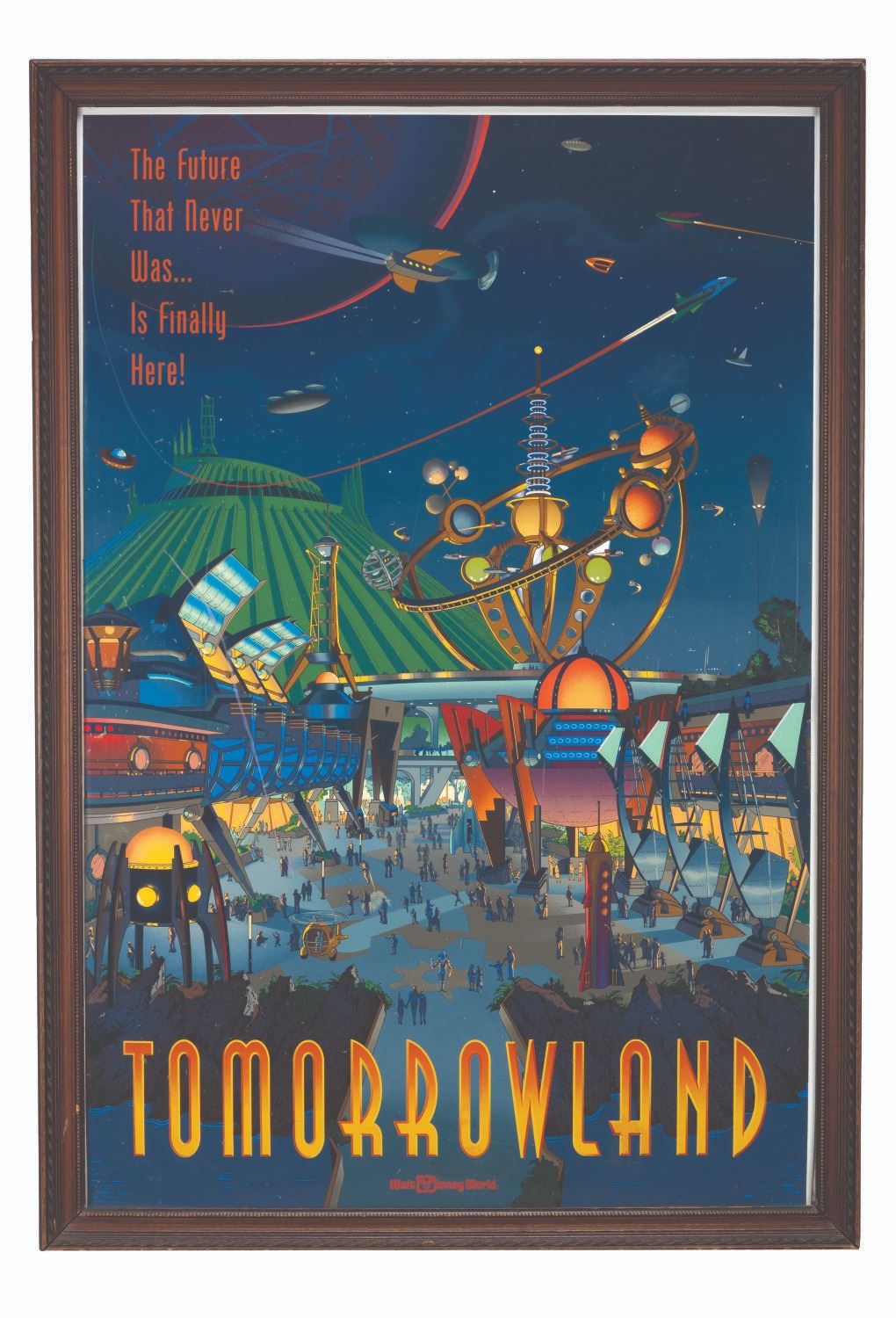 (Walt Disney World, 1995) An extremely rare New Tomorrowland attraction poster from Walt Disney World. Designed by George Stokes and Anne Tryba, the poster is in its original, possibly Park-used frame. The 30" x 40" poster is in very good condition with light wear and has shifted in the frame slightly. The frame is in fair condition with damage to all sides, some separation, and multiple old repairs. This is the only example of this poster we have ever seen offered. Due to size and weight, this item requires special shipping arrangements. Please inquire before bidding.
