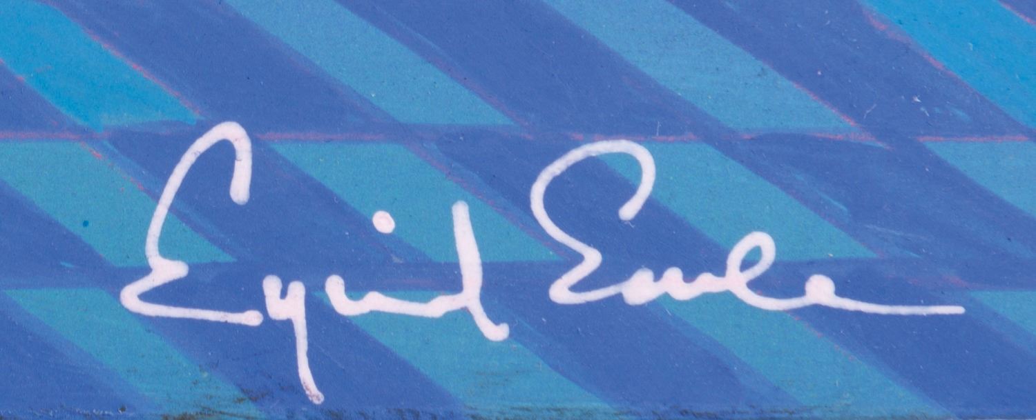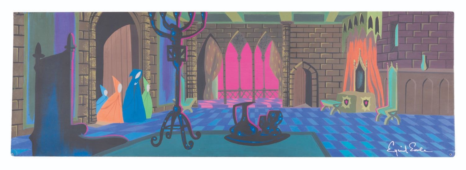 (Disney, 1959) A large original concept painting by Eyvind Earle for Walt Disney's 1959 masterpiece, "Sleeping Beauty." Earle worked on several productions throughout the 1950s, but his work on Sleeping Beauty as both concept artist and color stylist created what many consider the high point of Disney animation. This incredible concept shows fairies Flora, Fauna, and Merriweather stealthily bringing Princess Aurora into the castle as the last rays of the setting sun light the sky pink outside, and the dark tower entrance is before them. Measuring 18" x 6", the gouache on artist’s board painting has been hand-signed by Earle in the lower right and is in fine condition, with pinholes in the corners from original production use.