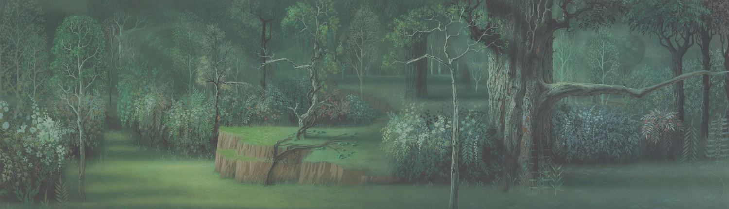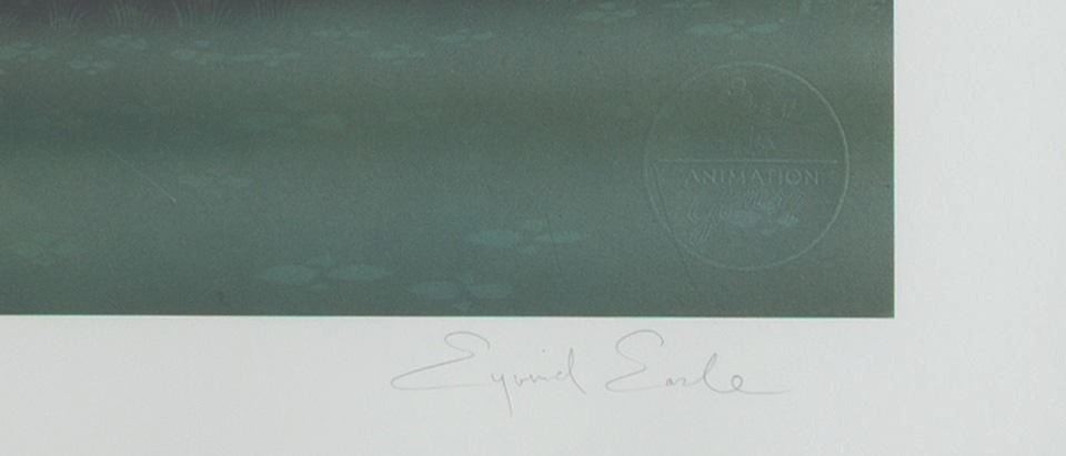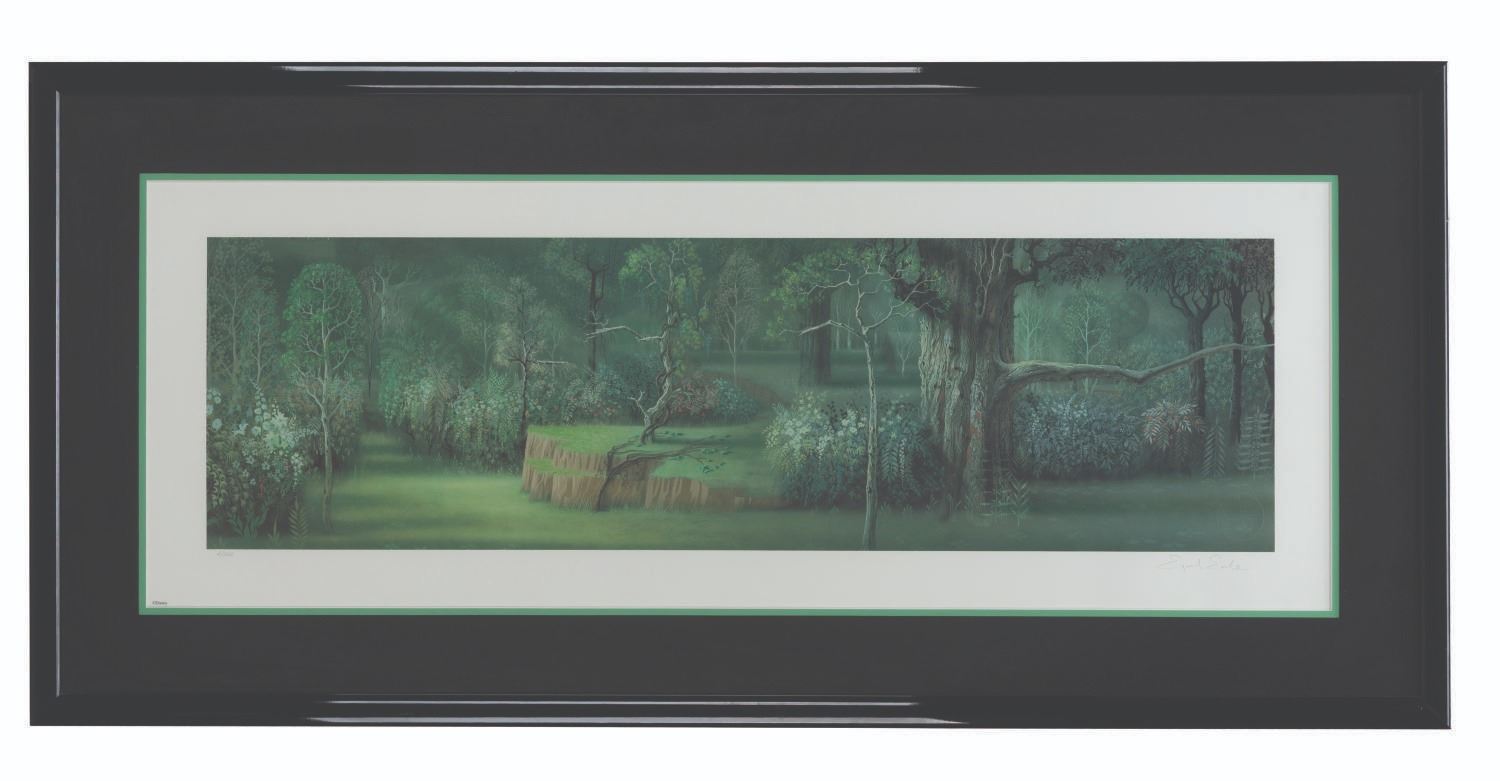 (Disney, 1990s) A rare limited edition print of a forest background from"Sleeping Beauty," signed by Disney Legend Eyvind Earle and hand-numbered 2 of 300. With a matte opening of 13.25" x 37.5" in a 21" x 45" glassless frame, the print is in fine condition, and the frame is in good condition with scratches and wear.