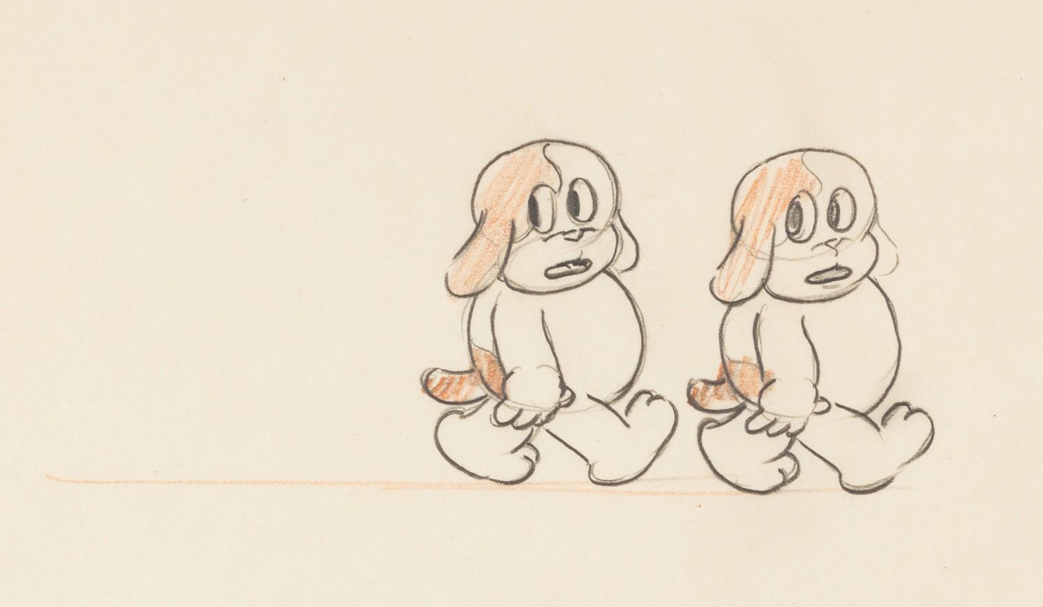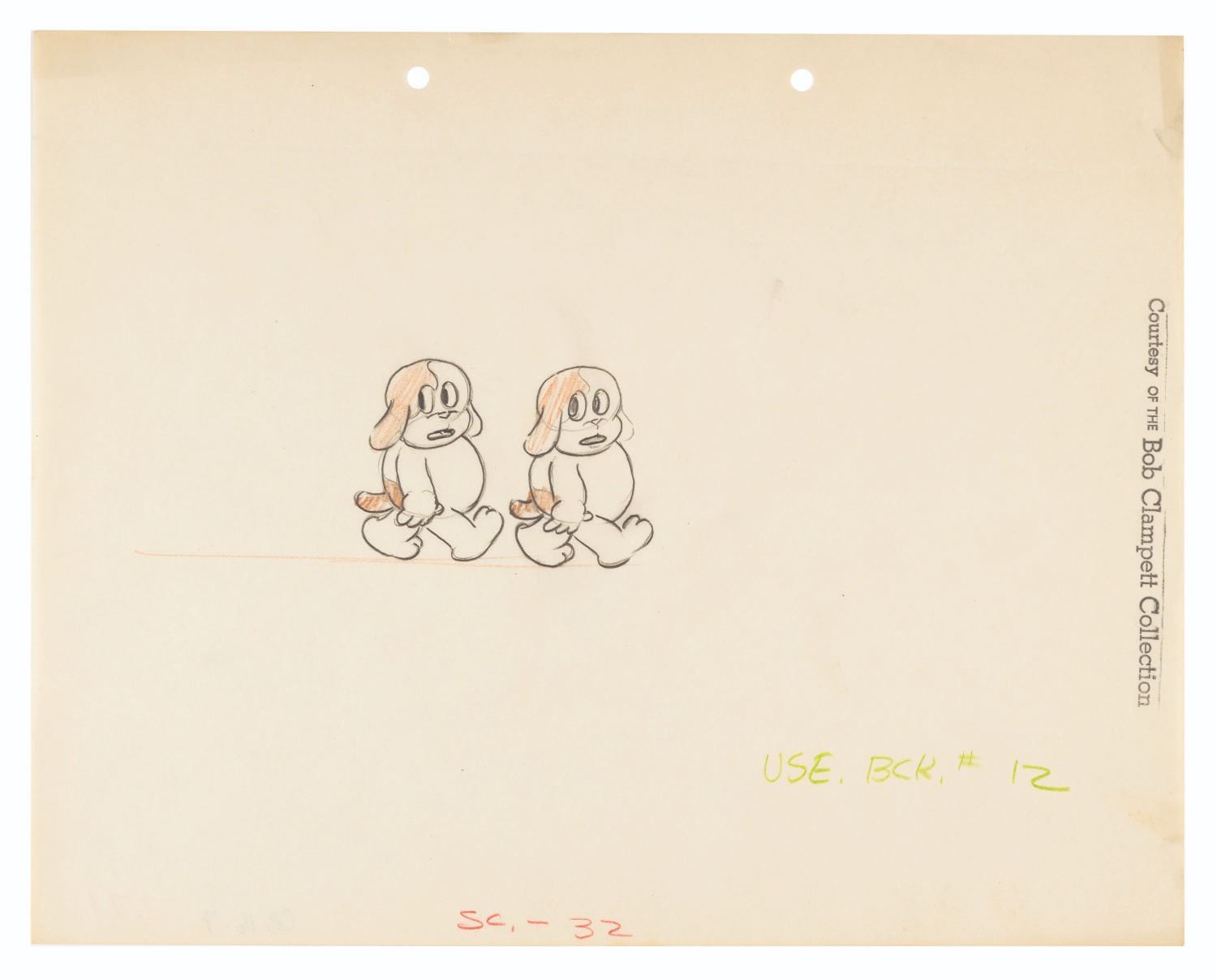 (Schlesinger, 1935) A layout drawing of puppies Ham and Ex from the Merrie Melodies short “I Haven’t Got a Hat.” Accomplished in graphite and colored pencil with an image size of 2.25” x 3.25” on 9.5” x 12” animation paper, the drawing is in very good condition, stamped “Courtesy of the Bob Clampett Collection,” with light soiling and light discoloration from age.