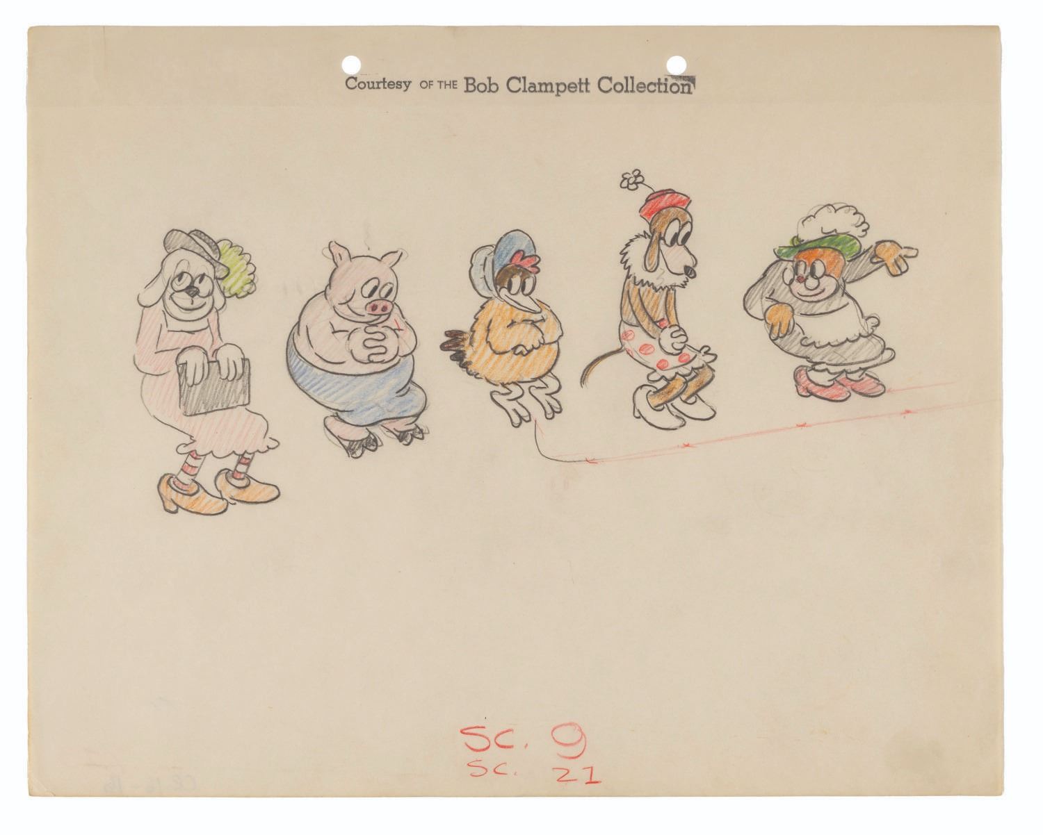 (Schlesinger, 1935) A layout drawing of the class from “I Haven’t Got a Hat.” With an image size of 7.75” x 10.5” on 9.5” x 12” animation paper, the layout drawing accomplished in graphite and colored pencil is in very good condition with light wear from age, and stamped “Courtesy of the Bob Clampett Collection” in the upper right corner.