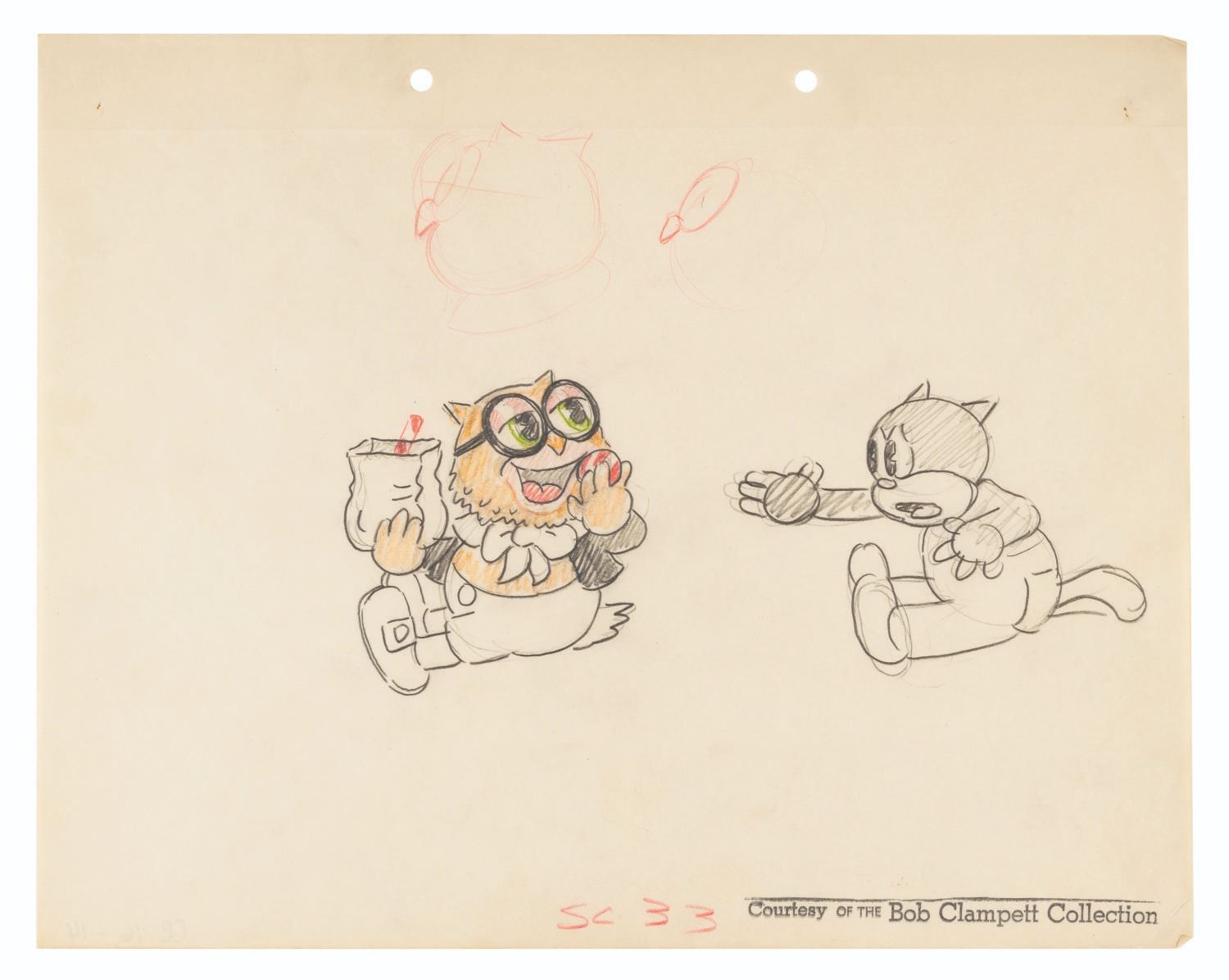 (Schlesinger, 1935) A layout drawing of Oliver Owl and Beans the Cat from the Merrie Melodies short “I Haven’t Got a Hat.” This cartoon was Beans’ first appearance. Accomplished in graphite and colored pencil with image sizes of 3.25” x 3.25” and 3.25” x 4.5” on 9.5” x 12” animation paper, the drawing is in very good condition, stamped “Courtesy of the Bob Clampett Collection,” with light handling wear and light discoloration from age.