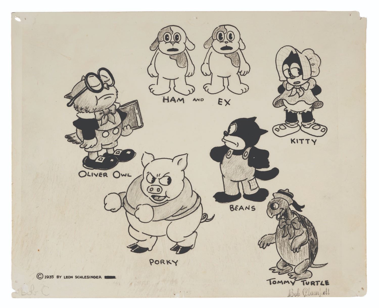 (Schlesinger, 1935) A photo print model sheet of the main characters in “I Haven’t Got a Hat.” This Merrie Melodies cartoon marked the debut of all of these characters, including eventual breakout star Porky Pig. Measuring 8” x 10”, the model sheet is in good production-used condition with torn pin holes, scuffing, and “Bob Clampett” stamped in the lower right corner.