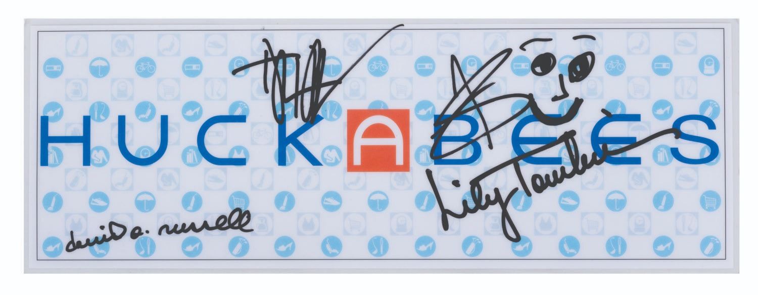 (Fox Searchlight Pictures, 2004) A cast and crew parking placard from the production of I Heart Huckabees, with (4) signatures. The placard, placed on dashboards to identify production vehicles, is signed by actors Dustin Hoffman, Lily Tomlin, and Jason Schwartzman, and director David O. Russell. Measuring 5.5"x15.5", the placard with autographs is in very good condition.
