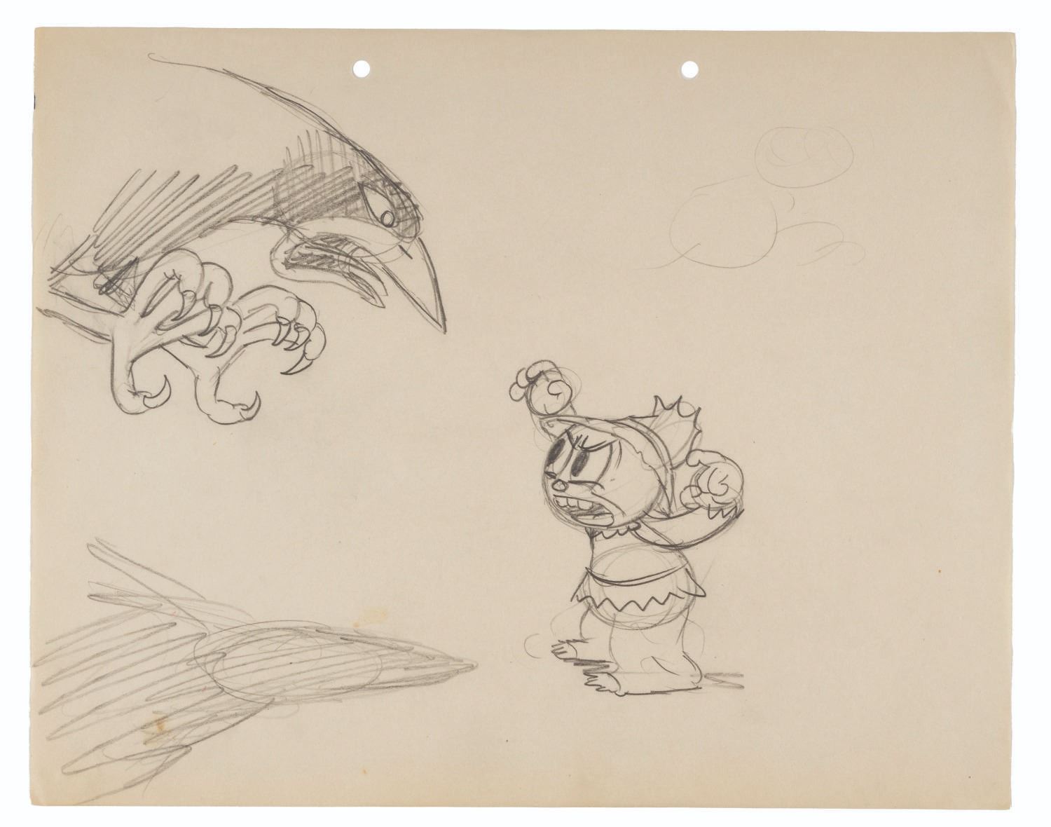 (Schlesinger, 1936) A story drawing featuring the young scarecrow from the Merrie Melodies cartoon “I’d Love to Take Orders From You,” directed by Tex Avery. Avery can be seen in the documentary “Bugs Bunny Superstar” acting out this scene while Clampett filmed it. With an image size of 8.75” x 9”, the drawing accomplished in graphite is in good condition, with light wear from age including slight spotting.