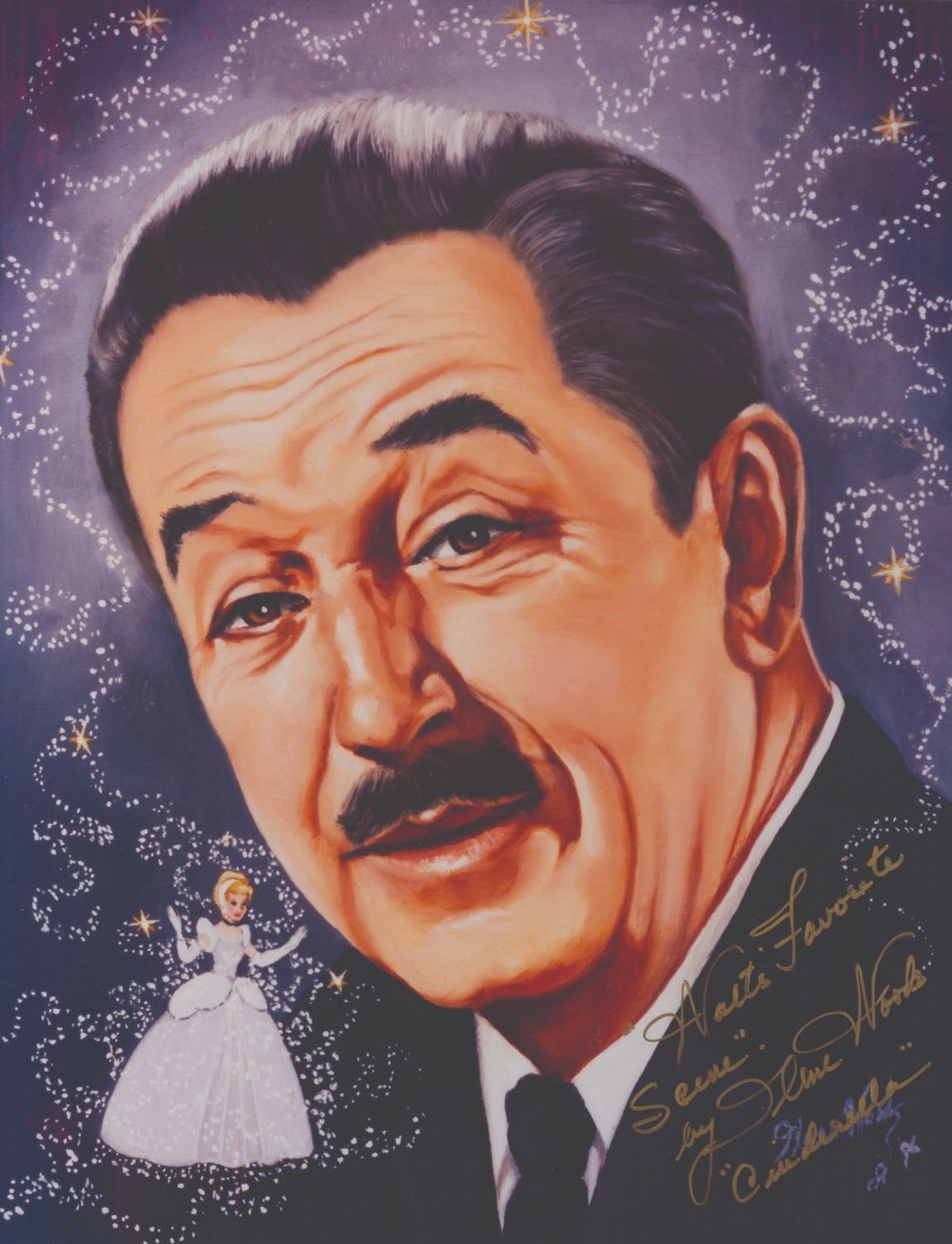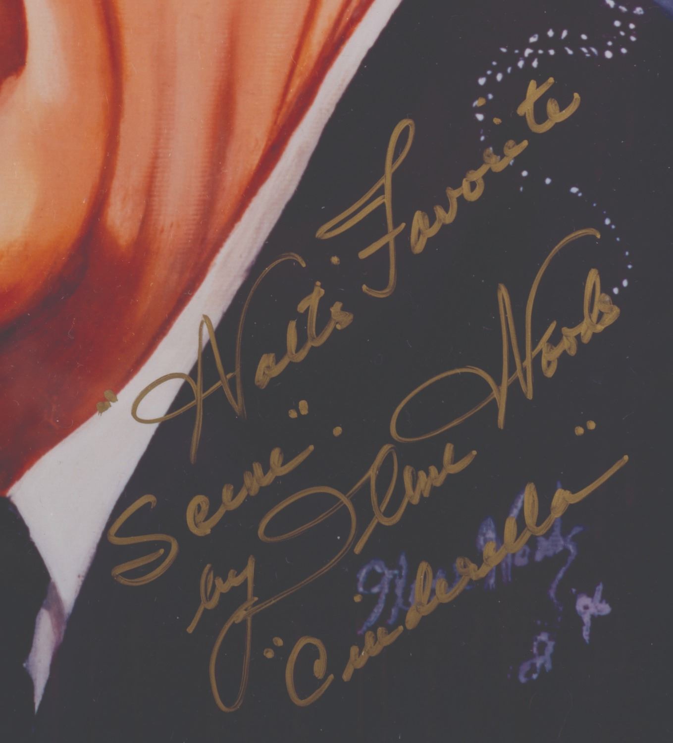 (Woods, 1990s-2000s) A framed print of a Walt Disney and Cinderella painting signed by Disney Legend Ilene Woods, who voiced the Princess in the 1950 animated film. With an image size of 10.5" x 13.5" in a 14.75" x 18.75" framed matte, the print is in fine condition, while the frame displays in very good condition with scratches and wear.