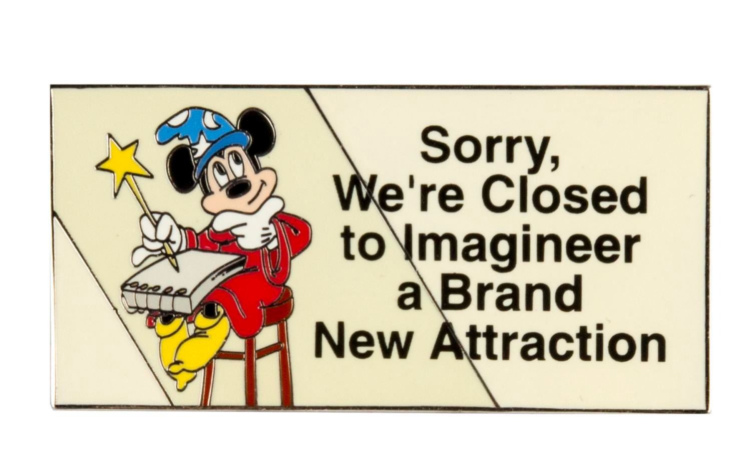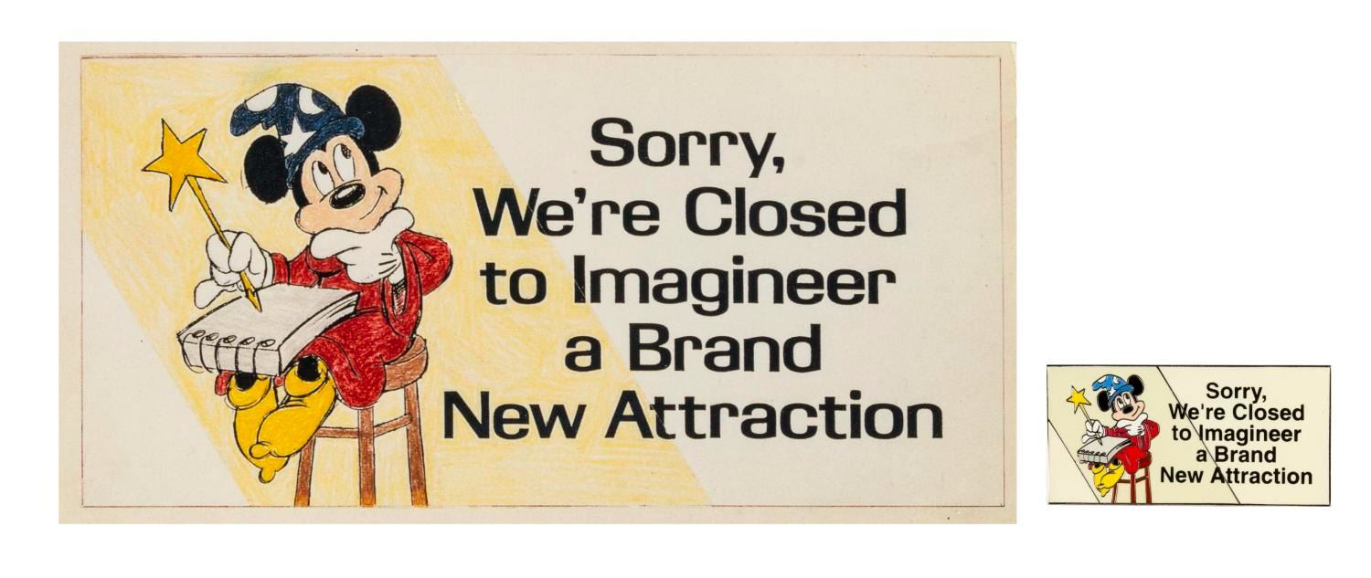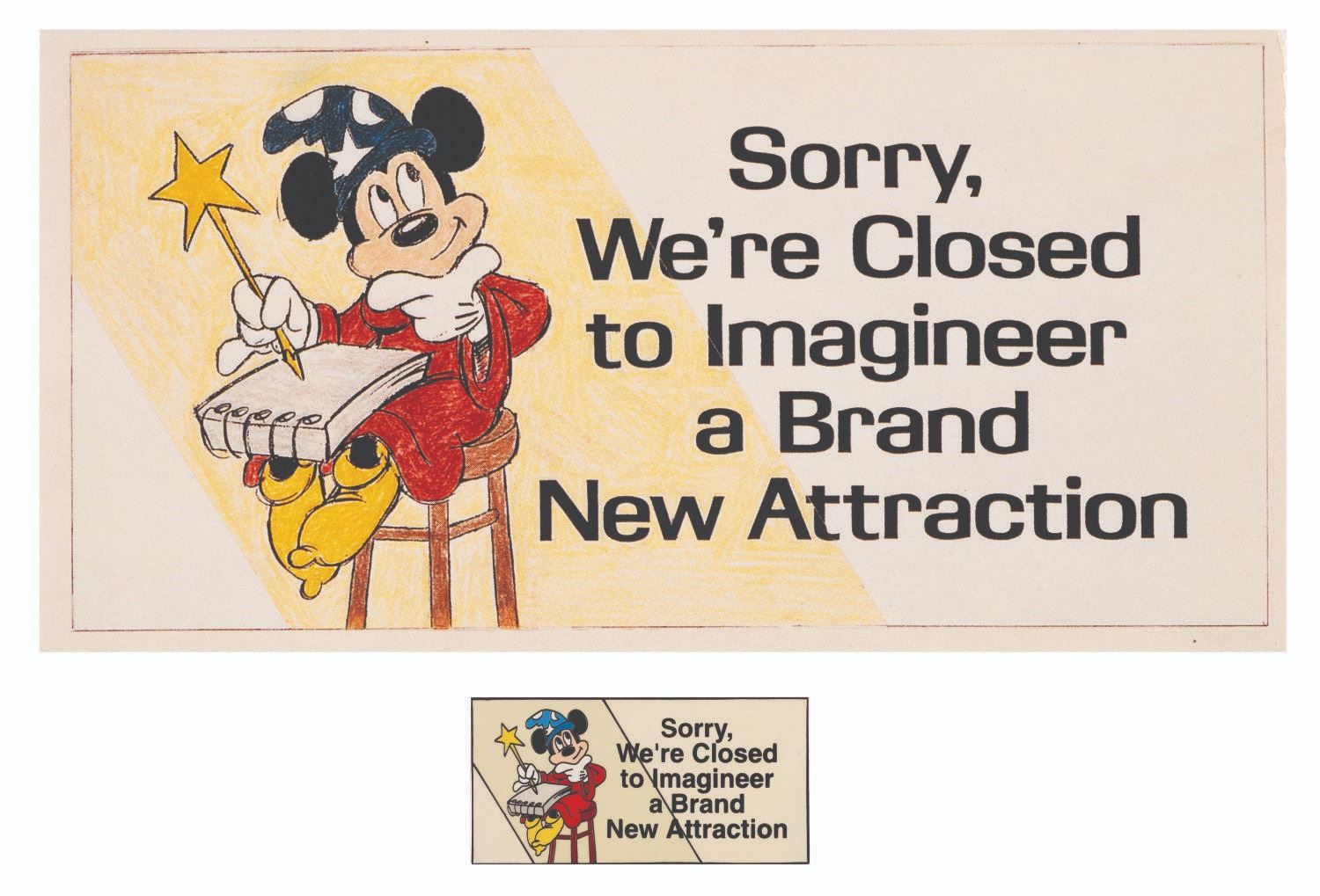 (Disneyland, 1988) A limited edition postcard and pin inspired by Chuck Young's artwork for an Imagineering "We're Closed" sign. The pieces were available to Annual Passholders through the Disney Gallery. The card measures 7.5"x3.75" and the pin is 2"x1". Each piece is in very good condition with minor wear to the postcard's edges.
