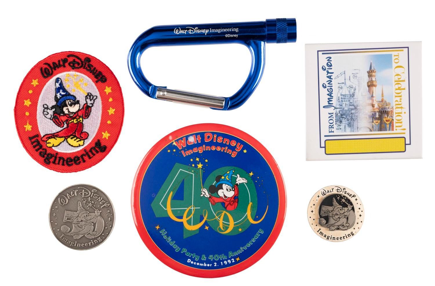 (Imagineering, 1990s-2000s) An Imagineering complimentary souvenir collection. Included are a patch, a "From Imagination to Celebration" button, a "50 Years of Dreaming and Doing" challenge coin and pin, a Holiday party & 40th Anniversary button, and a carabiner LED flashlight (the function of which has not been tested). The flashlight measures 3.75"x2.25", the buttons range from 3.5" in diameter to 2.5"x2.5", the pin is 1.25 in diameter, the coin is 1.5" in diameter, and the patch is 2.75"x2.5". Each piece is in fine-to-very good condition.