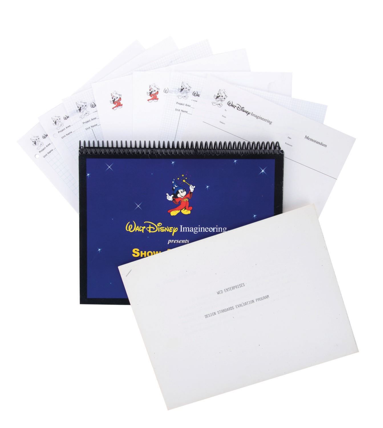 (Walt Disney Imagineering, 2000s-10s) An Imagineering Show Awareness & Design Standards collection. The lot includes a "Walt Disney Imagineering Presents Show Awareness" guide, WED Enterprises Design Standards Evaluation Program document, and (11) blank Walt Disney Imagineering Memorandum and architectural sheets. The materials are in very good condition with few creases, folds, and wear to edges and corners.