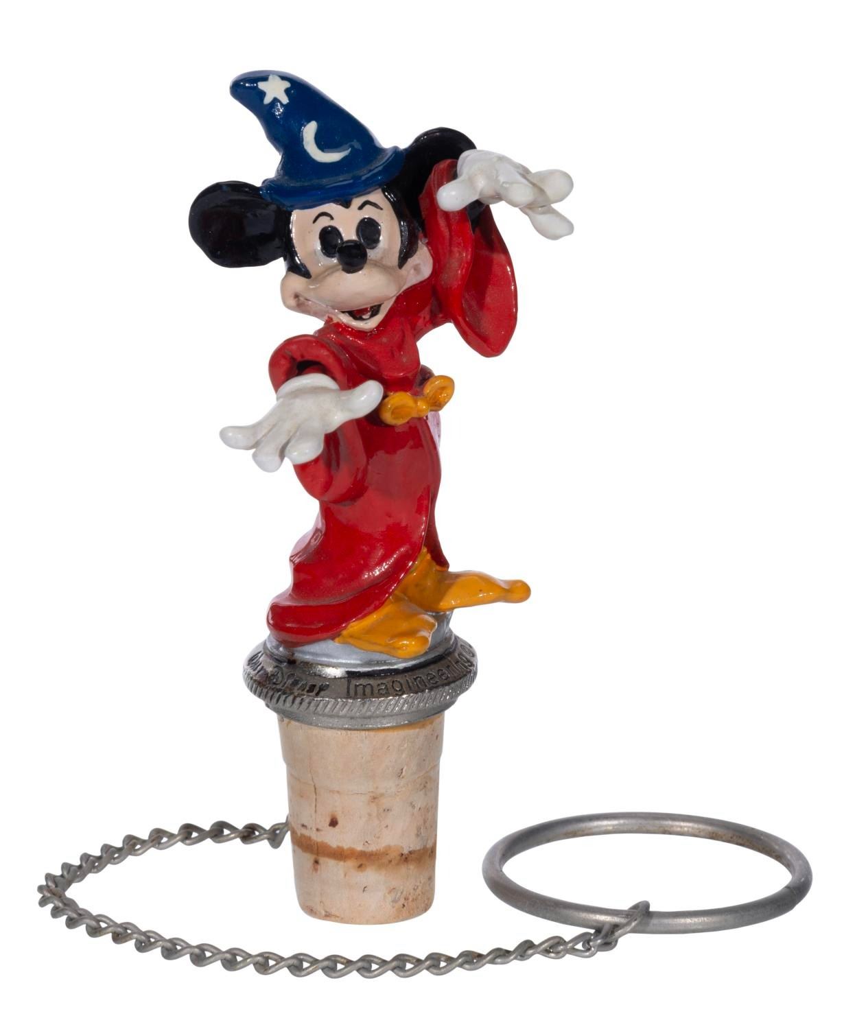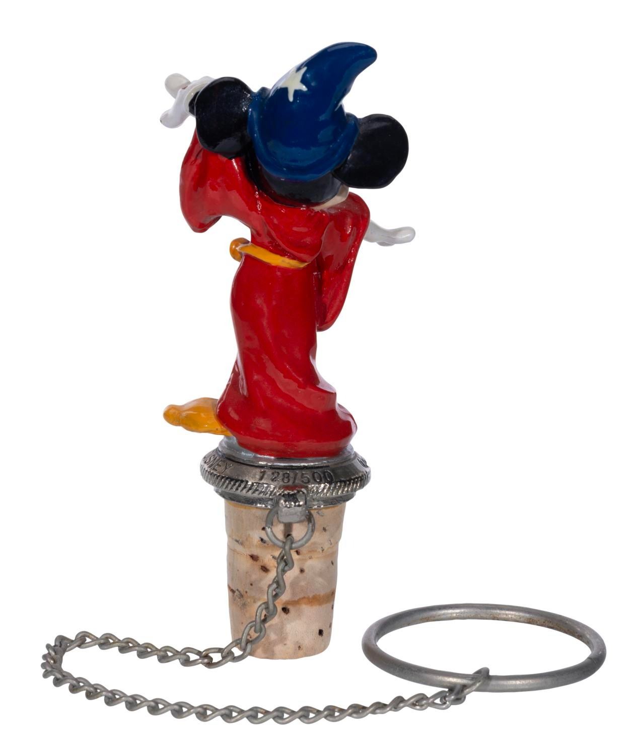 (WDI, 1990s-2000s) A wine stopper topped with a painted metal figure of Mickey Mouse as the Sorcerer's Apprentice, produced in a limited edition of 500 by Walt Disney Imagineering. Measuring 4.25" tall, this stopper numbered 128/500 is in very good condition, with two tiny paint chips to Mickey's left hand.