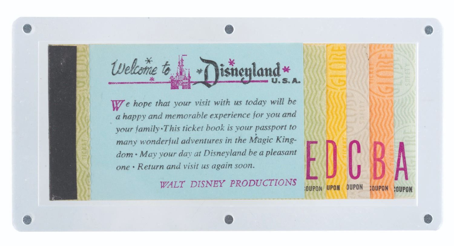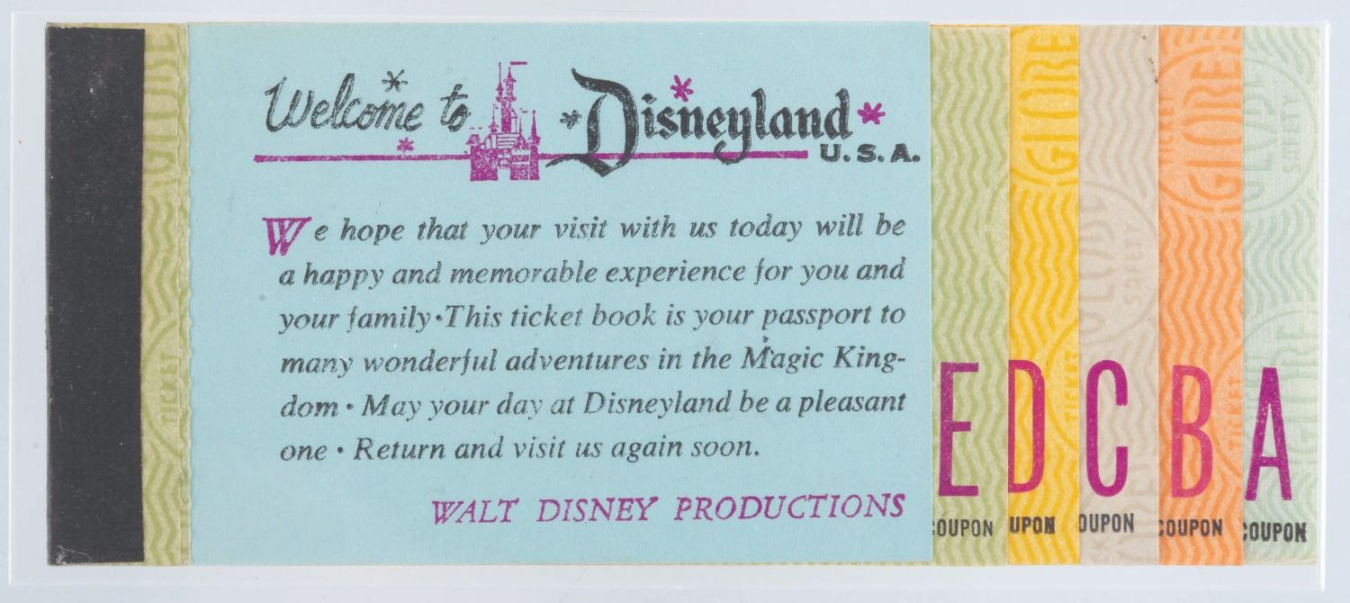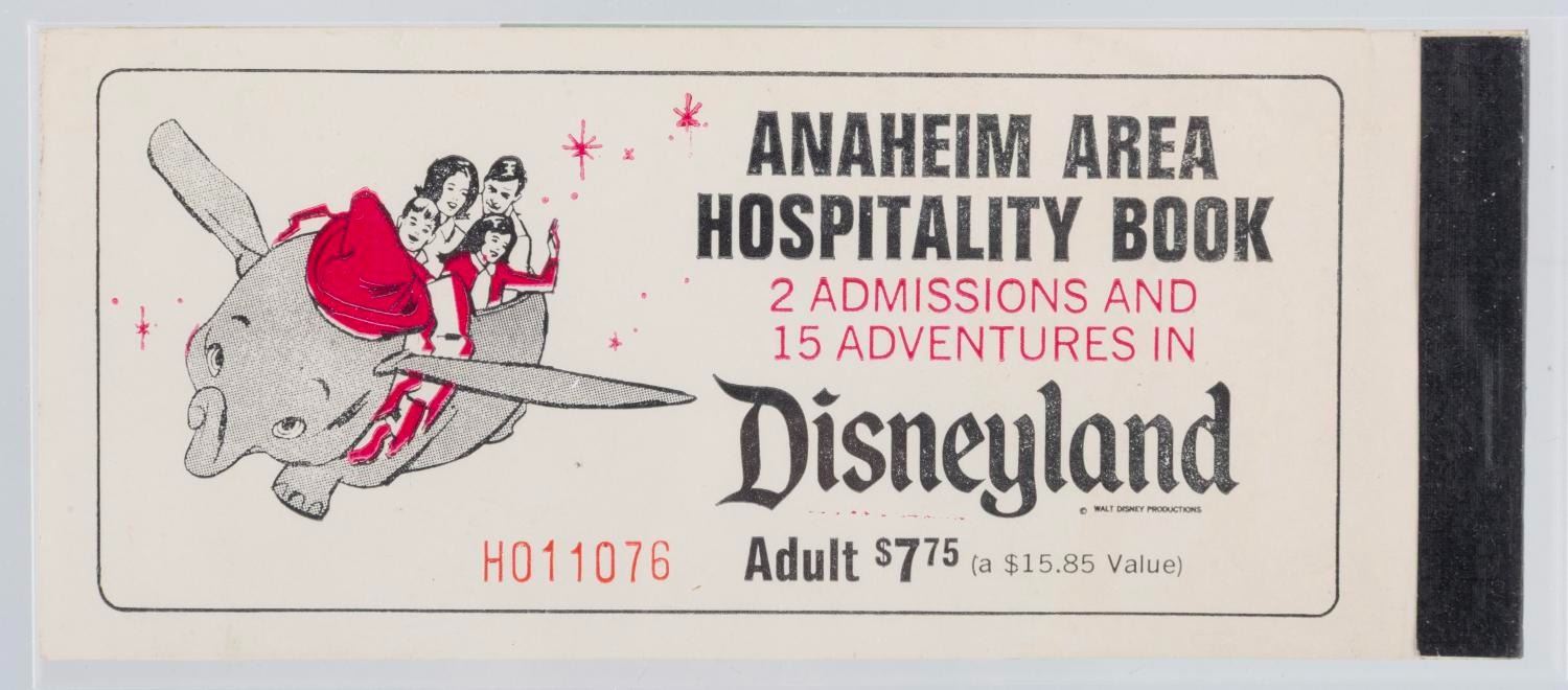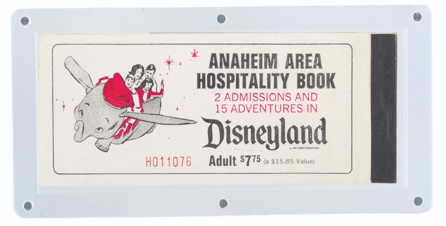 (Disneyland, 1968-69) An incomplete, rare Disneyland Anaheim Area Hospitality Adult Ticket Book. These were sold exclusively to guests of hotels and motels of the Anaheim Area Visitor and Convention Bureau. This ticket book includes the Welcome to Disneyland tab, two detached “A” and “E” tickets, one “B” ticket, three “C” tickets, and one “D” ticket. Missing are the 1st and 2nd day admission tickets, a Great Moments with Mr. Lincoln ticket, four “E” tickets, three “D” tickets, and one “B” ticket. Measuring 2.5” x 6”, the book is in good condition with light wear and ink fading from age.