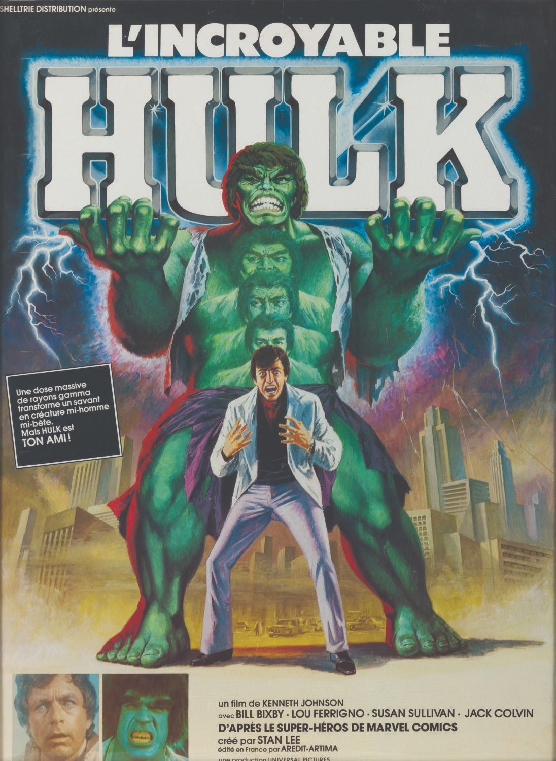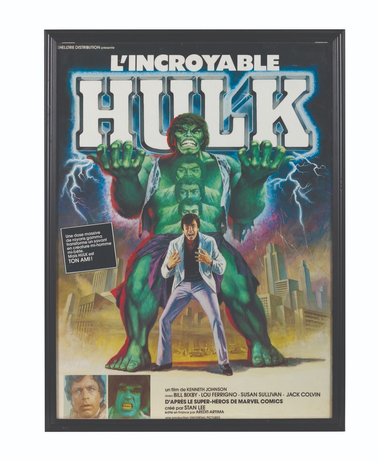 (Shelltrie Distribution, 1977) A rare French poster for “The Incredible Hulk” starring Bill Bixby and Lou Ferrigno. In several foreign markets, such as France, the first two episodes of the television series were edited into a feature film. Measuring 18" x 24", the poster is in good condition with creases, scratches, and wear.