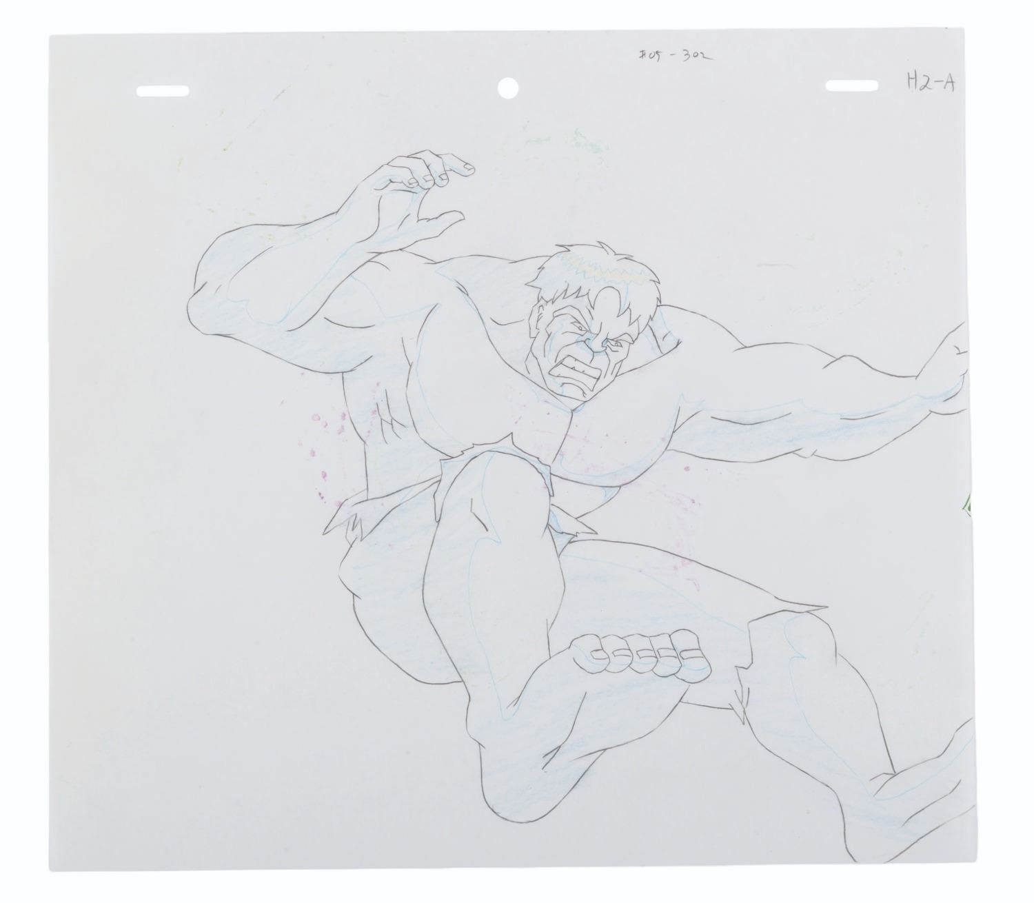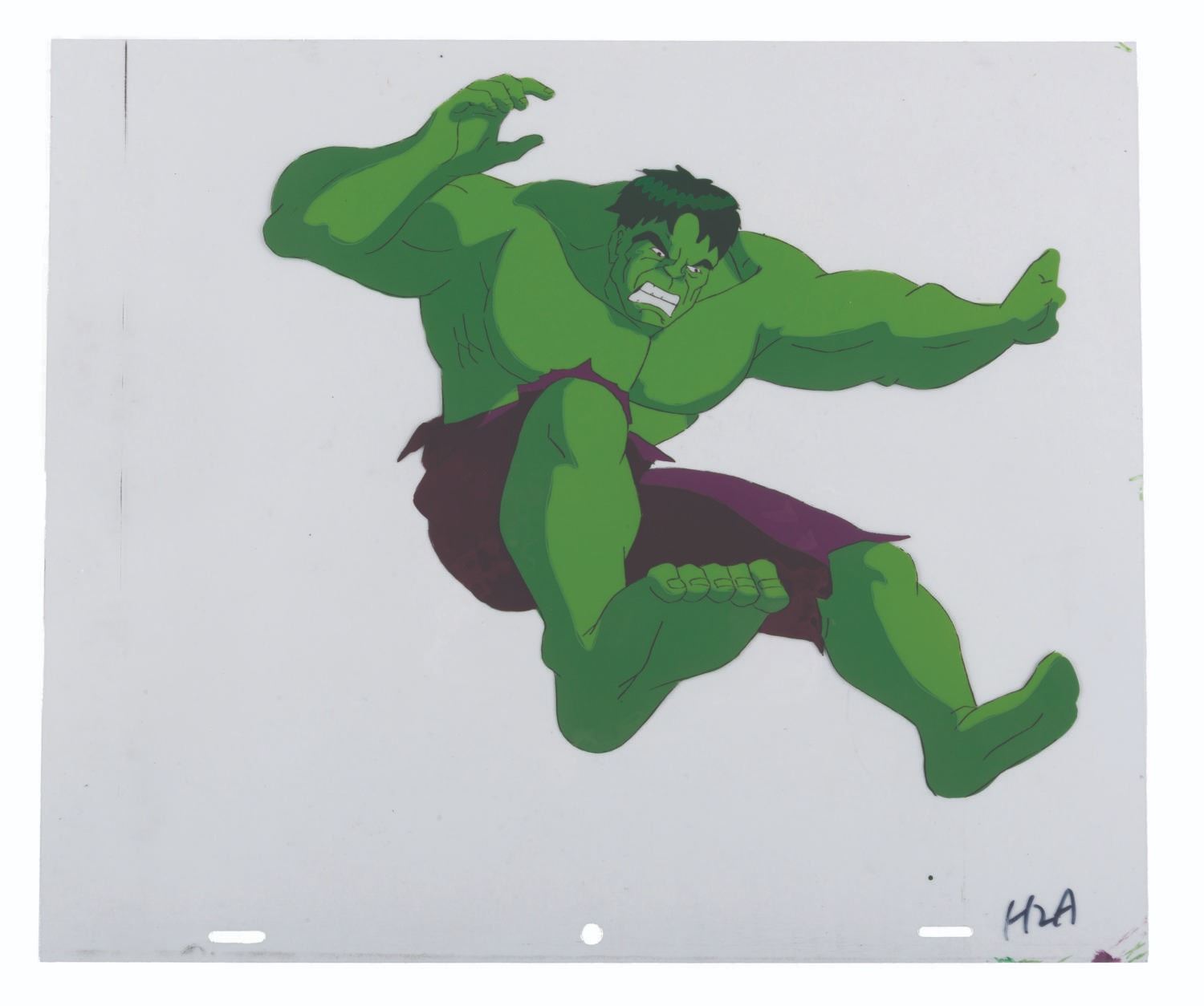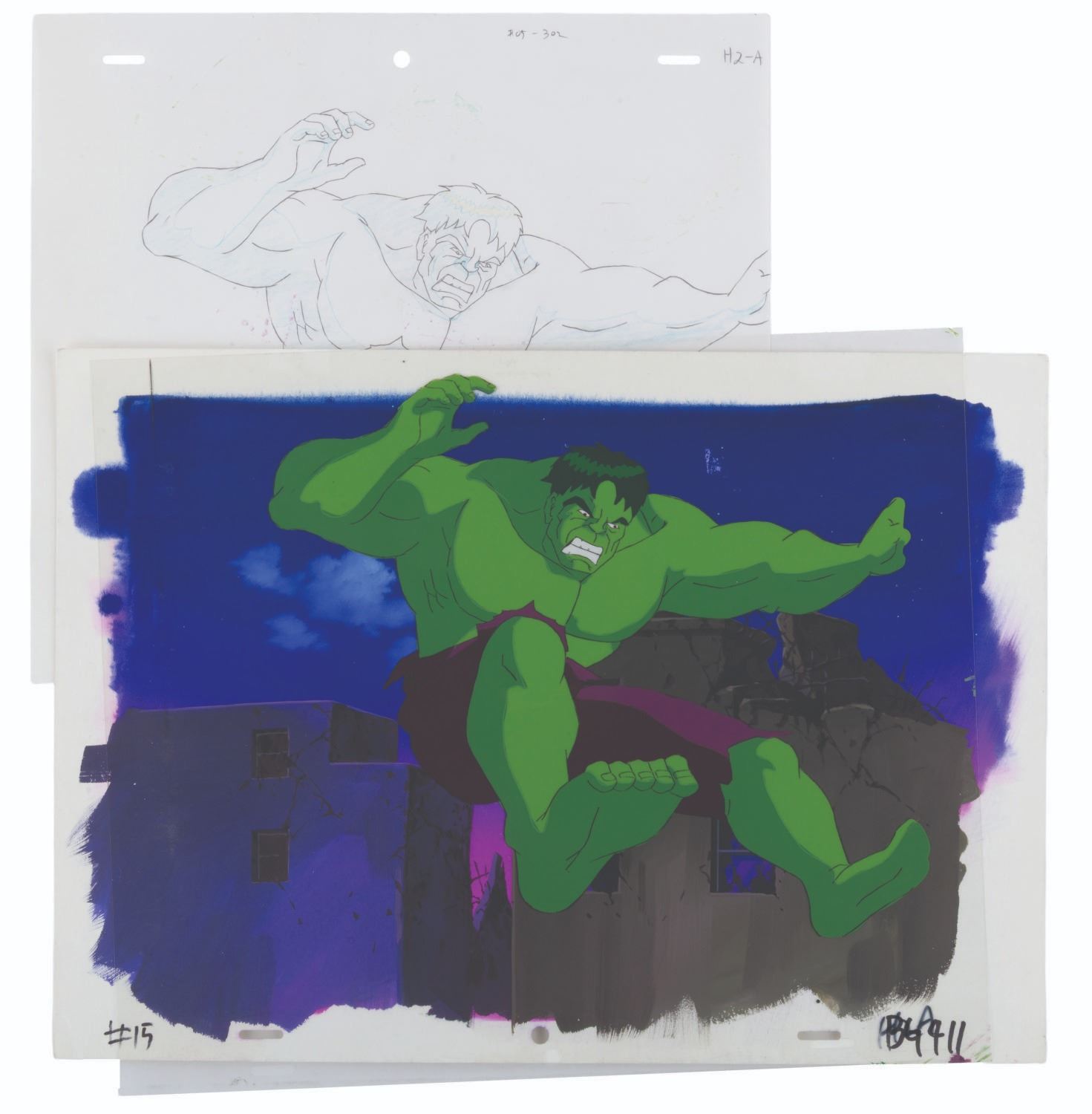 (Marvel, 1996-98) An original production cel and background from the Marvel animated series"The Incredible Hulk." Included is a matching original layout drawing. Hulk has an image size of 8.5" x 9.5" on a 10.5" x 12.5" cel, and the background measures 10.25" x 14.25". The art displays in very good condition with spots of paint loss, light paint transfer, scratches, and wear from production use.