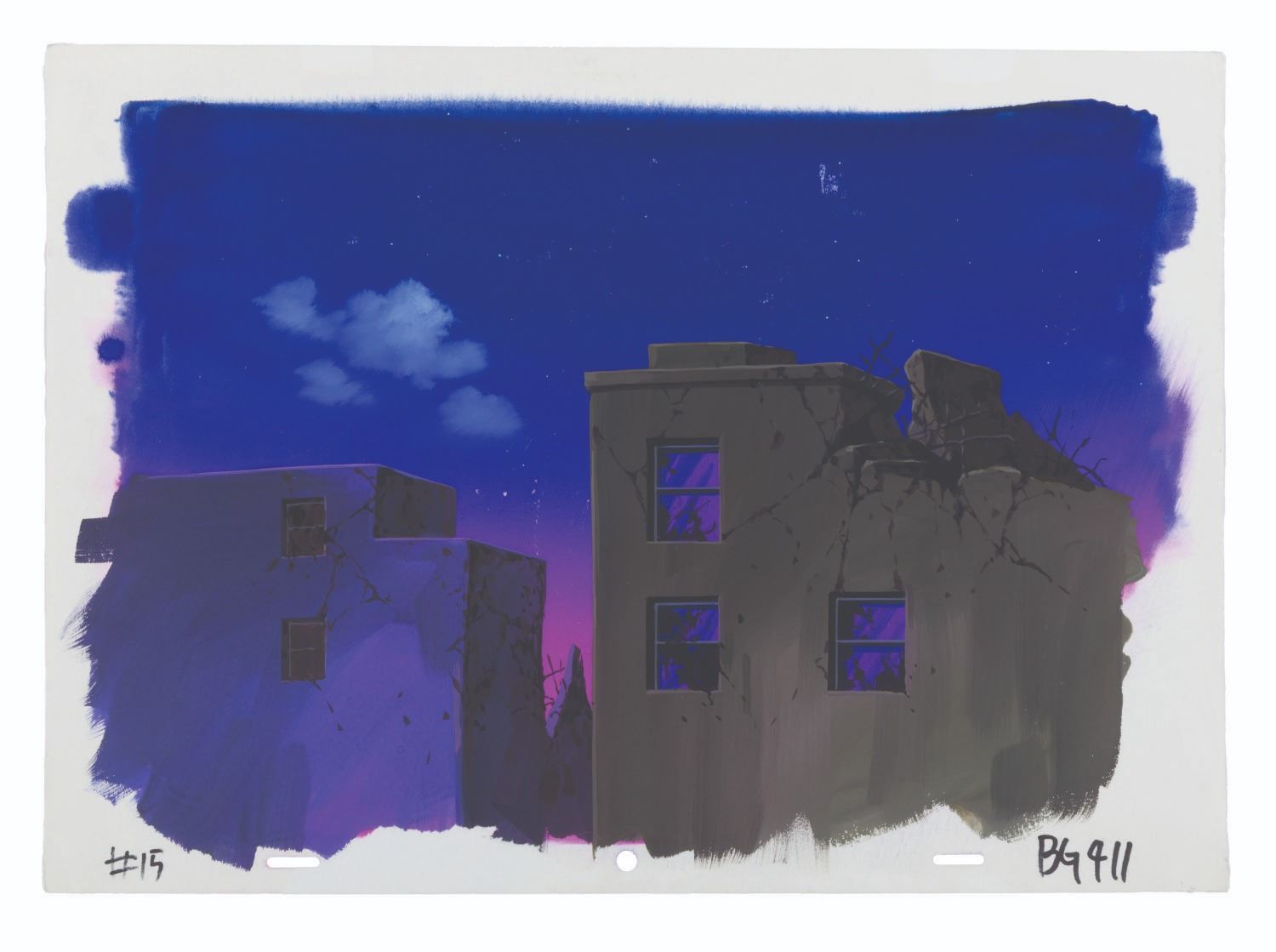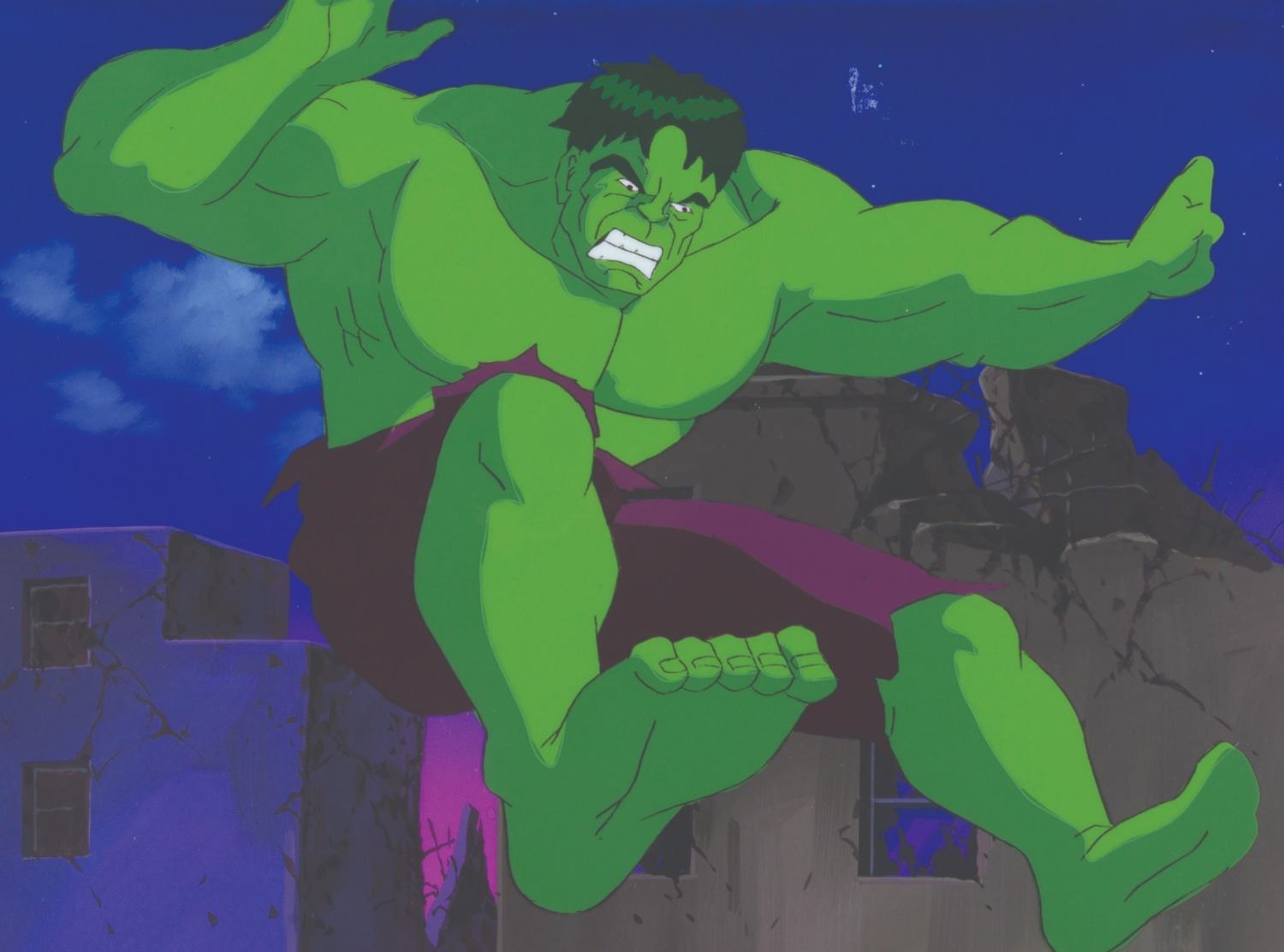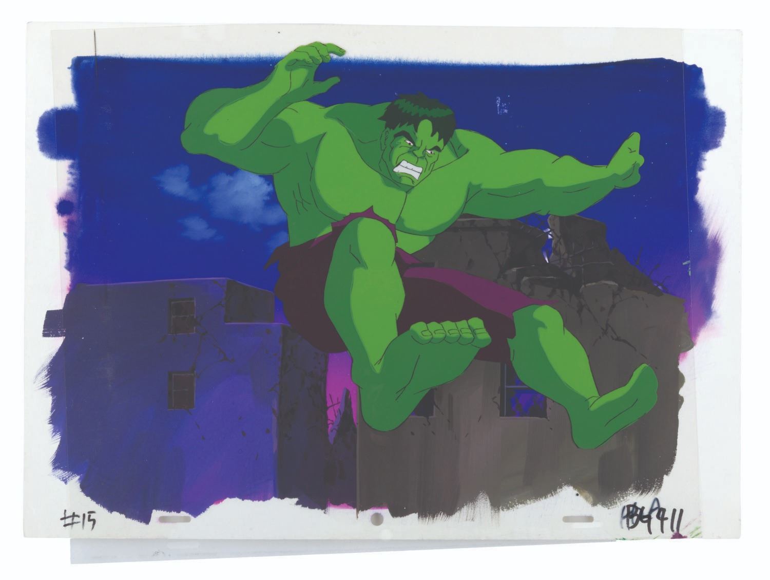 (Marvel, 1996-98) An original production cel and background from the Marvel animated series"The Incredible Hulk." Included is a matching original layout drawing. Hulk has an image size of 8.5" x 9.5" on a 10.5" x 12.5" cel, and the background measures 10.25" x 14.25". The art displays in very good condition with spots of paint loss, light paint transfer, scratches, and wear from production use.