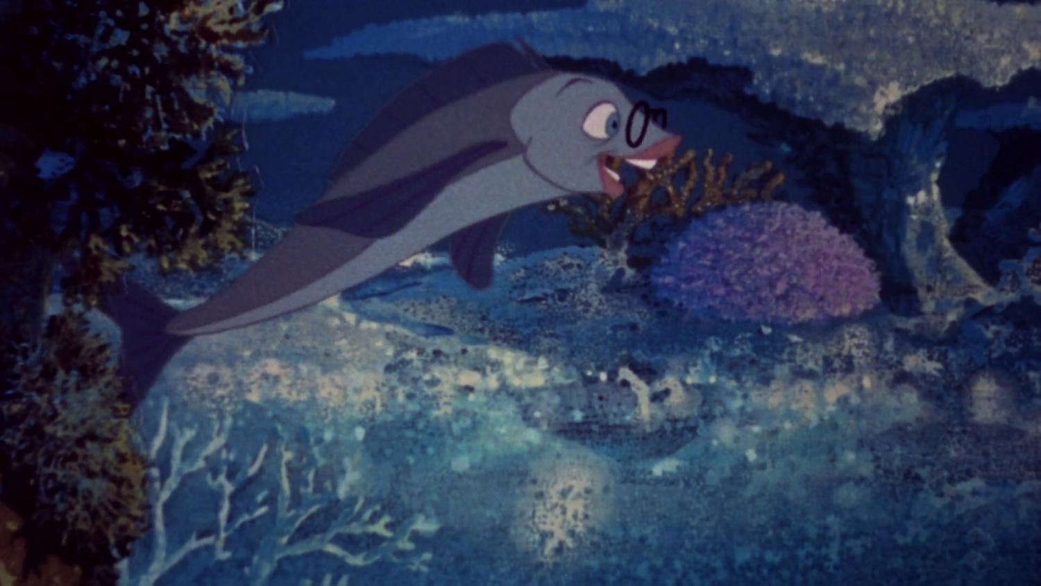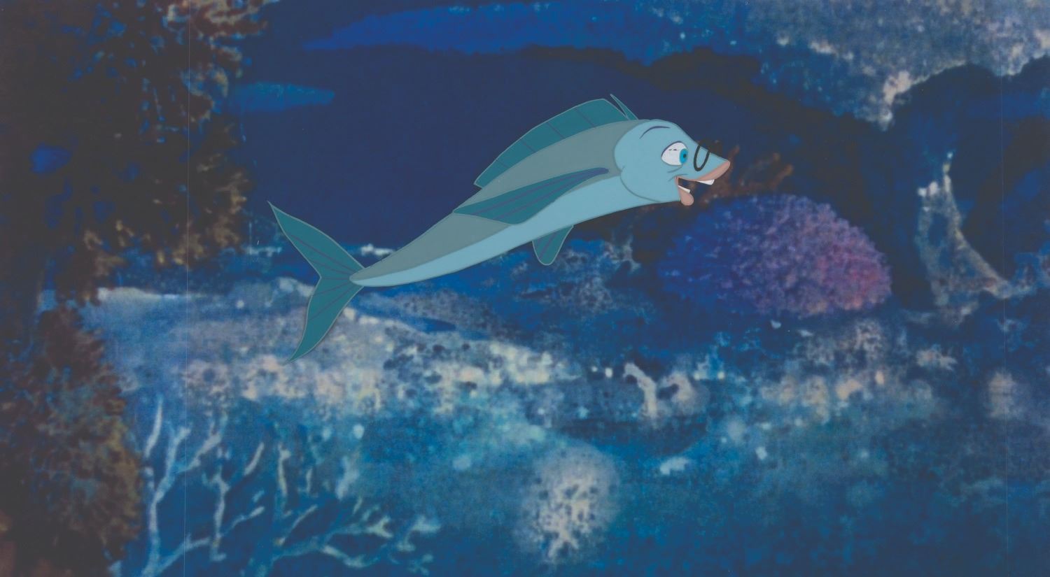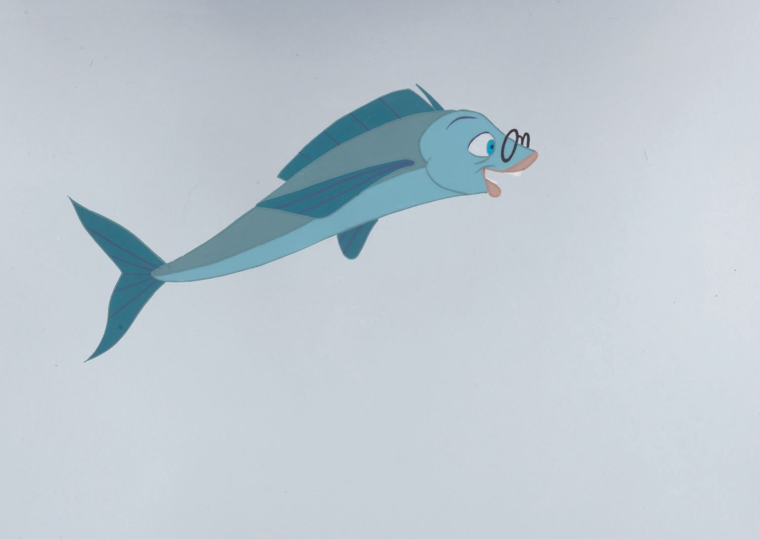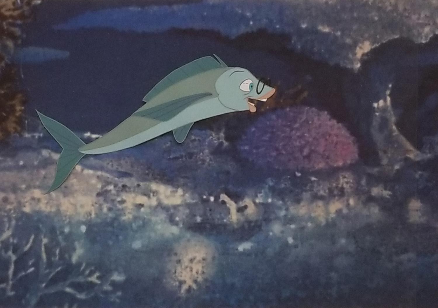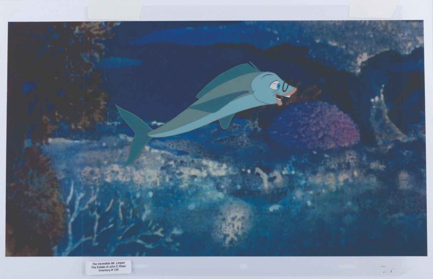 (Warner Bros., 1964) An original hand-painted production cel of Mr. Limpet from the Don Knotts live-action and animated film "The Incredible Mr. Limpet." Mr. Limpet has an image size of 4.25” x 7” on a 10.5” x 12.5” cel, paired with an 11” x 17” printed reproduction background. The piece displays in very good condition with light scratches, paint cracks, and spots of paint loss, notably on the eye.