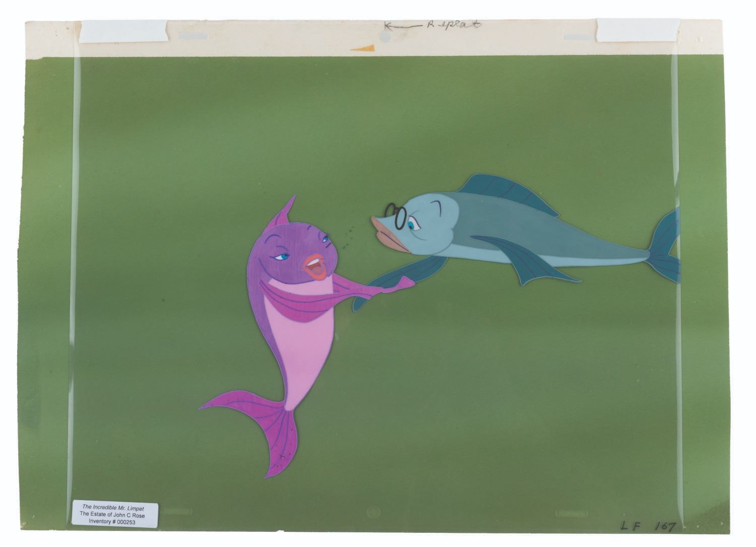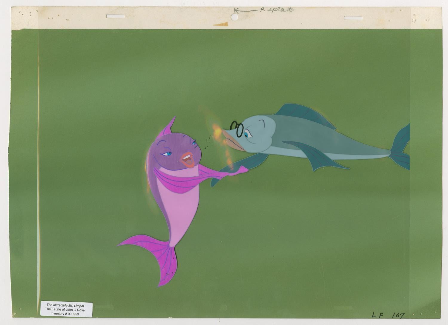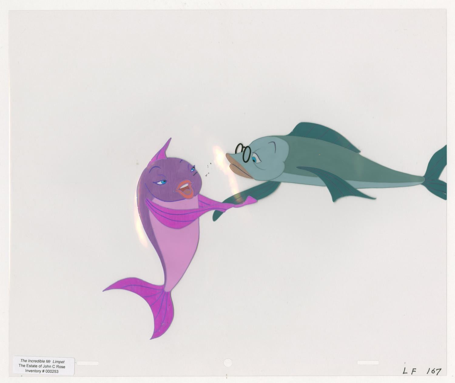 (Warner Bros., 1964) An original production cel of Mr. Limpet and Ladyfish with an original background painting from “The Incredible Mr. Limpet.” Mr. Limpet and Ladyfish have an image size of 6.5” x 9.75” on a 10.5” x 12.5” cel. The trimmed background painting measures 10.5” x 14.75”. The hand-painted cel is in good condition with light scratches, wear, and spots of paint loss. The background is in very good condition with discoloration at the bottom right corner and pinholes from production use.