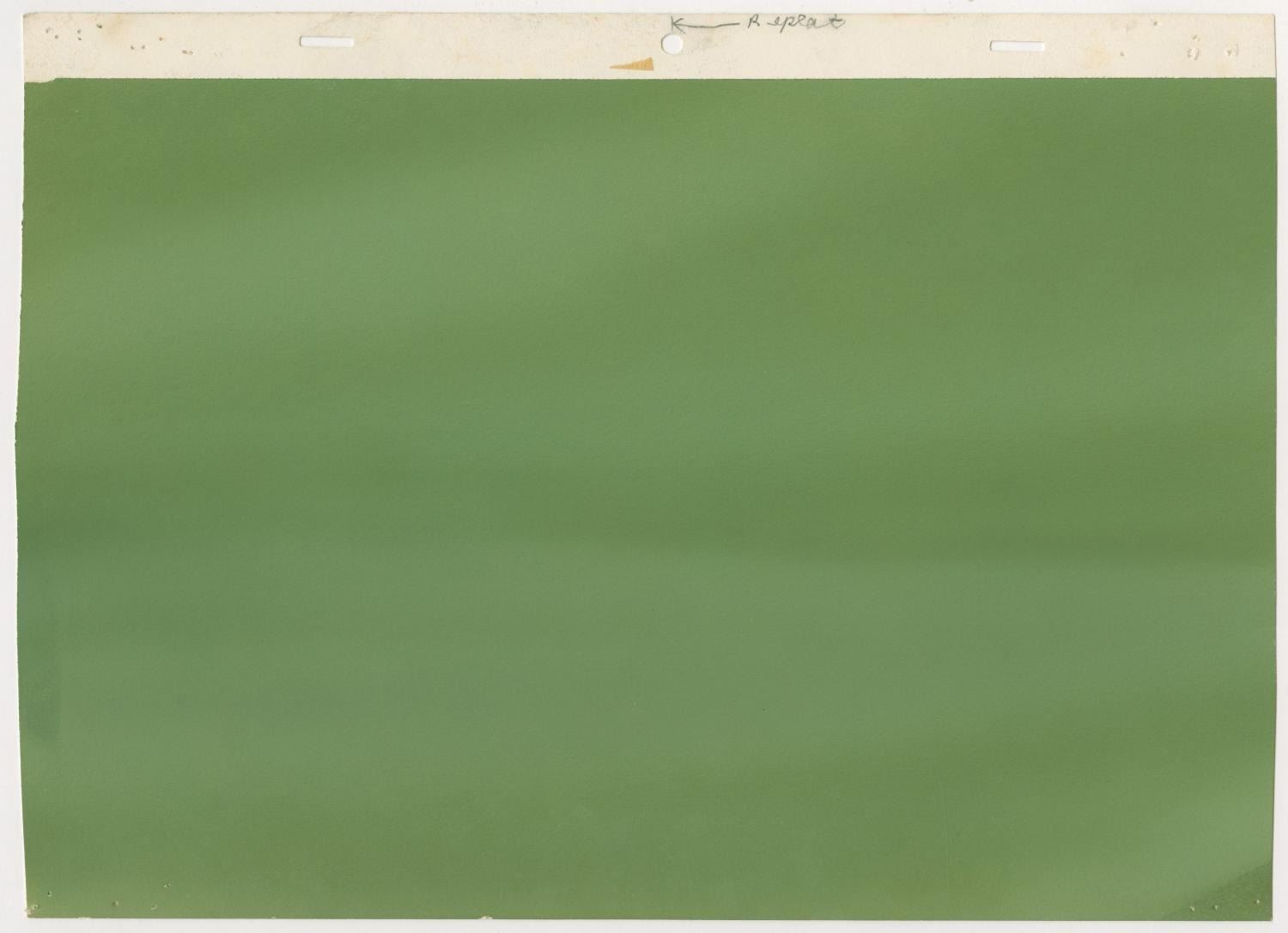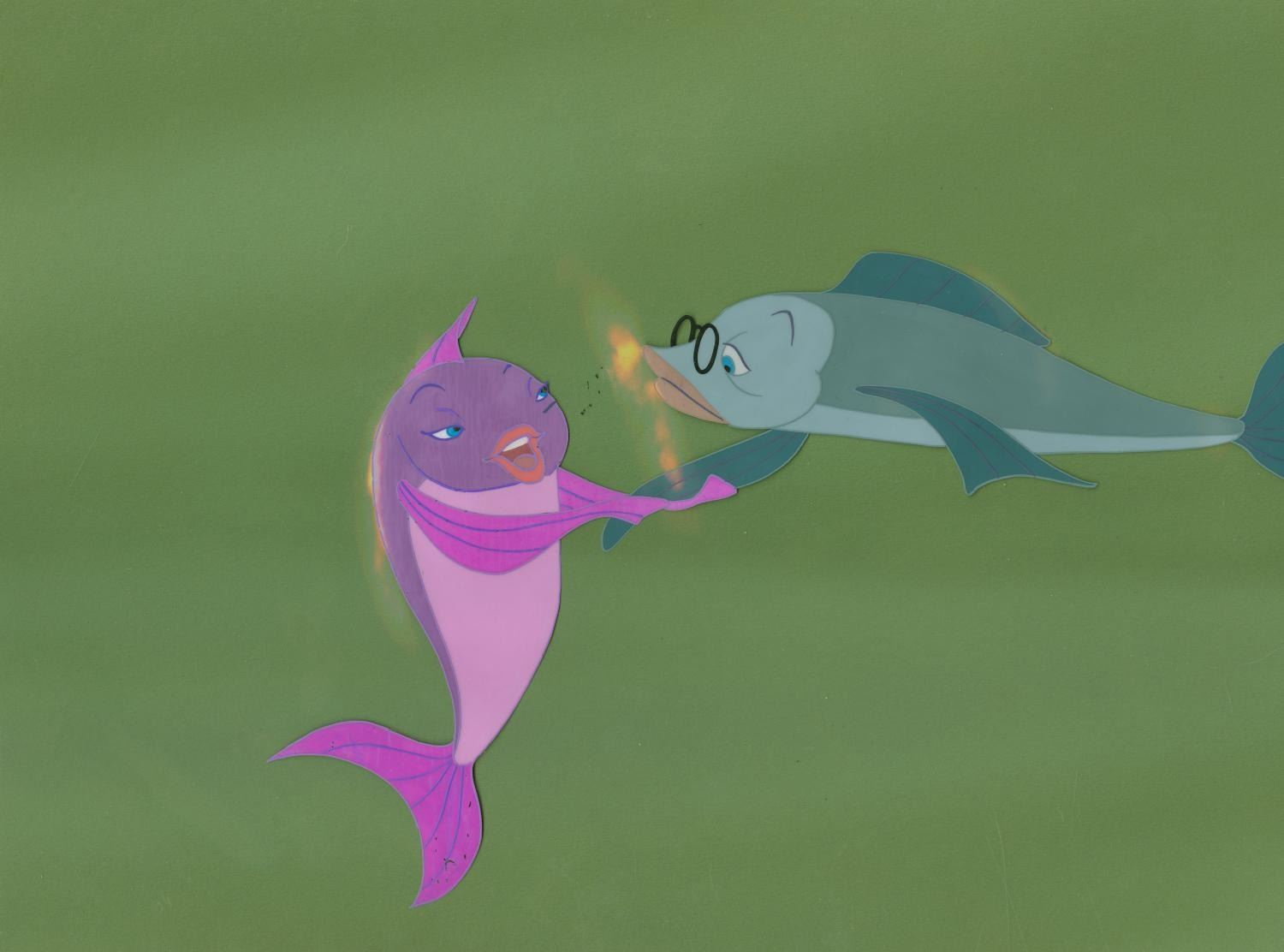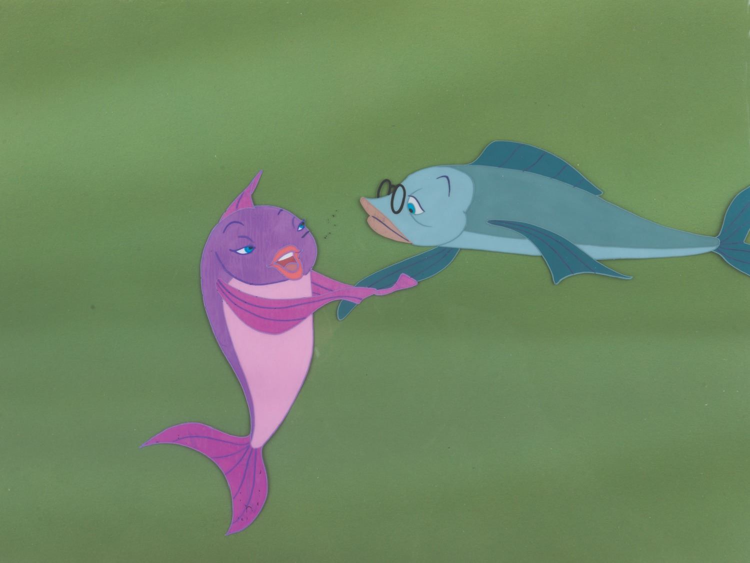 (Warner Bros., 1964) An original production cel of Mr. Limpet and Ladyfish with an original background painting from “The Incredible Mr. Limpet.” Mr. Limpet and Ladyfish have an image size of 6.5” x 9.75” on a 10.5” x 12.5” cel. The trimmed background painting measures 10.5” x 14.75”. The hand-painted cel is in good condition with light scratches, wear, and spots of paint loss. The background is in very good condition with discoloration at the bottom right corner and pinholes from production use.