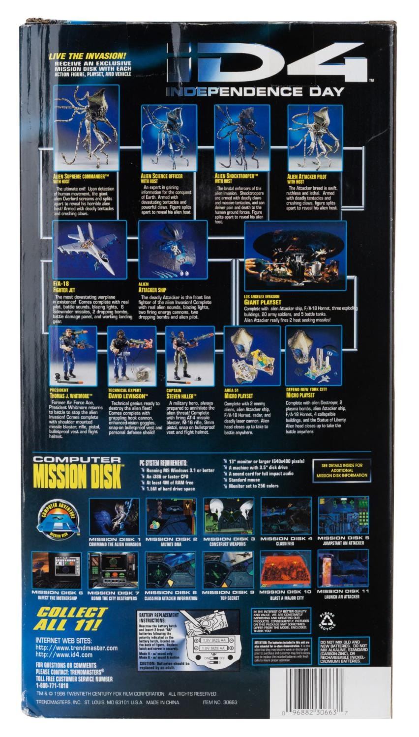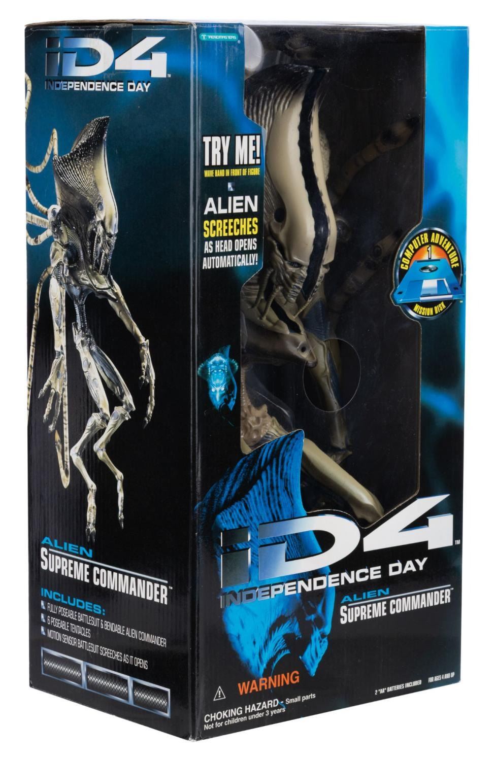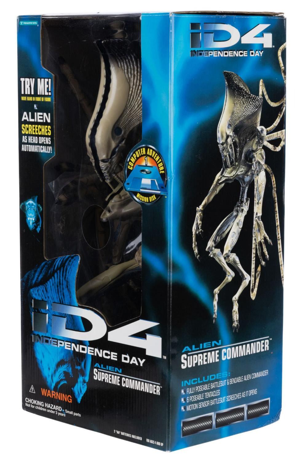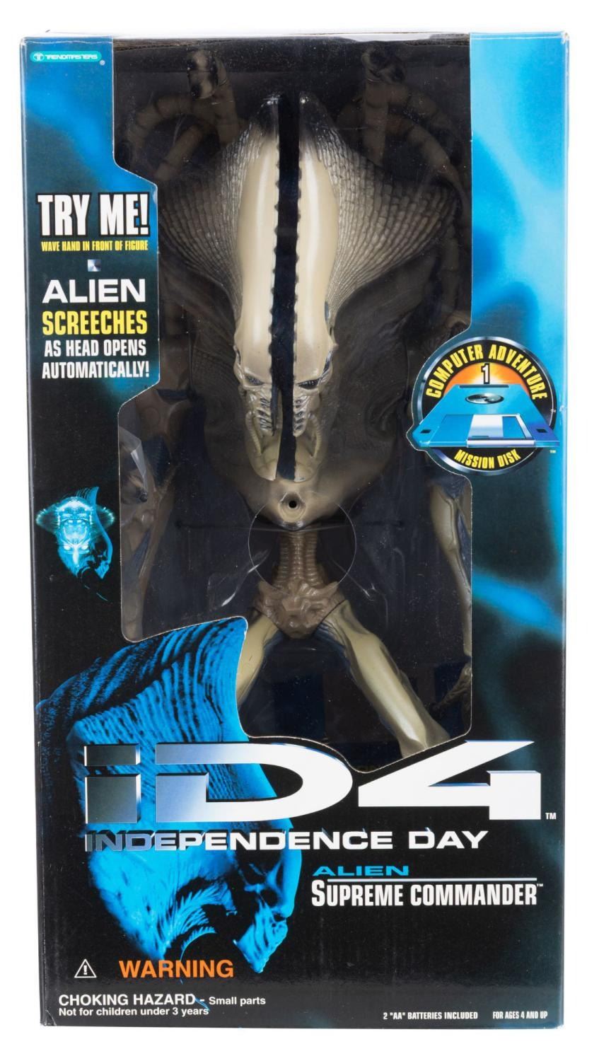 (Trendmasters, 1996) An Alien Supreme Commander action figure from "Independence Day" featuring poseable tentacles, a motion-sensor battlesuit, and a hard disk computer game. Measuring 8" x 6" x 15" in its original box, the action figure is in very good condition with light wear from storage.