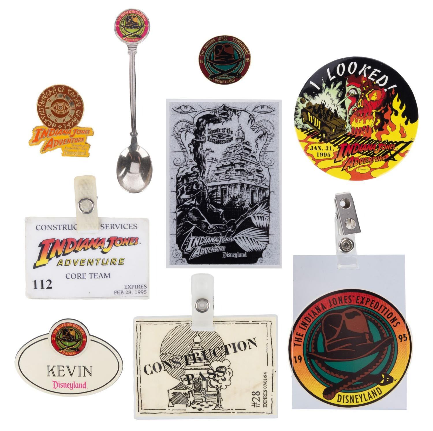 (Disneyland, 1994-1995) A collection of Indiana Jones Adventure: Temple of the Forbidden Eye Cast Member exclusives, including two pins, a large button, a spoon, a “Kevin” nametag, a sticker, two Construction Services badges, and an alphabet of Mara decoder card. Ranging in size from the 1.25” in diameter pin to the 4.5” long spoon, the items are in good to very good condition with light scratches, stains, scuffs, and discoloration from age.