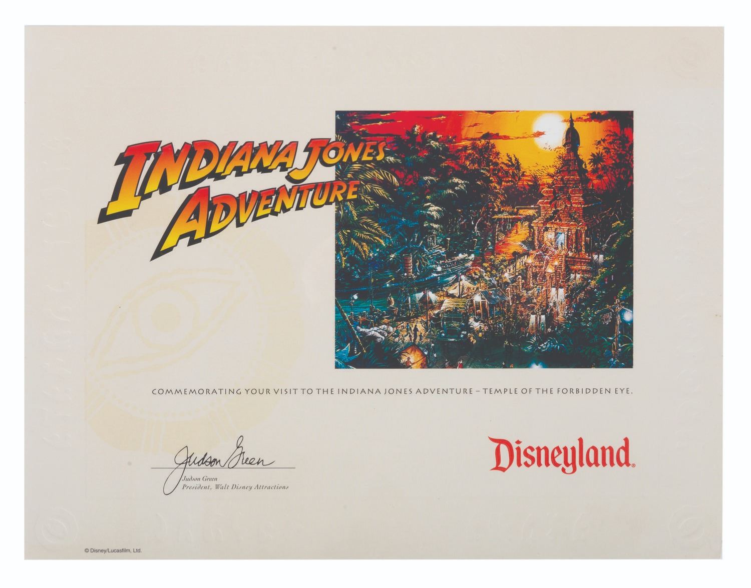 (Disneyland, 1995) An Indiana Jones Adventure Certificate commemorating a Guest’s visit to the opening of the attraction at Disneyland. The certificate features a colorful concept image and a facsimile signature of former Walt Disney Attractions President Judson Green. Measuring 11” x 8.5”, the certificate is in very good used condition with a slight curve from storage.