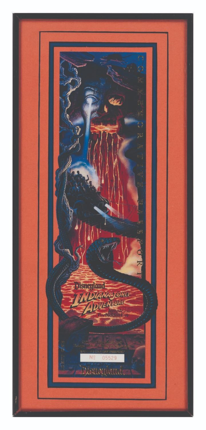 (Disneyland, 1995) An unused framed Disneyland one-day passport for Indiana Jones Adventure: Temple of the Forbidden Eye. This ticket was created for members of the project team and their families to test the ride and is numbered 05529. Measuring 5” x 14.75” in an impressive 8.25” x 18.25” custom frame, the passport is in fine condition, while the frame exhibits scratches and scuffs from storage.