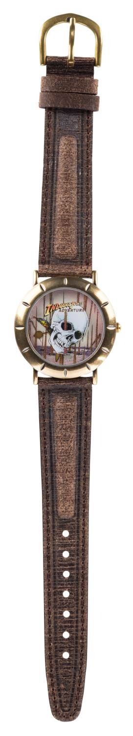 (Disneyland, 1990s) An Indiana Jones Adventure mug, snake pen, and a leather-strap wristwatch made exclusively for Disney Parks. Ranging in size from the 3.25” in diameter mug to the 9.25” watch with a 1.25” in diameter face, the lot is in very good to fine condition with light sticker residue on the snake pen.