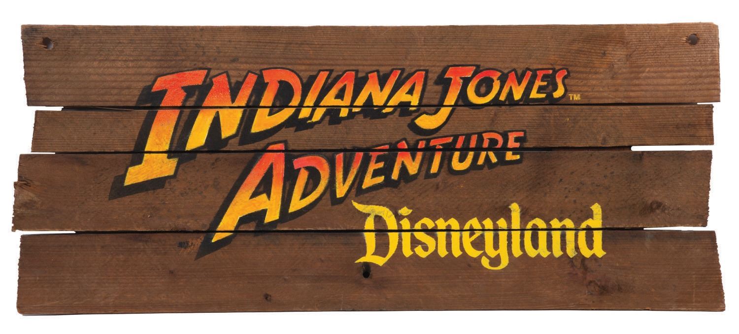(Disneyland, 1995) A hand painted wooden sign for the Indiana Jones Adventure at Disneyland. Measuring approximately 30"x12.5", the sign is in fine condition, with slight wear to the paint on "Disneyland."